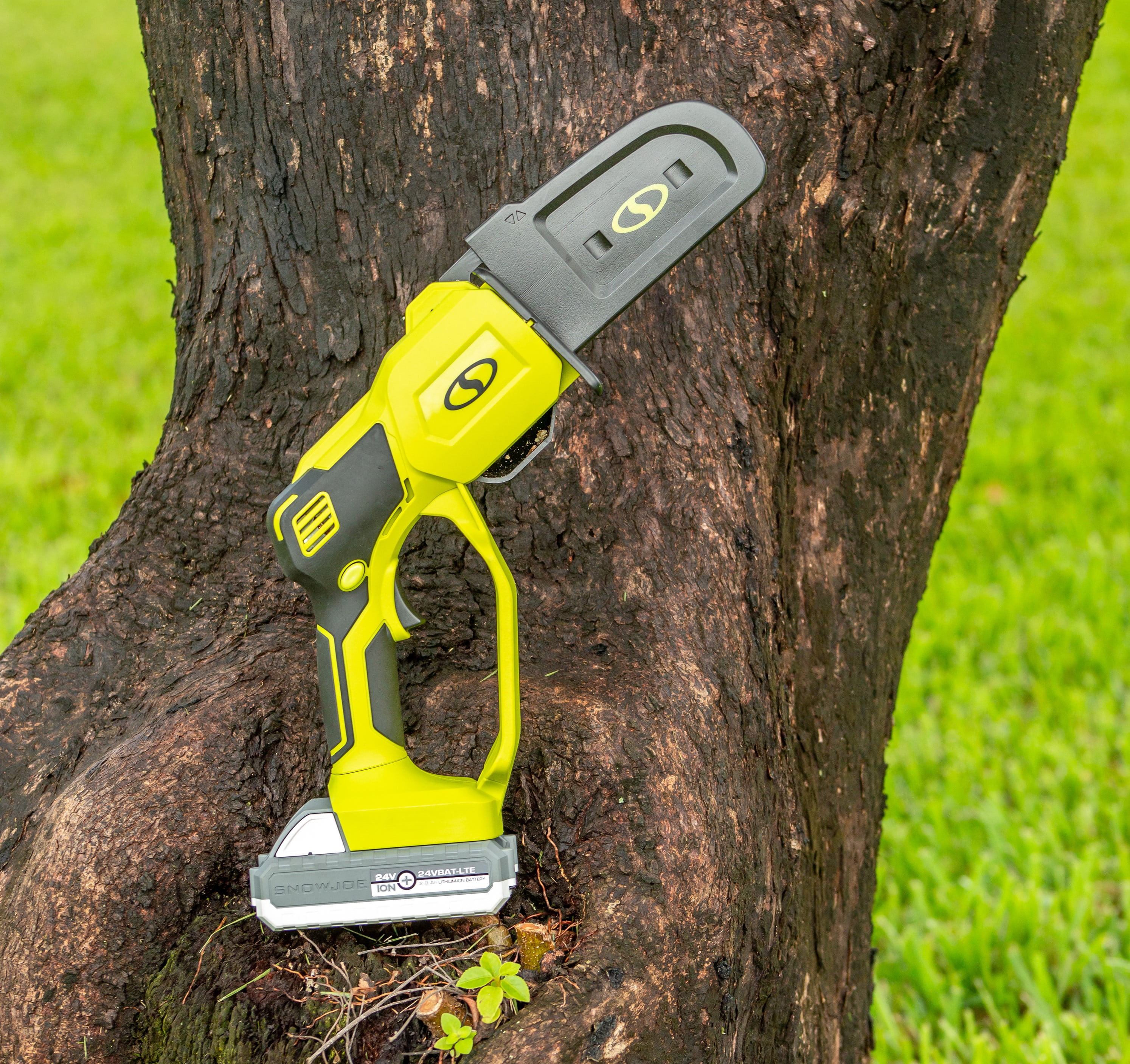 SEE IT? SAW IT! Trim overgrown branches with the 24V Cordless Handled Pruning Saw from SUN JOE®. Powered by the exclusive 24V IONMAX System, the included 24-volt lithium-ion battery provides up to 25 minutes of continuous runtime! Now you can shape up the shrubs without the strain! Ultra-compact and lightweight, this 5″ pruning saw slices through branches, thatch, and topiaries up to 4.5″ thick. The easy, one-handed operation makes it easier than ever to trim, saw, cut, and prune even the most unruly of plants! Ideal for green wood, woody stems, twigs and branches, Sun Joe provides a clean, precise cut to allow your plant to heal, while eliminating the stress and strain associated with squeezing conventional manual pruners. Cutting is as simple as squeezing the trigger! Plus, every Sun Joe IONMAX tool is backed by our rock-solid 2-year warranty, for worry-free operation, season after season. So, prune like a PRO and Go With Joe®! The 24V Cordless Handheld Pruning Saw from SUN JOE. GET EQUIPPED®.