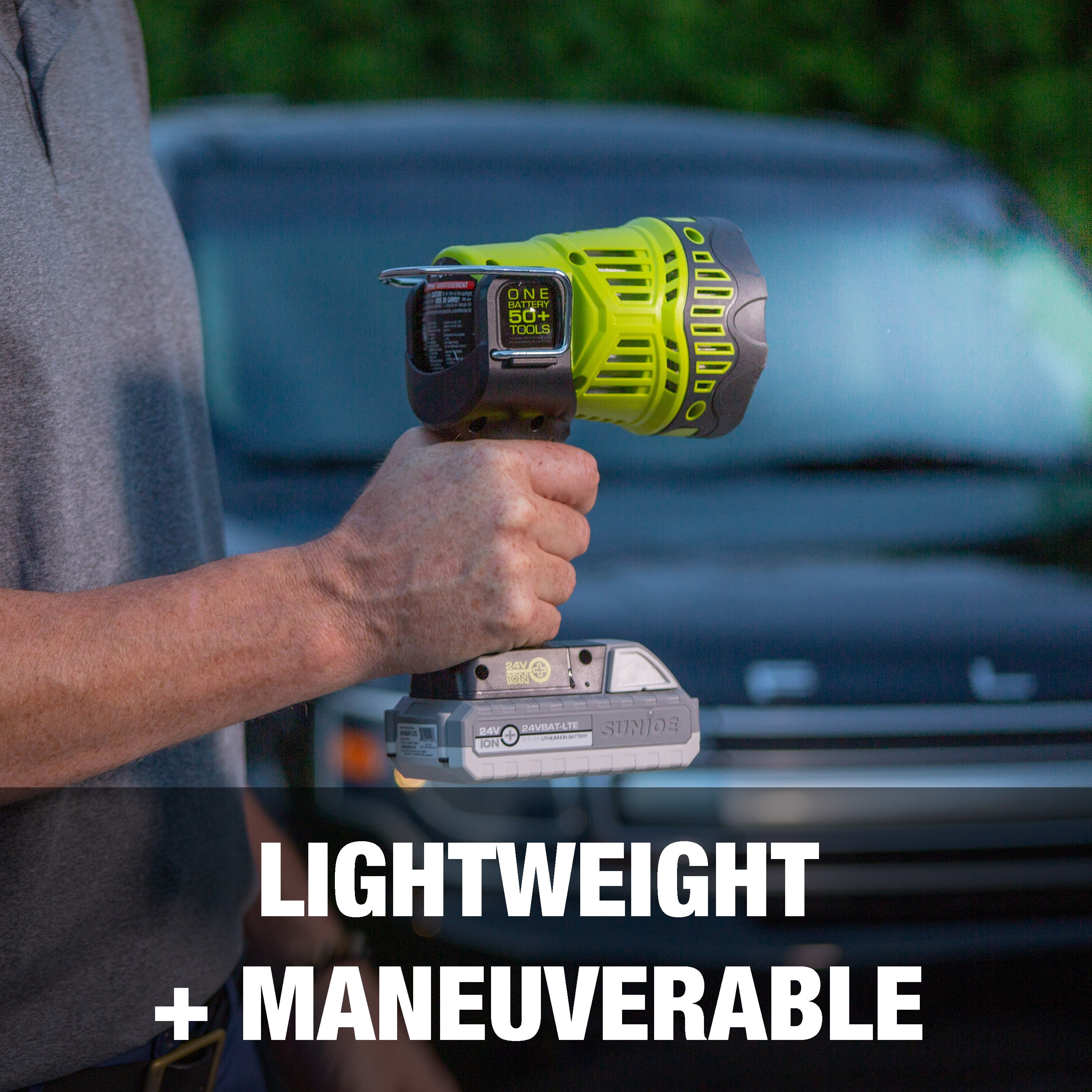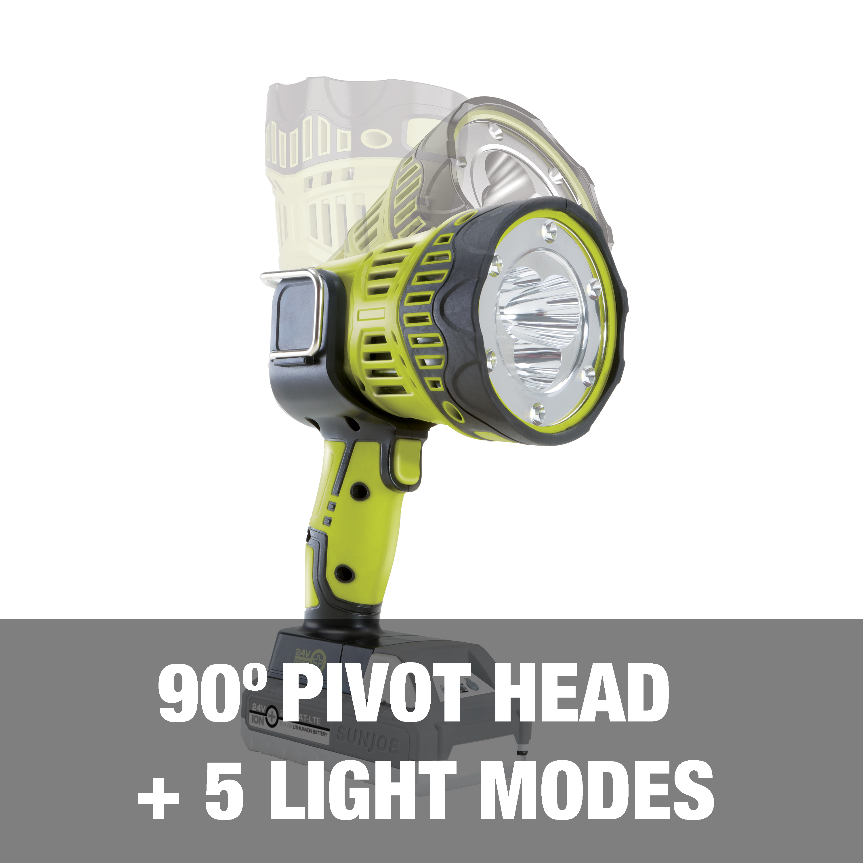 LET THERE BE LIGHT! If you’re stuck without power, trying to work in a dark, dreary basement or at the worksite or campsite at night – it’s time to turn on the 24V Cordless LED Handheld Spotlight from Sun Joe. Powered by the 24-Volt IONMAX system, the included 2.0 Ah battery provides rechargeable runtime — perfect for power outage situations! The selectable light modes provide 5 different settings to suit the task: Spotlight, for illuminating tight spaces | High Floodlight, for brightening up a darkened room | Spot + Floodlight, to light up the darkest spaces | Warning, to signal for help | Low Floodlight, for a soft glow. With up to 1500 lumens max of power, Sun Joe casts light up to 700 yards away for max visibility when you need it most. Need a light straight ahead, at an angle, or straight up? Sun Joe’s got you covered! The adjustable multi-angle head shines right where you want it, and only where you need it. And the onboard easy-access hook + kickstand makes it easy to go hands-free and set up anywhere you need a little light. So, when you’re in the dark, Go With Joe®! The 24-Volt Cordless LED Handheld Spotlight from Sun Joe®. GET EQUIPPED®.