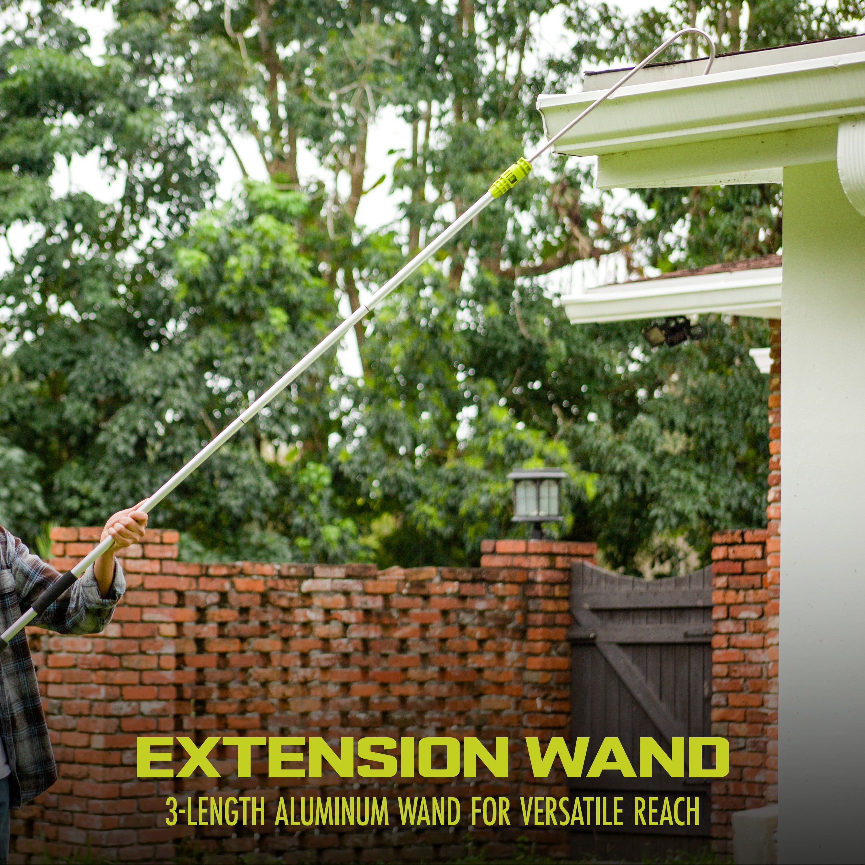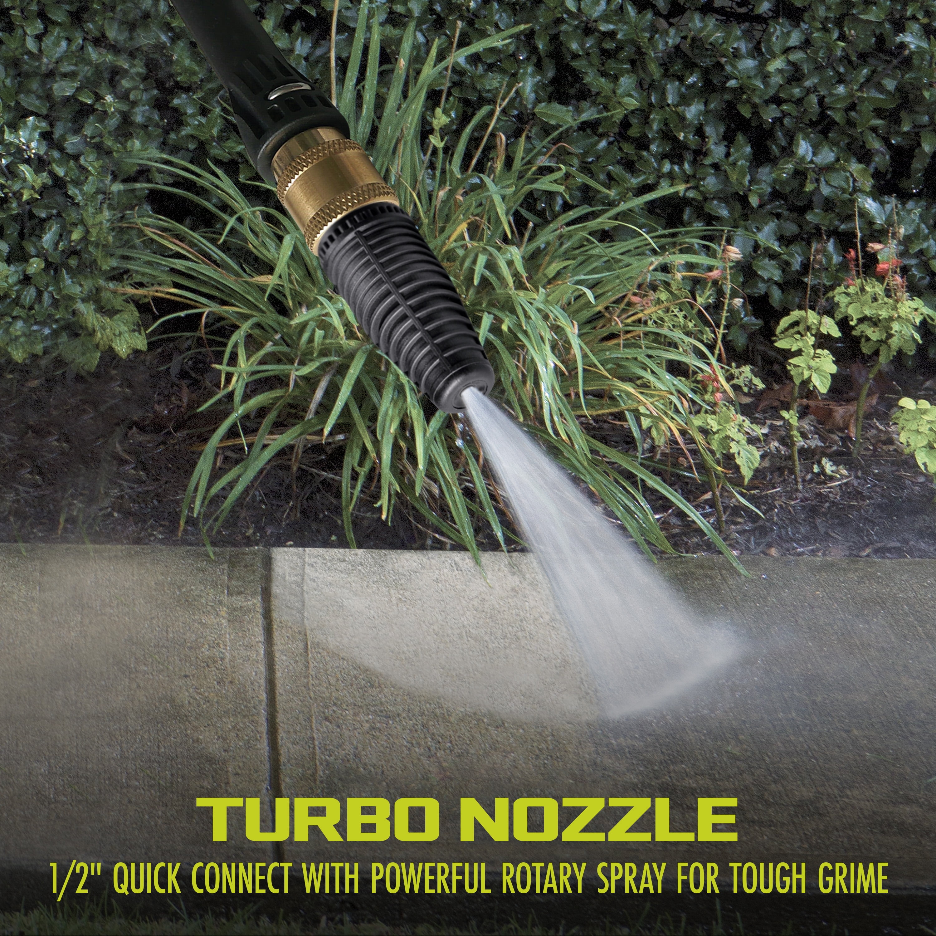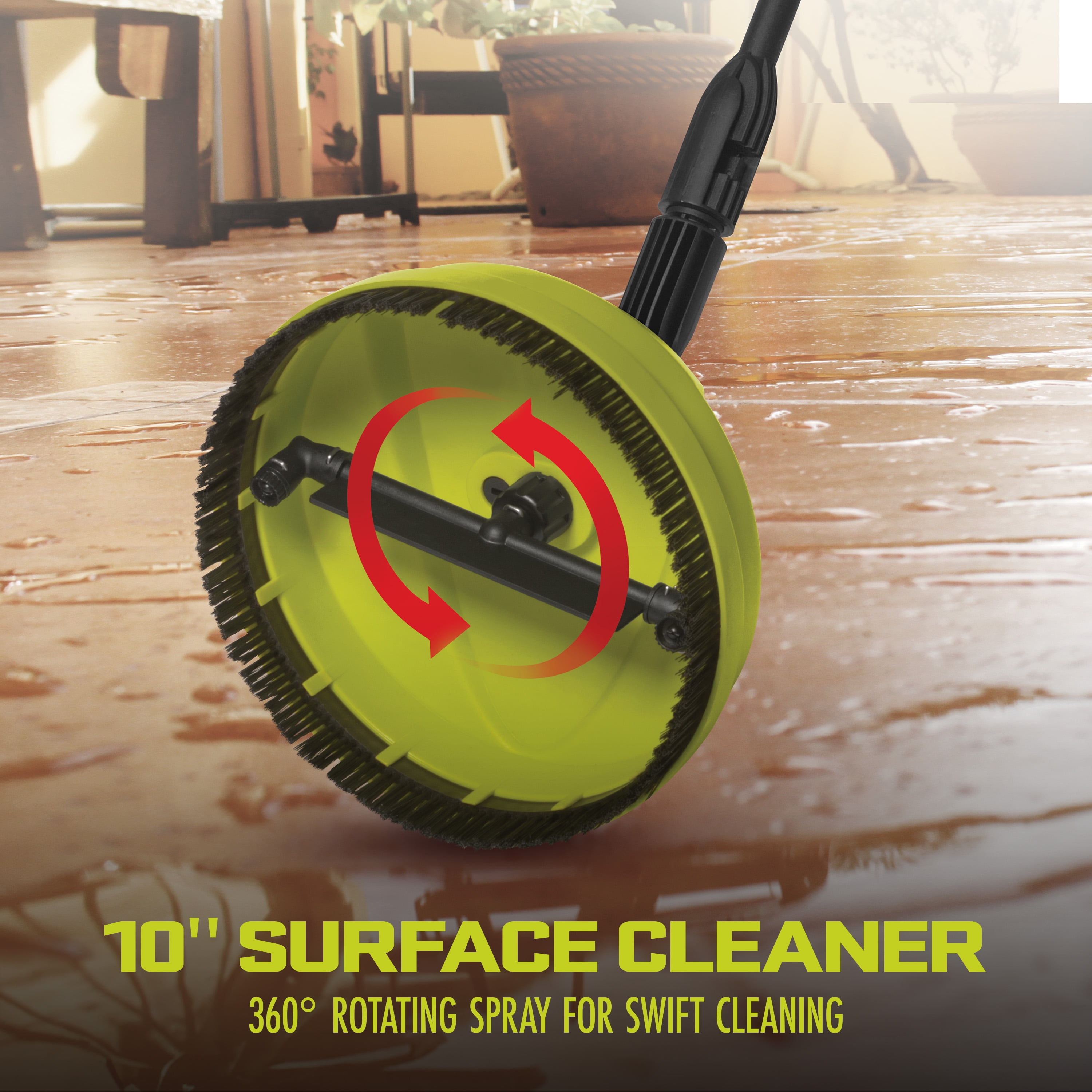 Rotating Surface Cleaner with a 10-inch brush diameter and 360-degree spin spray technology for efficient cleaning of patios, pavers, and walkways Splash Guard Brush with an 8.25-inch length and a splash guard head to prevent kick-back spray while scrubbing away stubborn stains Gutter Cleaning Attachment with a 315-degree curve and 15-degree spray to rinse away pine needles, twigs, leaves, and other debris from downspouts Turbo Nozzle with a 1/2-inch quick connect fitting and a powerful rotary spray to blast away caked-on grime Aluminum Extension Wand with 3-length options (3 ft, 4.3 ft, 5.5 ft) for easy access to second-story windows, shutters, and more