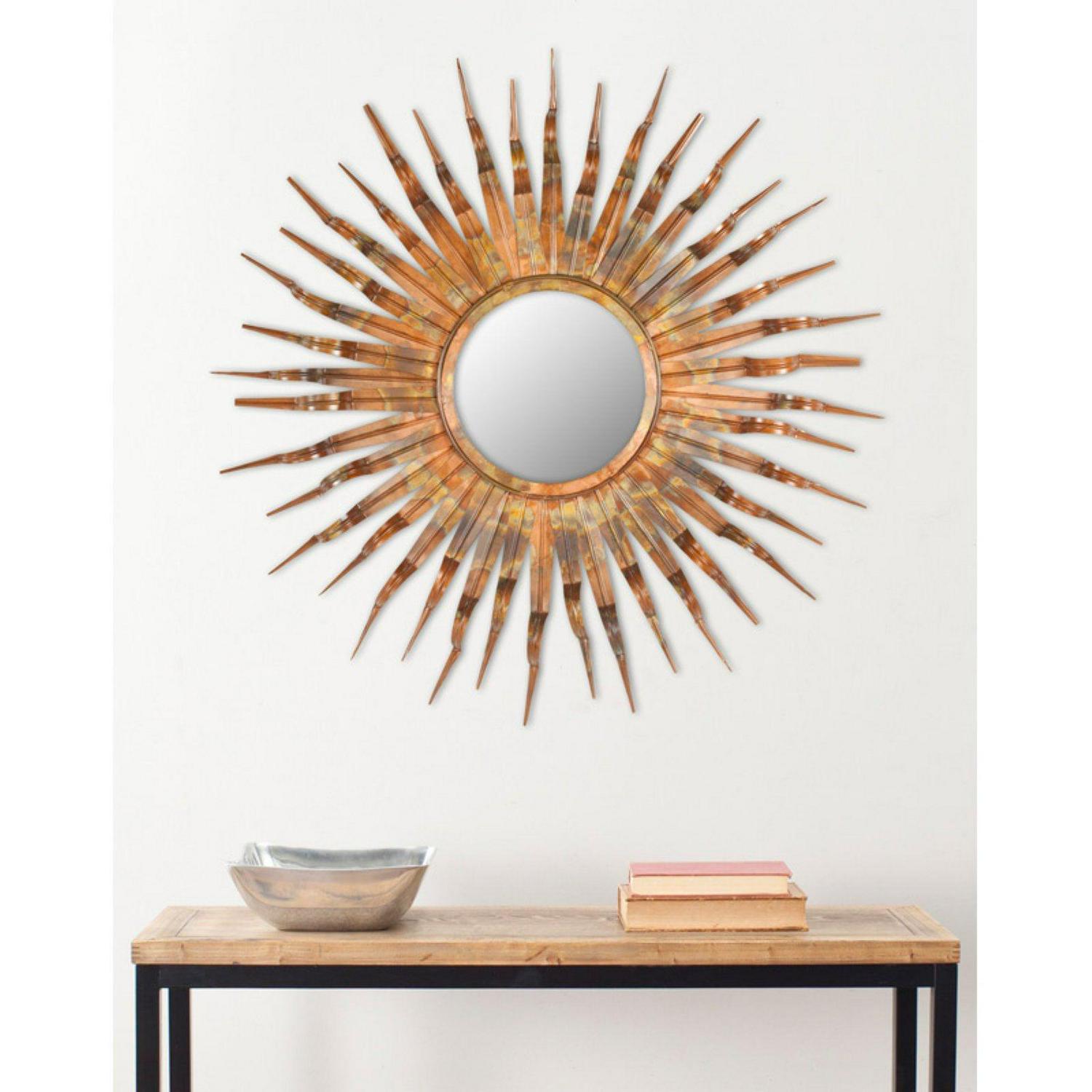 Tones of vibrant coppers, bronzes and golds infuse the Sun Mirror with a lively energy. The carefully wrought iron rays, some with angled tips, of this 37-inch wide mirror add yet aNther layer of dimension to this dramatic statement piece.