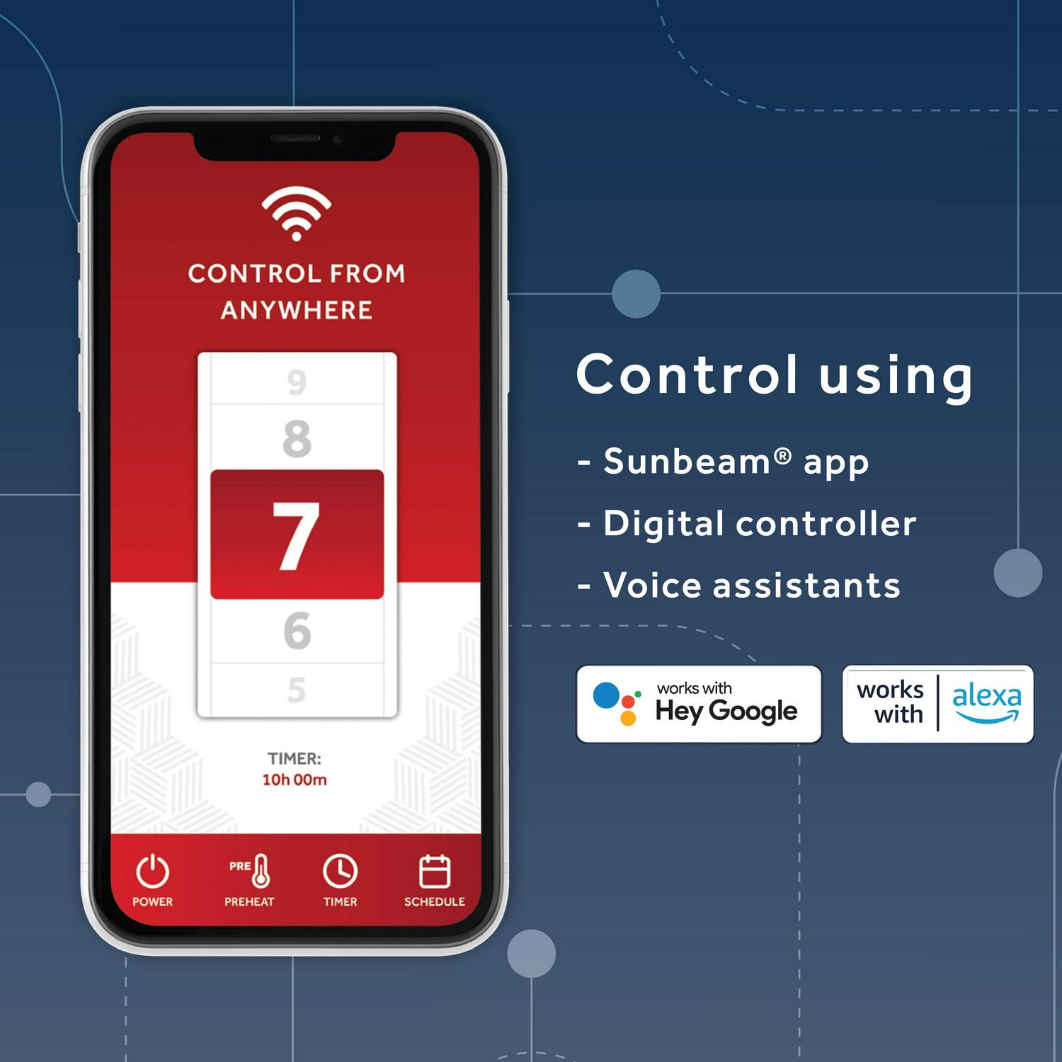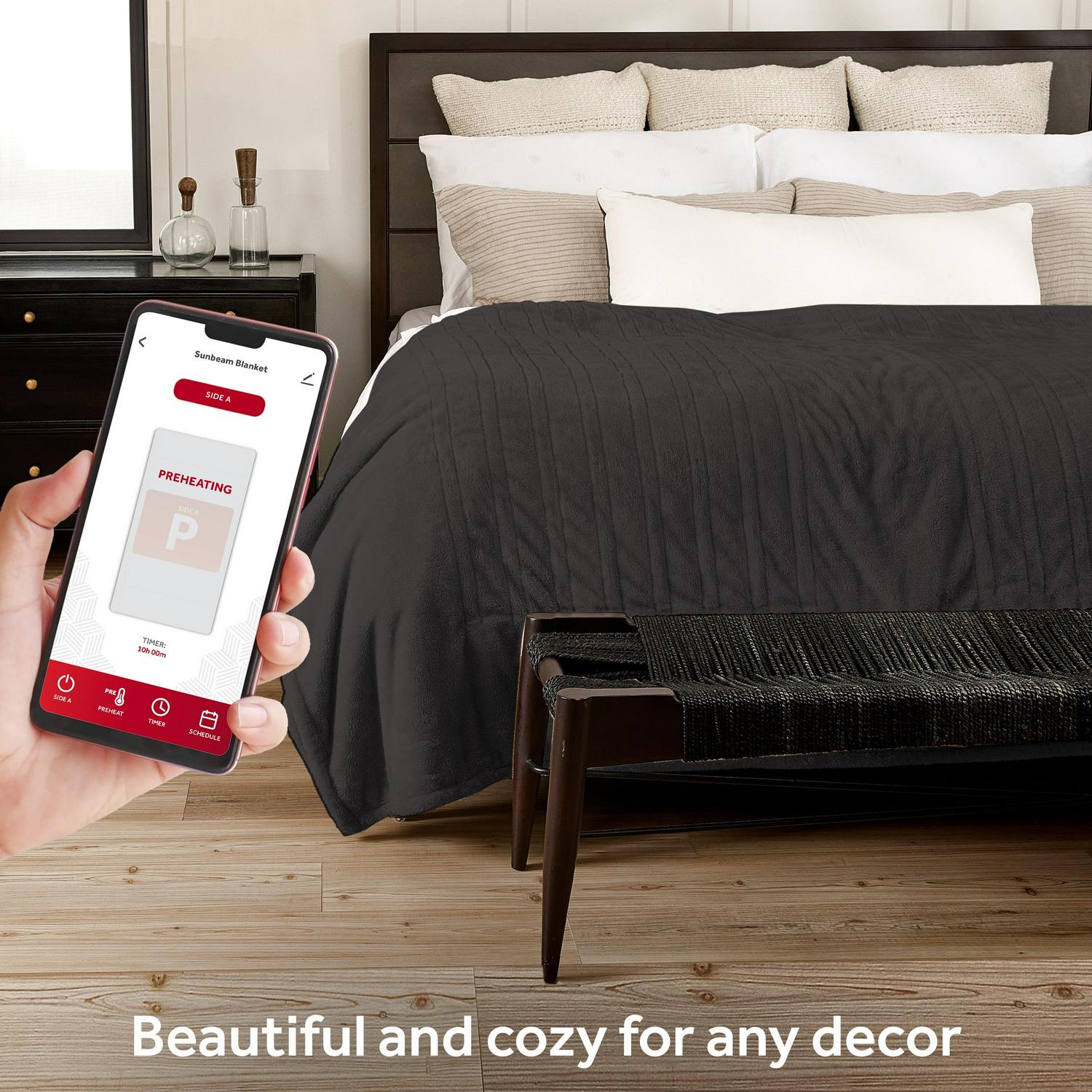 – Preheat cold sheets from smart phone using the Sunbeam App, voice assistants or wired digital controller