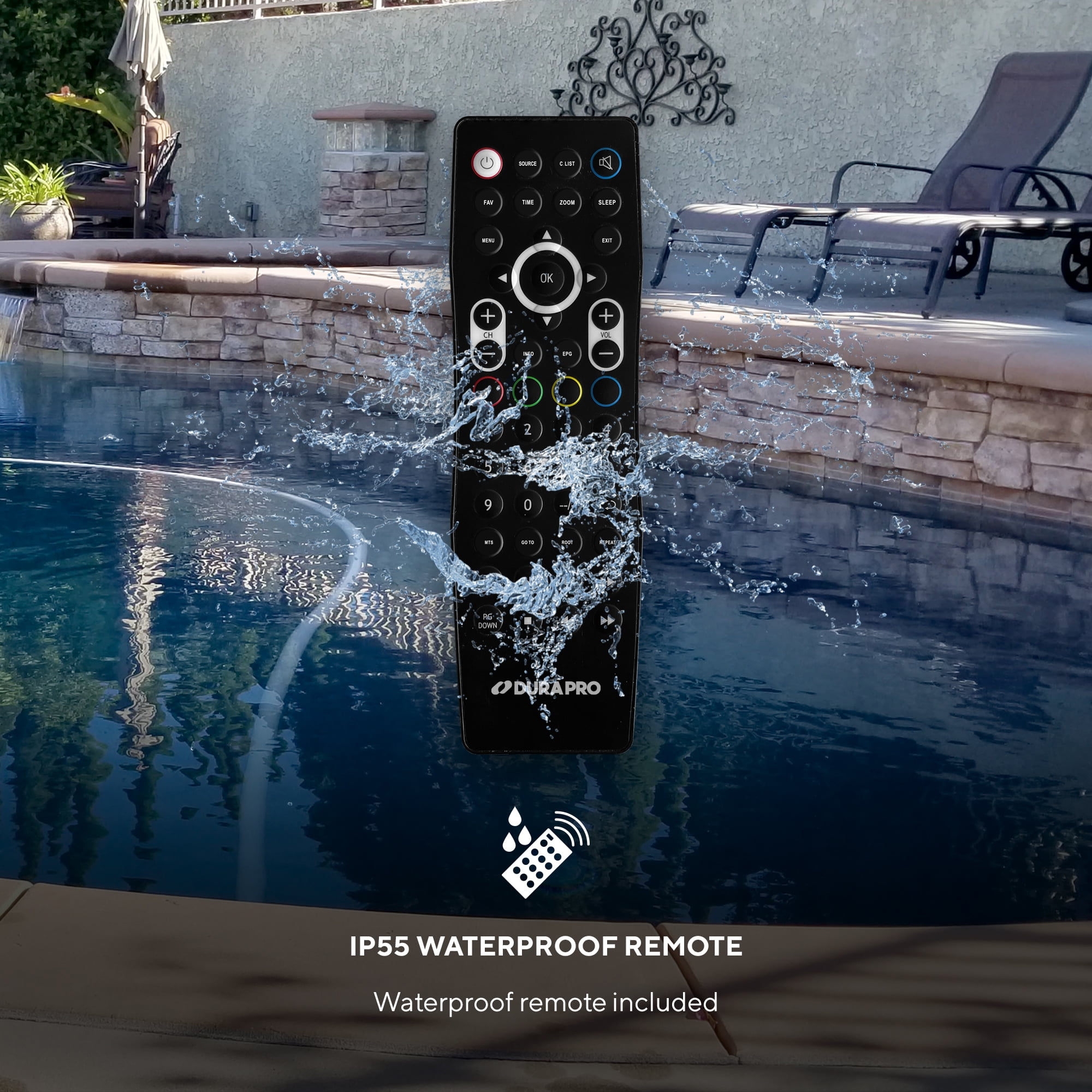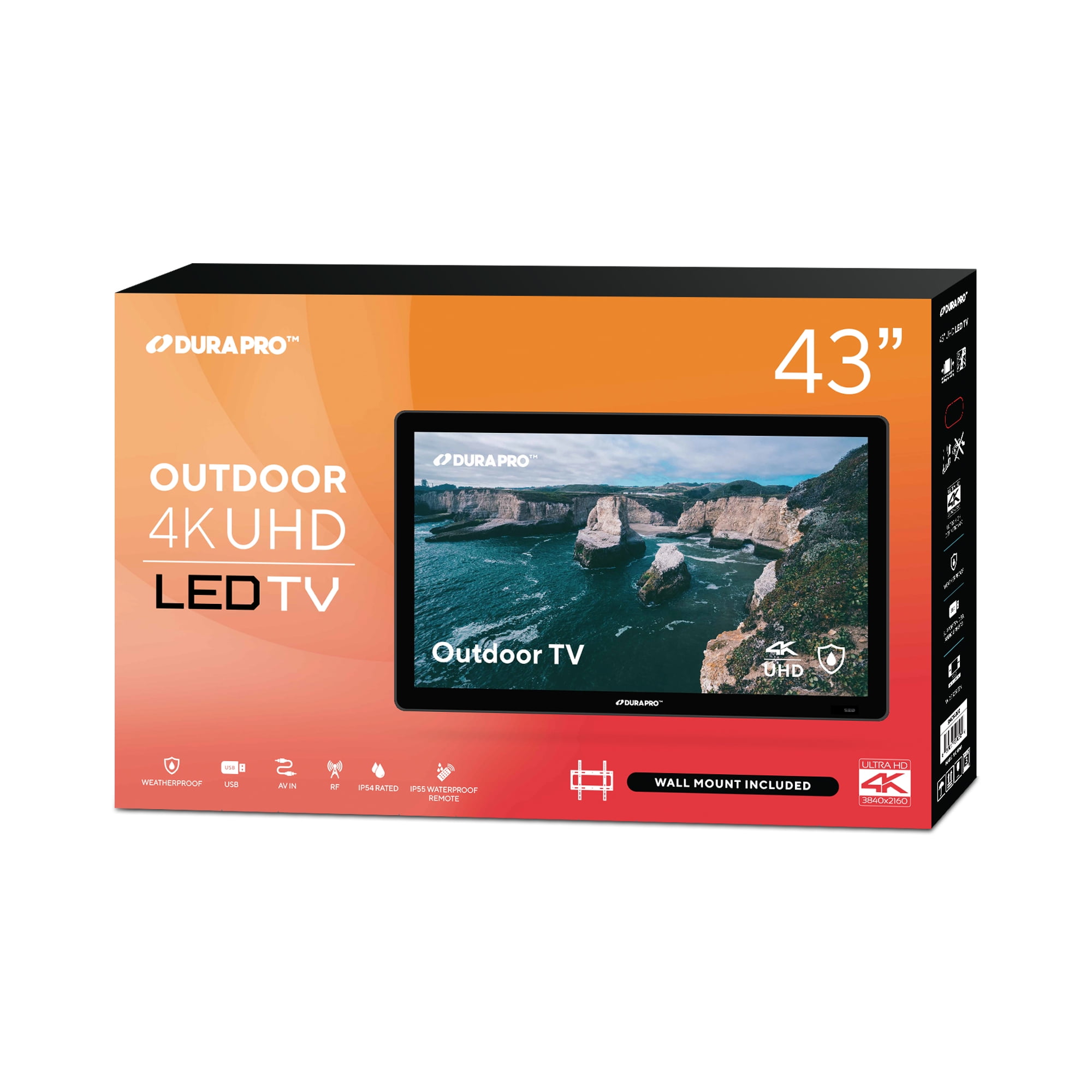Experience crisp, detailed visuals and upgrade your backyard entertainment setup with the 43-inch DuraPro outdoor partial shade UHD LED TV. This TV features a beautiful 4K display with HDR and 500-nit brightness for a clearer immersive experience that’s up to 60% brighter than indoor TVs. Ideal for partially shaded outdoor living areas, such as covered patios and gazebos, the rugged, weatherproof IP54-rated exterior and tempered glass screen provide extra protection against rain, dust, UV rays and more. Includes an IP55 waterproof remote and compatible TV wall mount for the ultimate streamlined living space design.