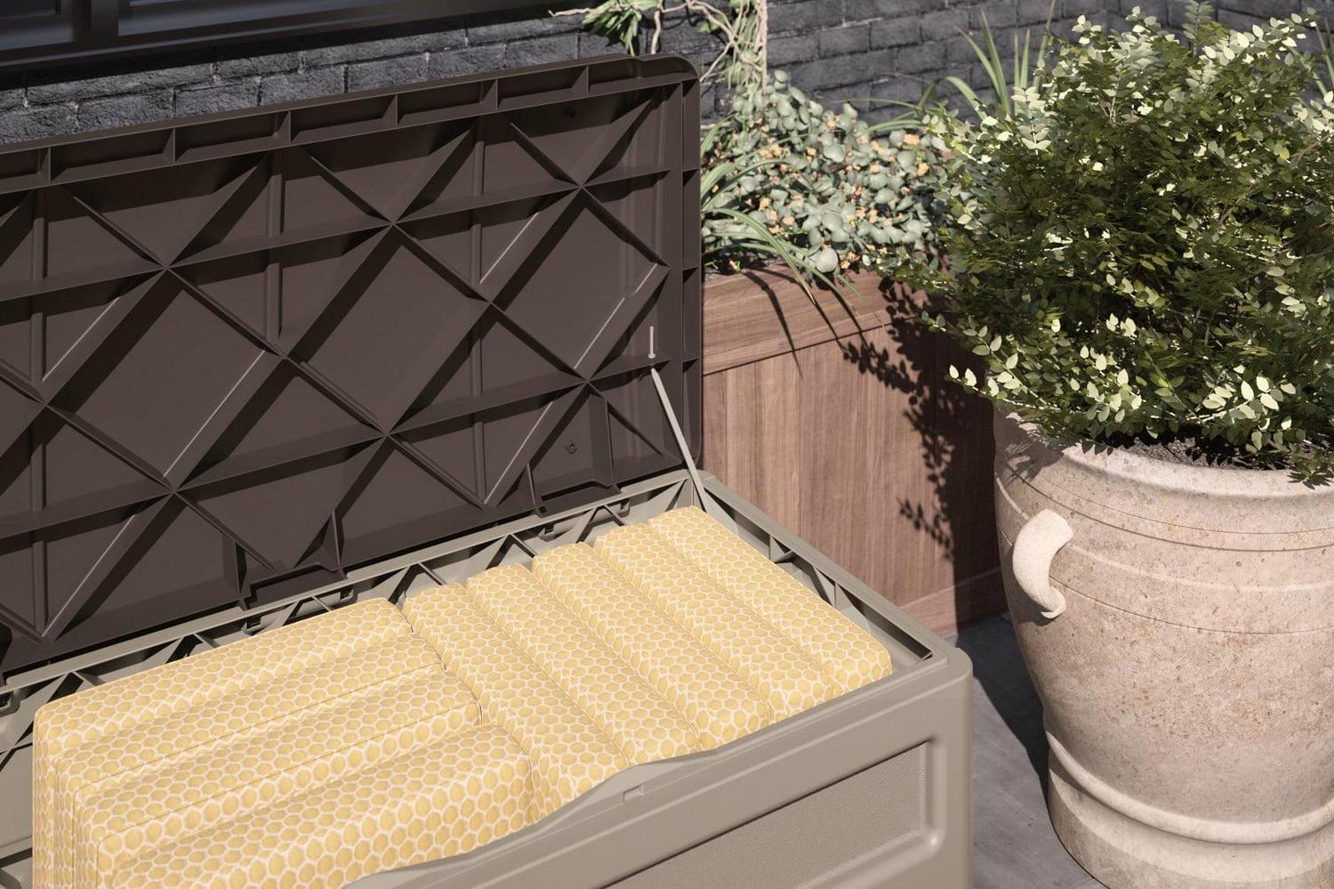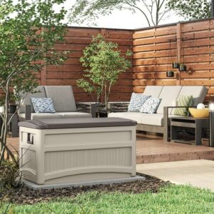 The Suncast 73 Gallon Deck Box, Light Taupe is designed for style and utility. Offering 73 gal of spacious storage, it can store all your essential outdoor gear and supplies, such as furniture cushions and other outdoor accessories. The wheels and side handles are provided for easy transportation. Best of all, it features weather-resistant resin construction. The solution you need is always close at hand with the Suncast 73 Gallon Deck Box, Light Taupe.