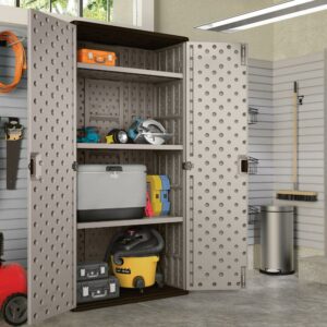 – Tall storage cabinet perfect for storing toys, sporting equipment, tools, lawn care equipment, garden accessories, and more