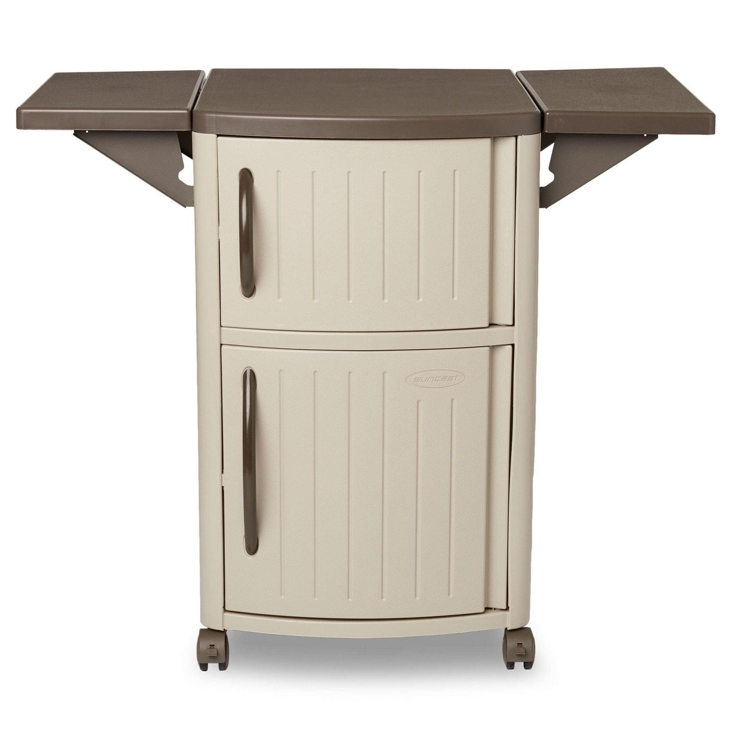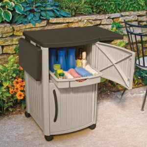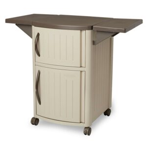 Time to grill but don’t have enough space to set everything nearby Forget running back and forth into the house and simply open up the Portable Outdoor Patio Serving Station Table and Cabinet. Serve up the good times with the Suncast Serving Station Patio Cabinet. The classic design makes a great addition to your yard, deck or patio and comes in handy for all outdoor entertaining and cooking purposes. Great for entertaining and dining al fresco. This Suncast serving station patio cabinet has a lot of space for organizing salad, drinks, napkins, condiments and other supplies required for meal preparation. It is constructed of plastic which is low maintenance and resists rust and fading from the outdoor elements. This versatile meal prep cabinet provides 40 inches of counter space with convenient drop leaf extensions for serving. The easy-gliding casters make this serving station highly portable, and the 2-wheel lock for safety when you are using the cabinet for food preparations. Upper and lower cabinets provide space for storing grilling tools or serving supplies and the included removable tray is great for both organization and entertaining. This outdoor prep station is easy to assemble and requires no tools. In addition, the small footprint of this portable serving station takes up little space, just lower the drop-shelves and roll it away to store when the party has ended. When you need some extra space to place all your spices, mixing bowls, serving trays, and anything else you need to cook up a feast outdoors, look no further than the Portable Serving Prep Station from Suncast.