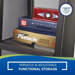 – 5-inch steel bin with 3 shelves let you store your golfing accessories