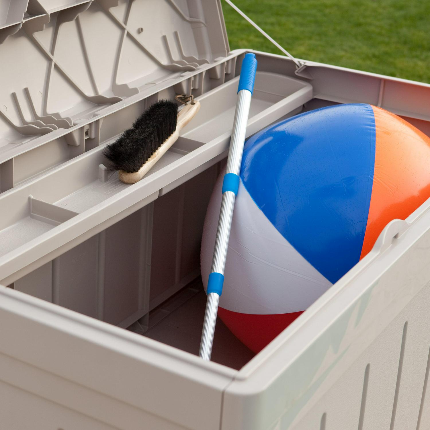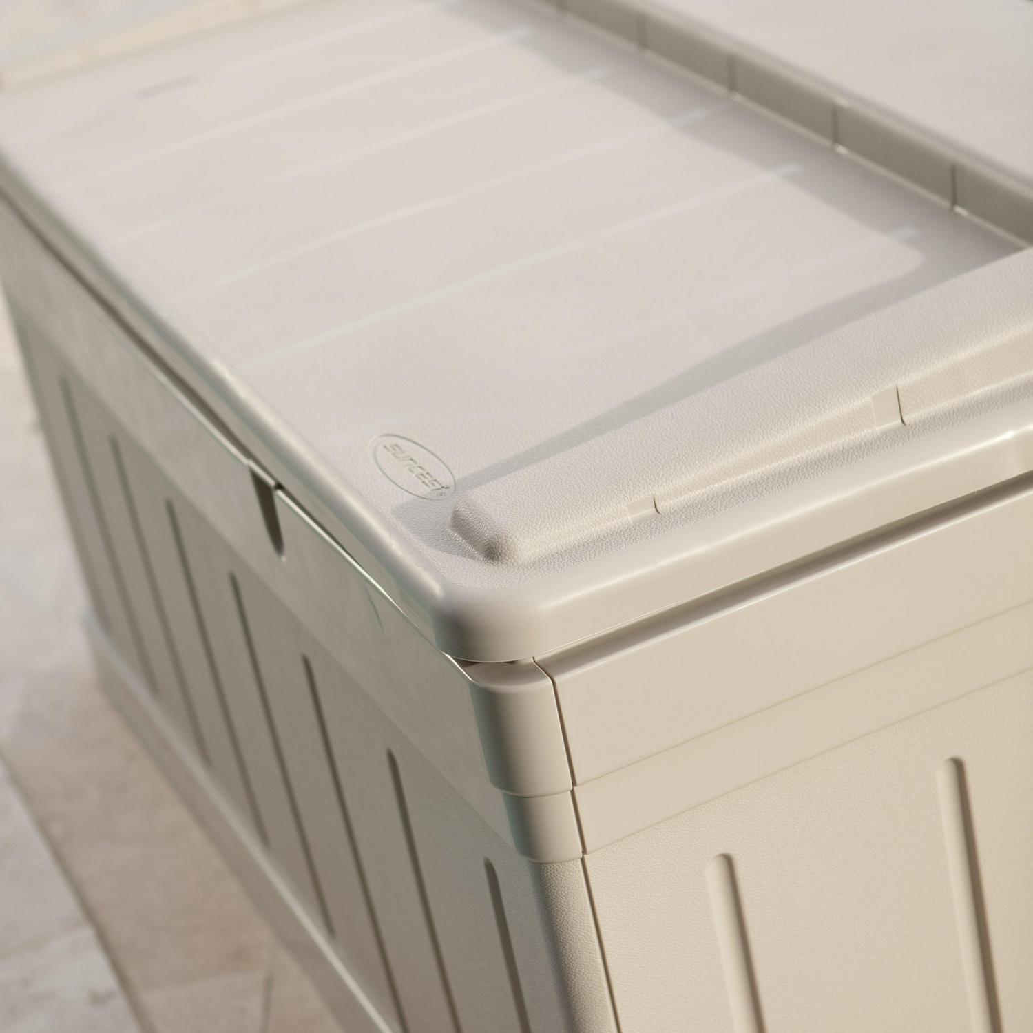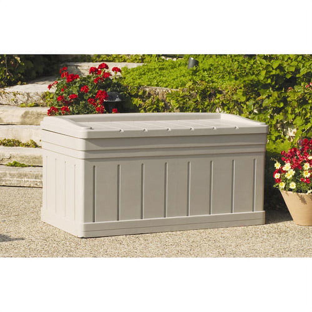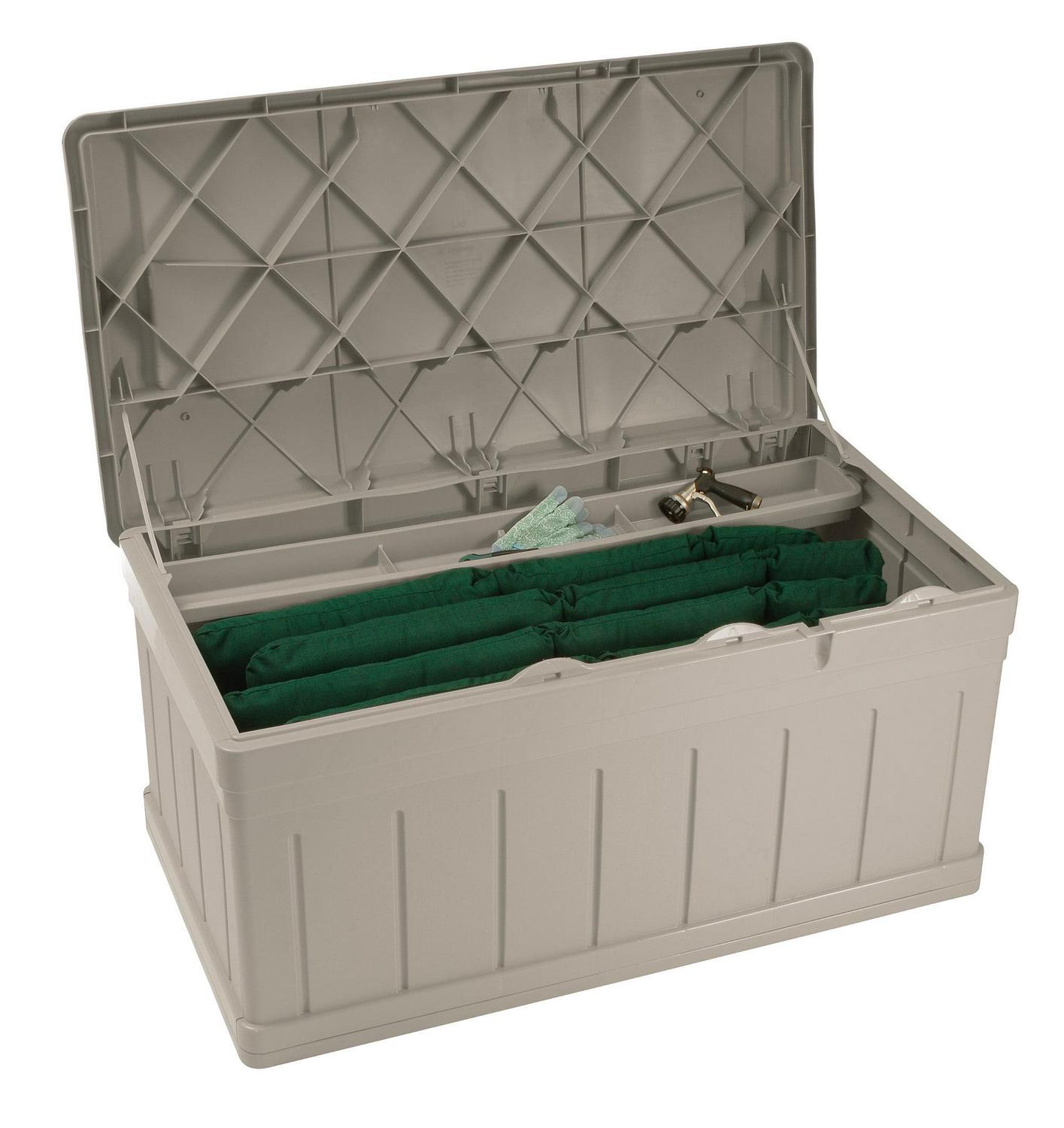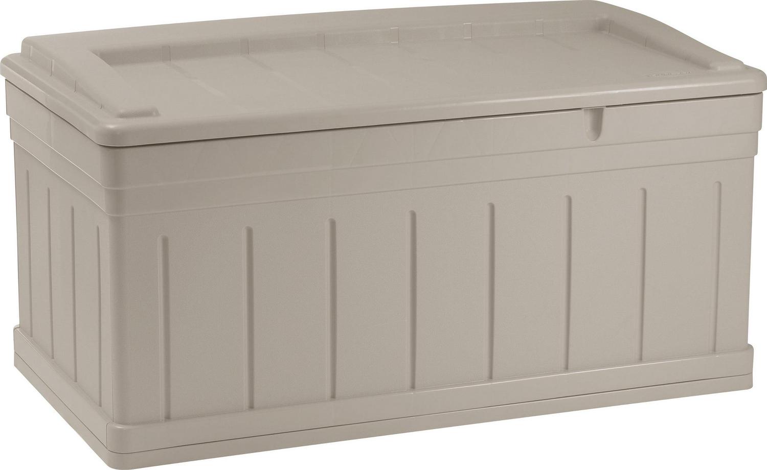 - Suncast Horizontal 129 Gallon Stay Dry Outdoor Deck Storage Box with Seat, Taupe