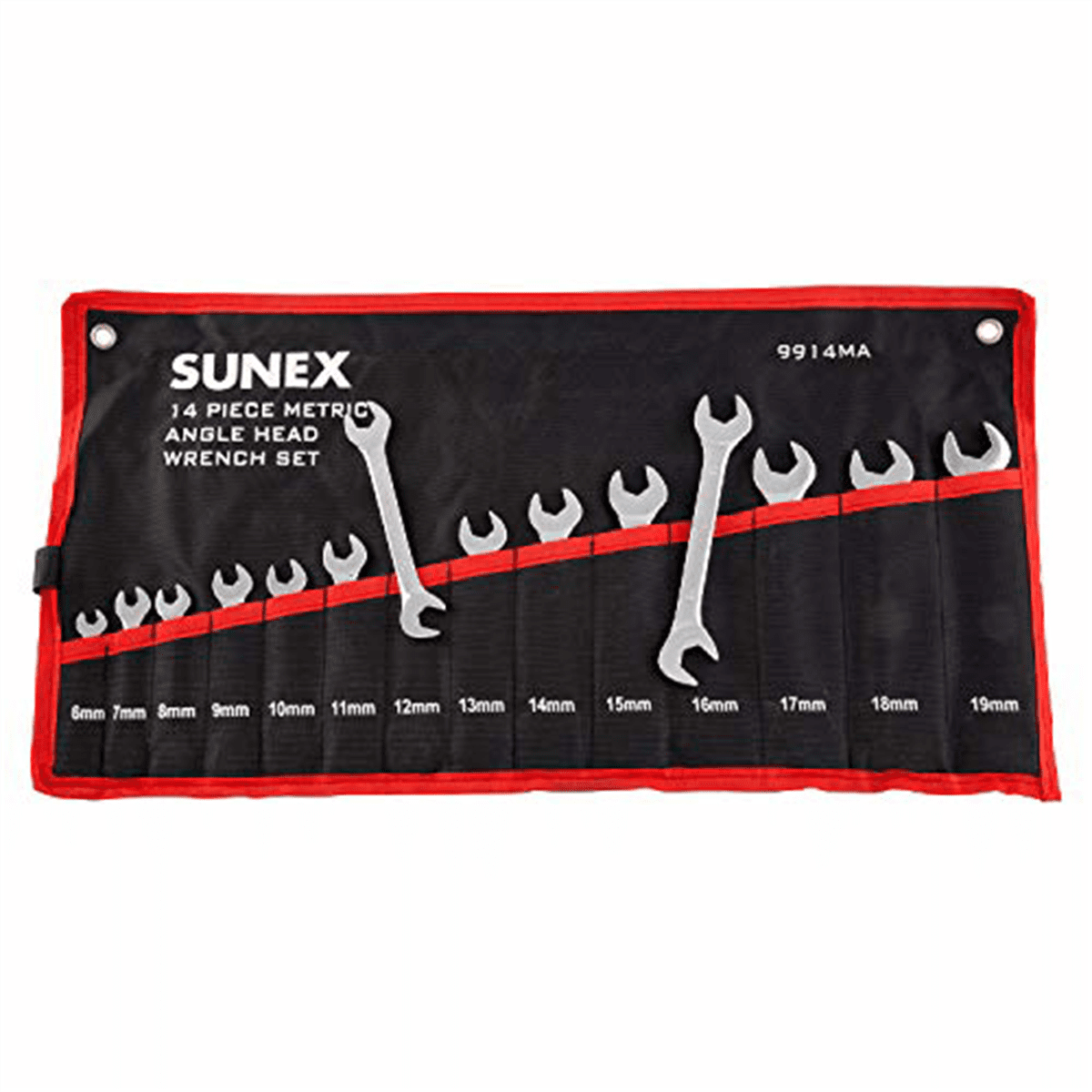 Features and Benefits: Chrome Vanadium and Chrome Plating Upgraded steel from High Carbon to Chrome Vanadium 30% more strength and durability Chrome plating to prevent rust, corrosion, and deformation Includes 14 Metric Angled Head Wrenches 6mm, 7mm, 8mm, 9mm, 10mm, 11mm, 12mm, 13mm, 14mm, 15mm, 16mm, 17mm, 18mm, and 19mm. The Sunex 9914 Fully Polished Metric Angle Head Wrench Set comes in sizes 6mm through 19mm. Each wrench has a 15-degrees angle on one end and a 60-degrees angle on the other end for greater access into tight work areas. All the wrenches are constructed from drop forged alloy steel and their sizes are stamped on both sides for fast and easy identification. This set comes in a heavy duty pouch for convenient transport and storage.