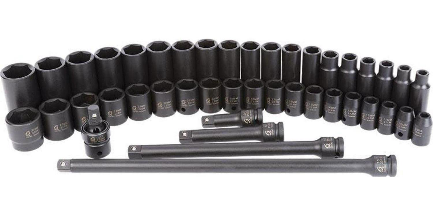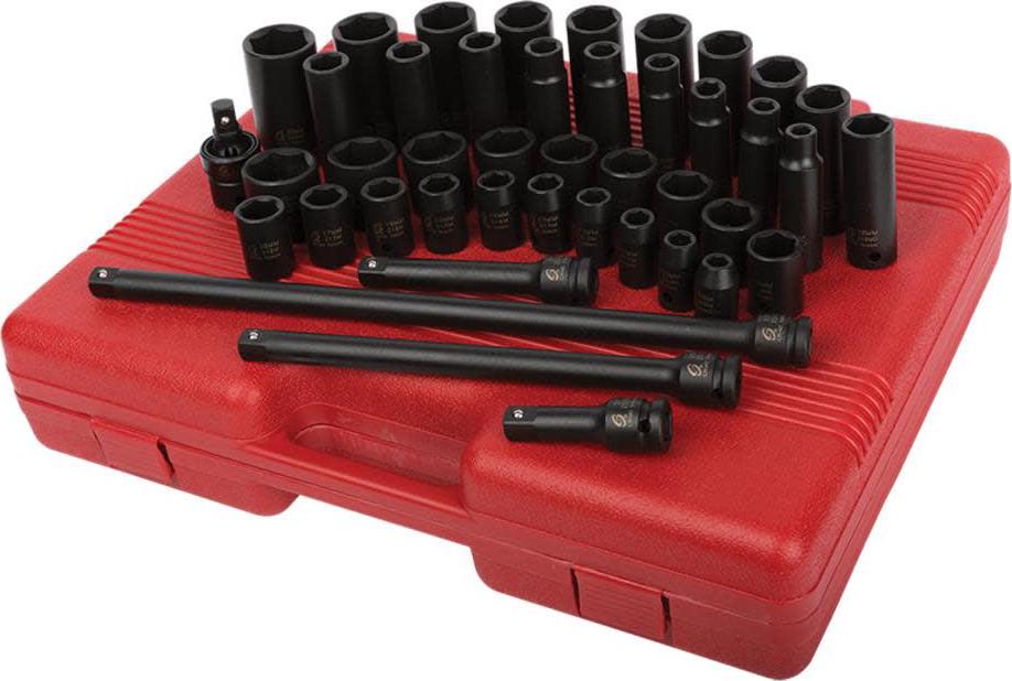 Loosen fasteners for disassembly or securely tighten them for repairs with the SUNEX 43-Piece 1/2-Inch Drive Metric Master Impact Socket Set. The sockets range in size from 9 to 30 mm and come in a heavy duty case for convenient storage, transport and organization. Forged out of a durable steel alloy, the Sunex 1/2-inch drive master impact socket set is ideal for applications where you need high torque. Both the hex and square drives have radius corners, which securely grip fasteners while reducing wear. This Sunex master impact socket set also includes extension attachments to make recessed fasteners easier to reach and a flex joint for use in swivel applications. Loosen fasteners for disassembly or securely tighten them for repairs with the SUNEX 43-Piece 1/2-Inch Drive Metric Master Impact Socket Set. The sockets range in size from 9 to 30 mm and come in a heavy duty case for convenient storage, transport and organization. Forged out of a durable steel alloy, the Sunex 1/2-inch drive master impact socket set is ideal for applications where you need high torque. Both the hex and square drives have radius corners, which securely grip fasteners while reducing wear. This Sunex master impact socket set also includes extension attachments to make recessed fasteners easier to reach and a flex joint for use in swivel applications.