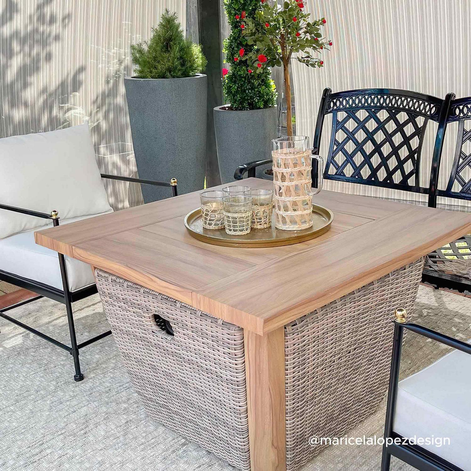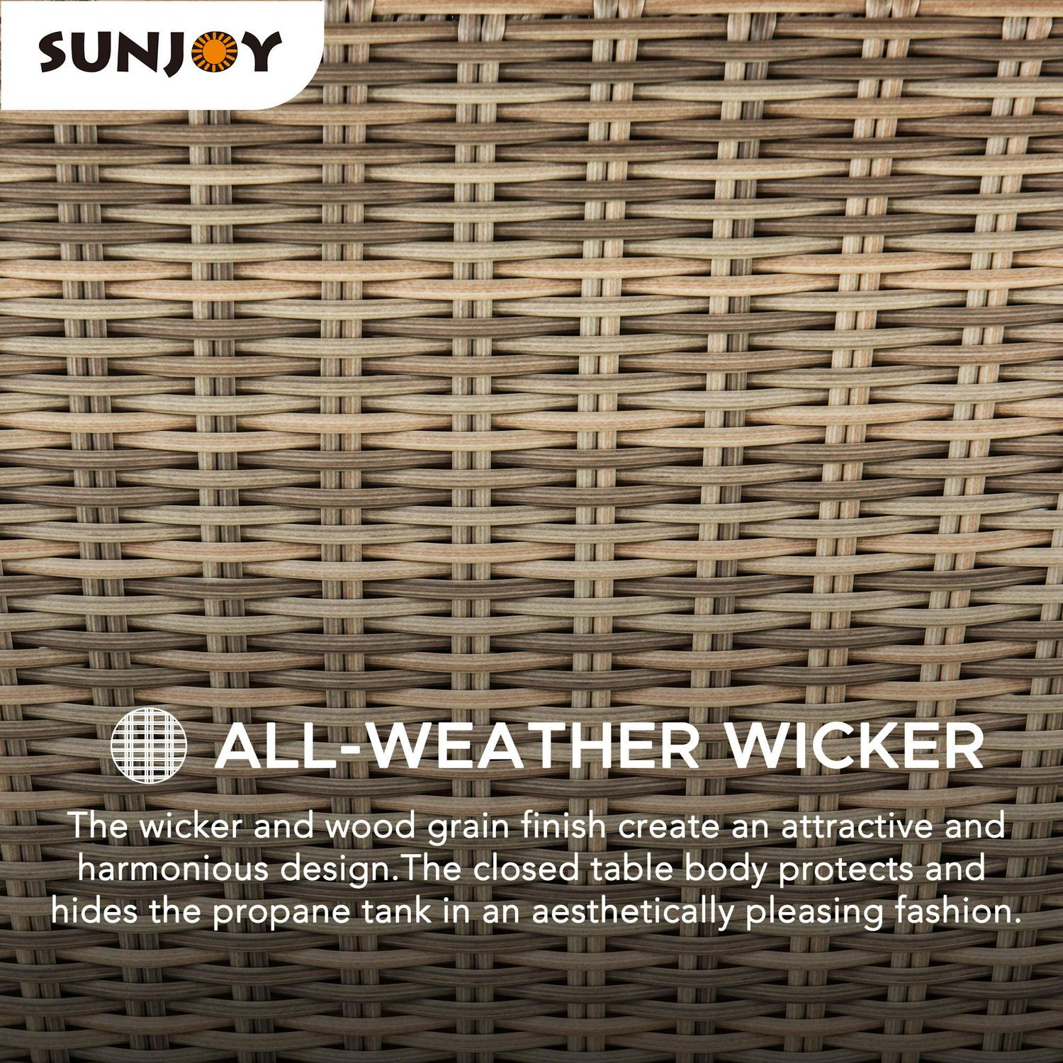 The wicker and wood grain finish create an attractive and harmonious design. The closed table body protects and hides the propane tank in an aesthetically pleasing fashion.