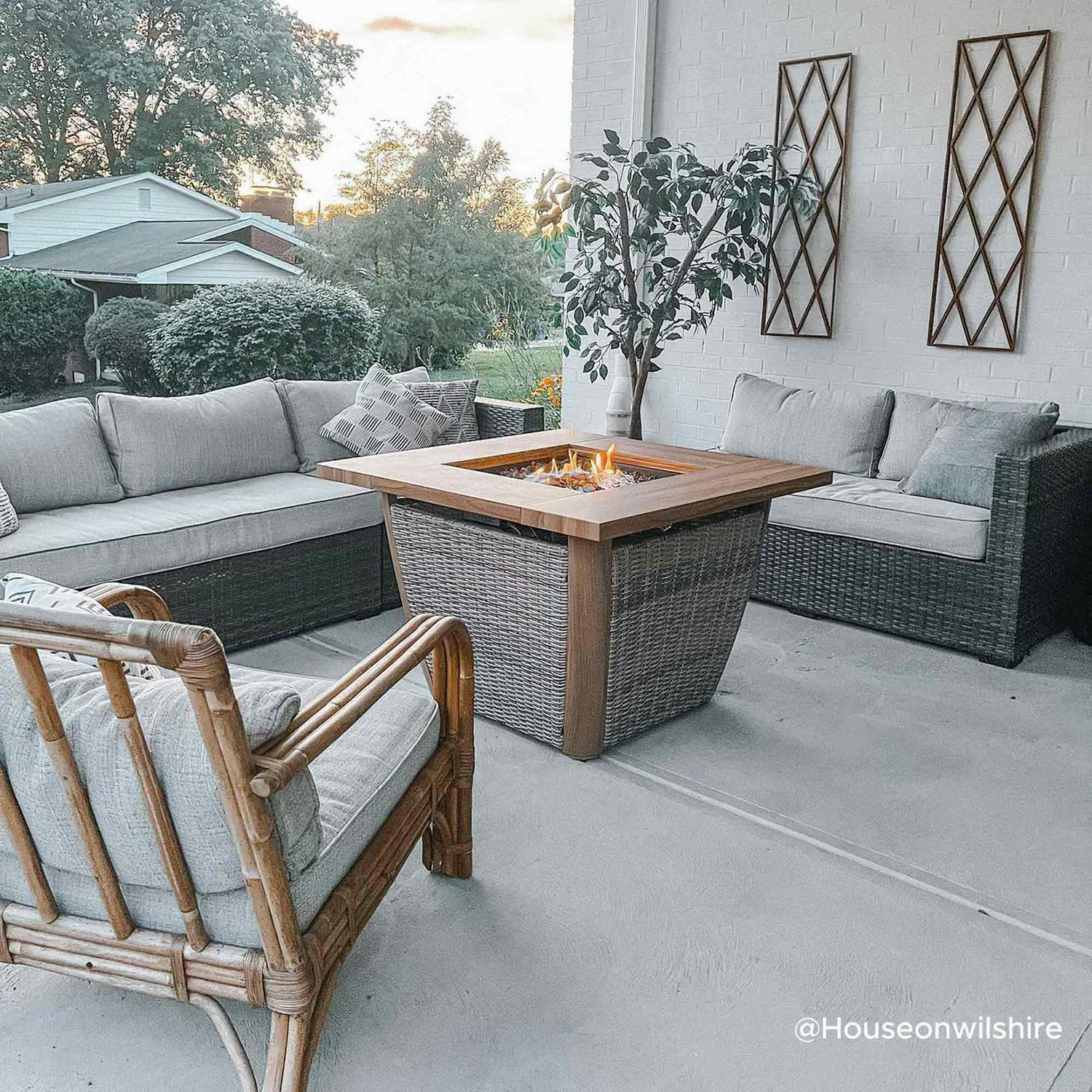 This chic and stylish fire pit table features a handsome woodgrain finish that complements a wide array of outdoor spaces.
