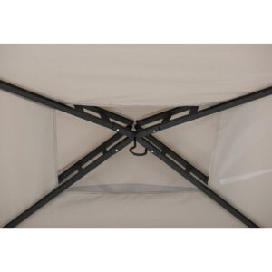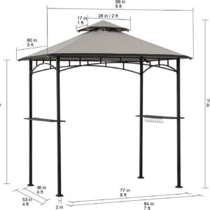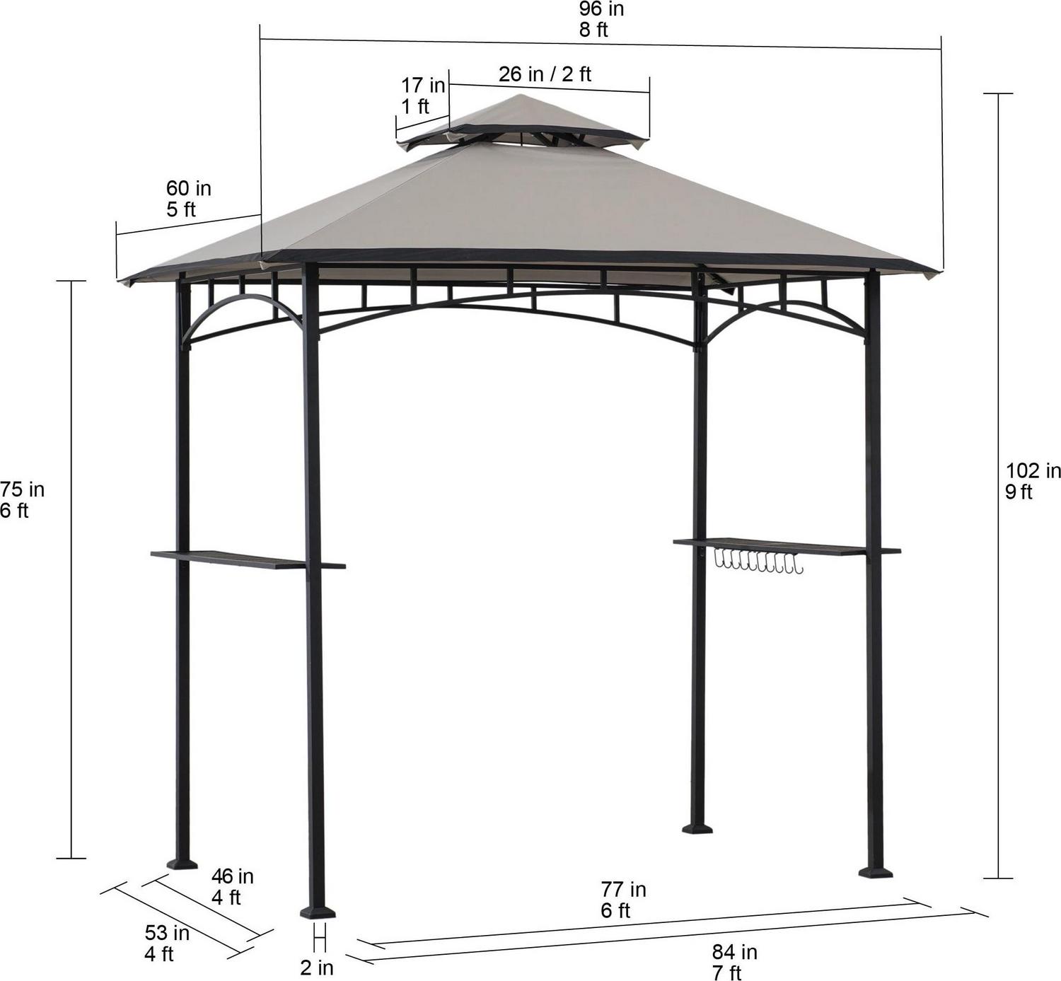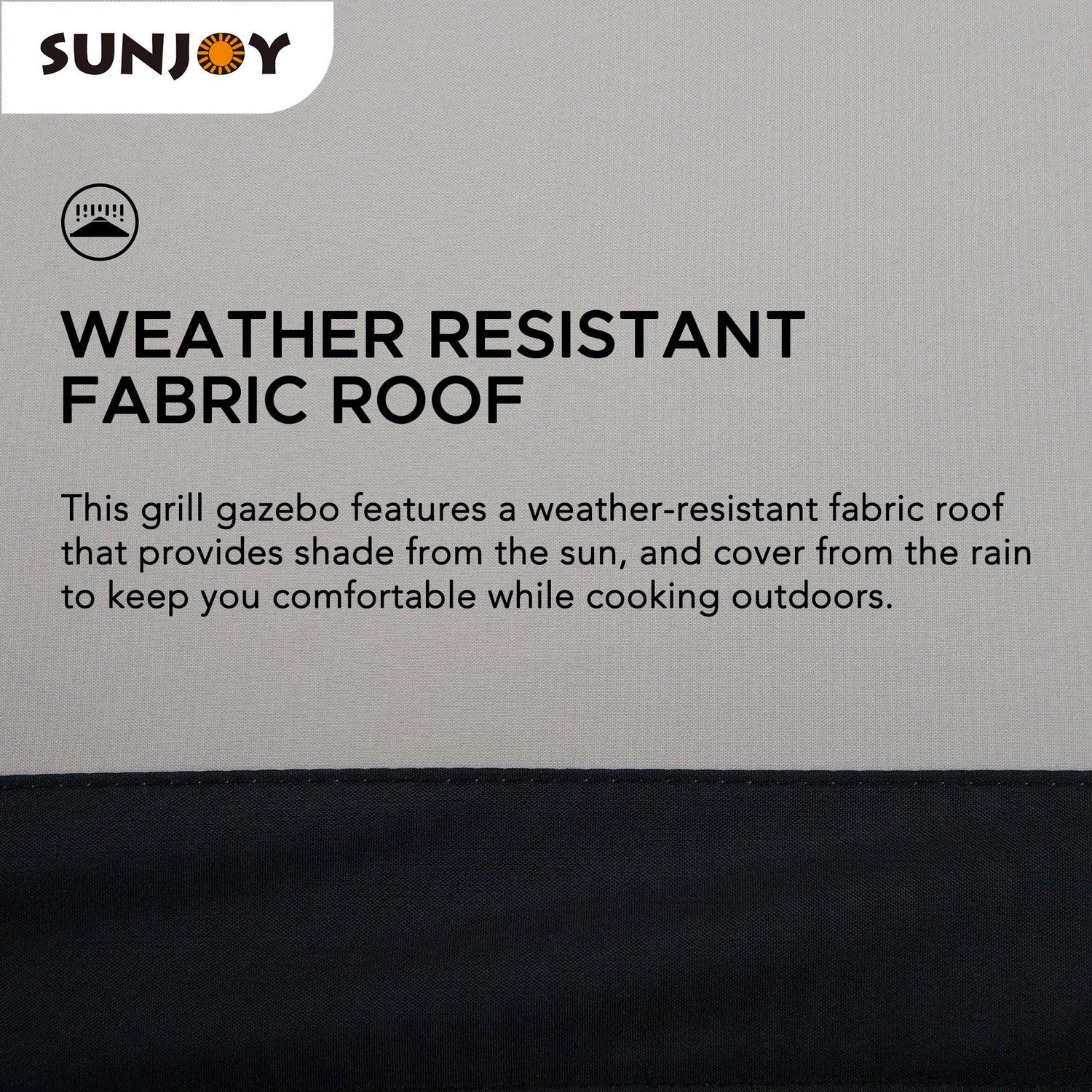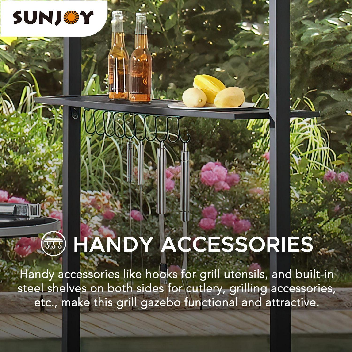 Kick back and enjoy your time grilling in the backyard even more with this grill gazebo by the world s leading ready-to-assemble outdoor structure maker, Sunjoy. This grill gazebo is designed to protect your grill from nature s toughest elements. The 5 ft. x 8 ft. powder-coated steel structure supporting a 2-tone fabric canopy not only shelters your grill, but it also keeps you dry and cool any time you re cooking. No more standing in the rain while you flip burgers. The 2-tier roof helps ventliate smoke. Handy accessories like hooks for grill utensils and built-in shelves makes this functional and attractive. With straight-forward, easy-to-follow assembly instructions you ll be relaxing in your favorite new outdoor cooking space in no time.