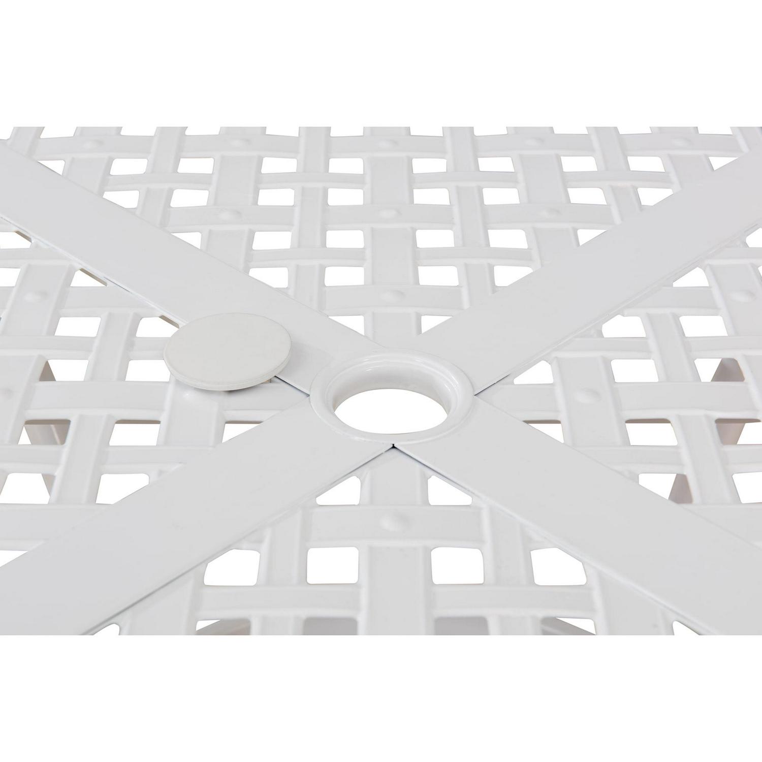 Perfect for a patio or pool deck this 5-piece dining set with removable weather-resistant beige seat cushions offers a comfortable spot outdoors for dinner, drinks and conversation. Constructed of rust-proof powder-coated aluminum the timeless latticework evokes a classic style sure to fit any style preference. A built-in hole for an umbrella allows you to easily add shade while you enjoy outdoor conversations. Enjoy time outdoors even more with this aluminum lattice 5-piece dining set from Sunjoy, the world’s leading ready-to-assemble outdoor structure maker.