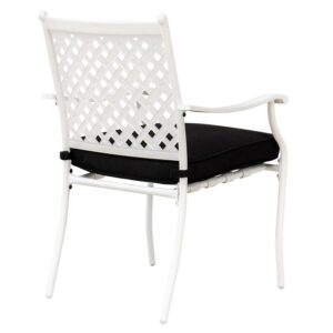 – Four rust-proof powder-coated white steel chairs with weather-resistant black fabric seat cushions