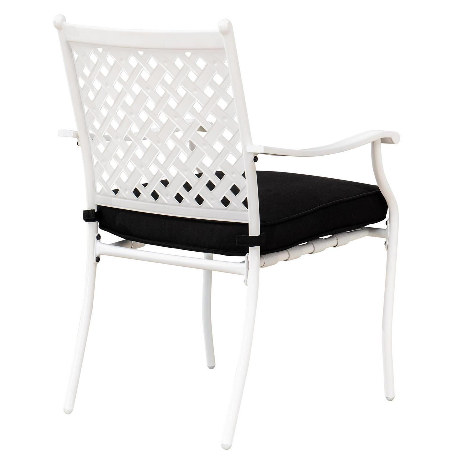 - Four rust-proof powder-coated white steel chairs with weather-resistant black fabric seat cushions
