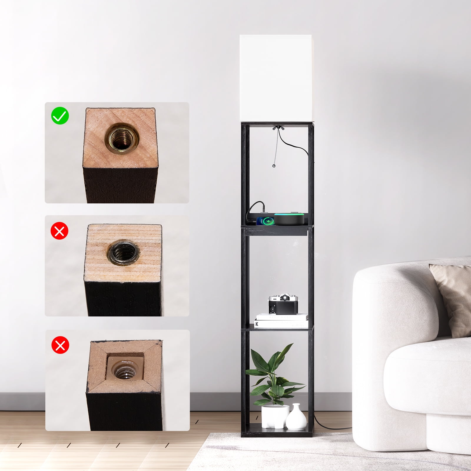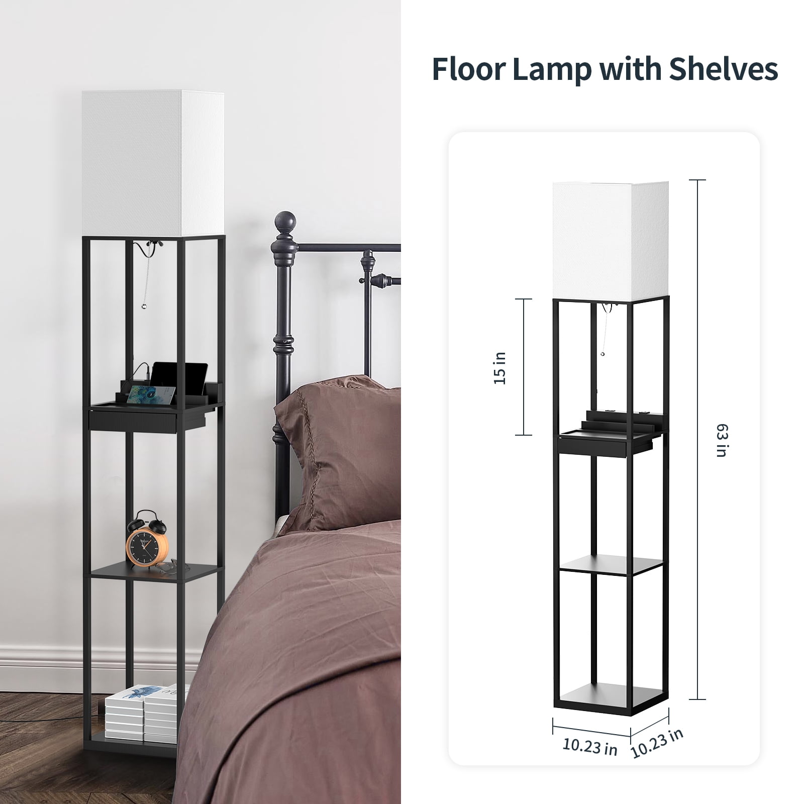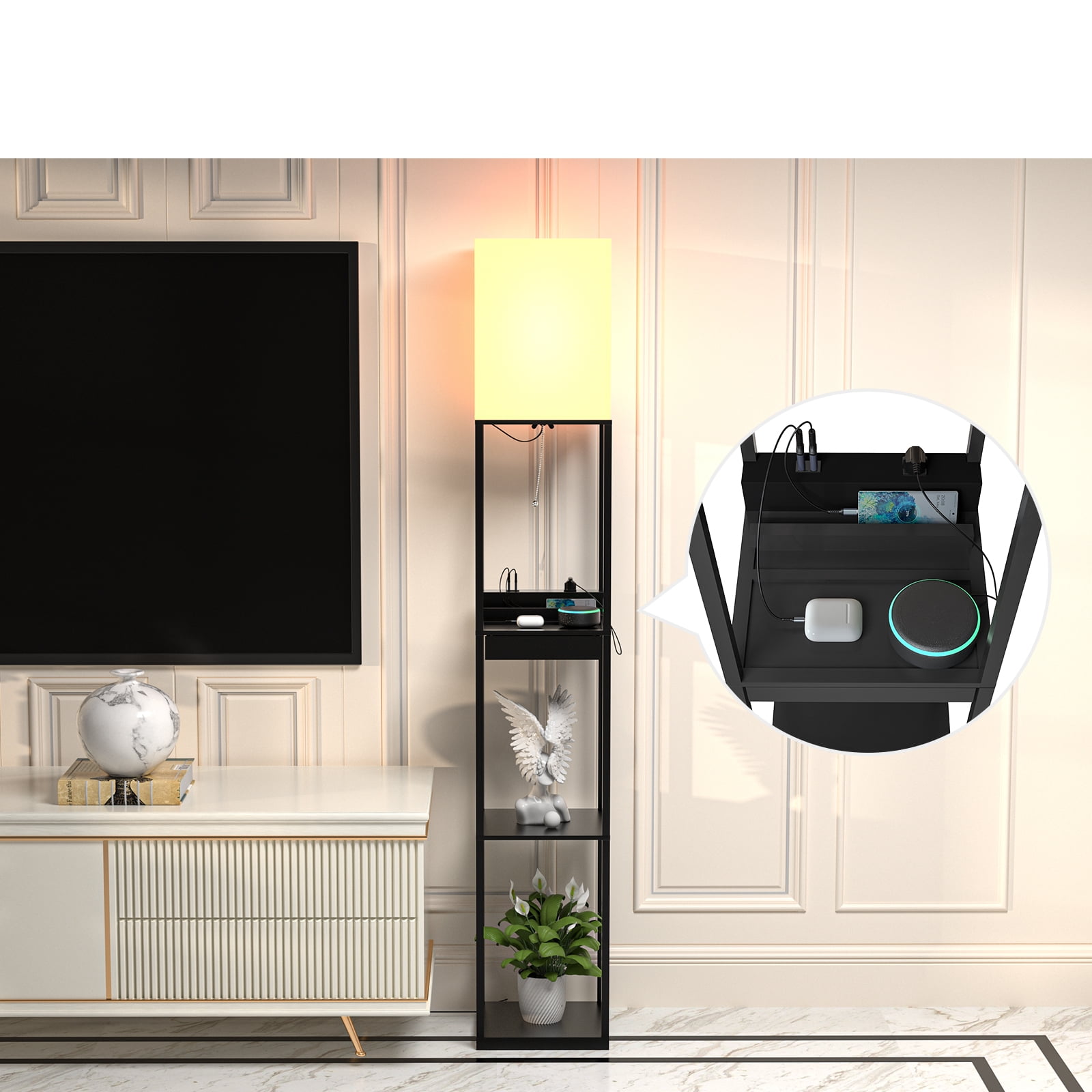 SUNMORY Floor Lamp with Shelves,Modern Dimmable Solid Wood Standing Lamp with 1 Drawer and 2 USB Ports & 2 Power Outlet,Corner Tall Bookshelf Lamp for Living Room and Bedroom(Black) Sunmory modern shelf floor lamp with drawer has 2 -charging USB ports and 2 power outlets, which can charge 4 devices like cell phone, tablet or bluetooth speaker in the same time. It includes a 9 Watt, 800 lumen power saving LED bulb. The LED lamp bulb is 3 color temp : 3000K/5000K/4000K. It can be used not only as a living room decoration but also as narrow night stands for bedroom. The lampshade are made of solid wood with stable structure and more durable. With the cloth lampshade, it shows the elegance and simplicity of the classic Asian style. This floor lamps with 3 shelves and 1 drawer. It’s not only Japanese style vertical lamp, but also corner storage tall bookshelf lamp. Specifications: Color: Black/White Finish Types: Wood Veneer Number of Lights: 1 Voltage: 120 Volts (AC) Switch Style: Pull Chain Wattage: 9 watts Bulb Base: E26 Light Source Type: LED Power Source: Corded Electric Special Features: Dimmable Luminous Flux: 800 Lumen Bulb Features: 3000K-4000K-5000K Color Temperature : 5000 Kelvin Color Rendering Index (CRI): 80.00 Shade Material: Wood Finish Type: Wood Veneer Pattern: Wood Grain Theme: Modern,Phone Maximum Compatible Wattage: 60 Watts Recommended Uses For Product: Decoration Specific Uses: Living room, Bedroom, Study, Office Item Weight :11 pounds Product Dimensions: 10.23 x 10.23 x 63 inches