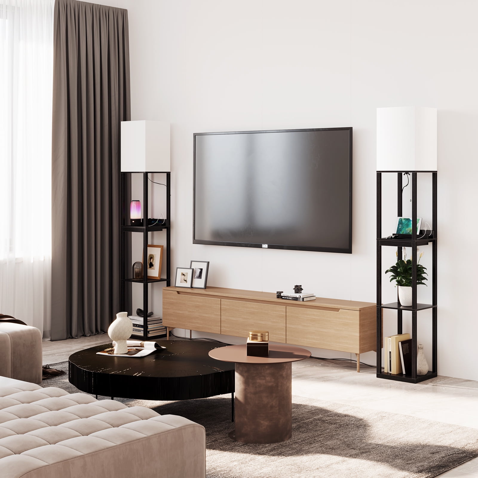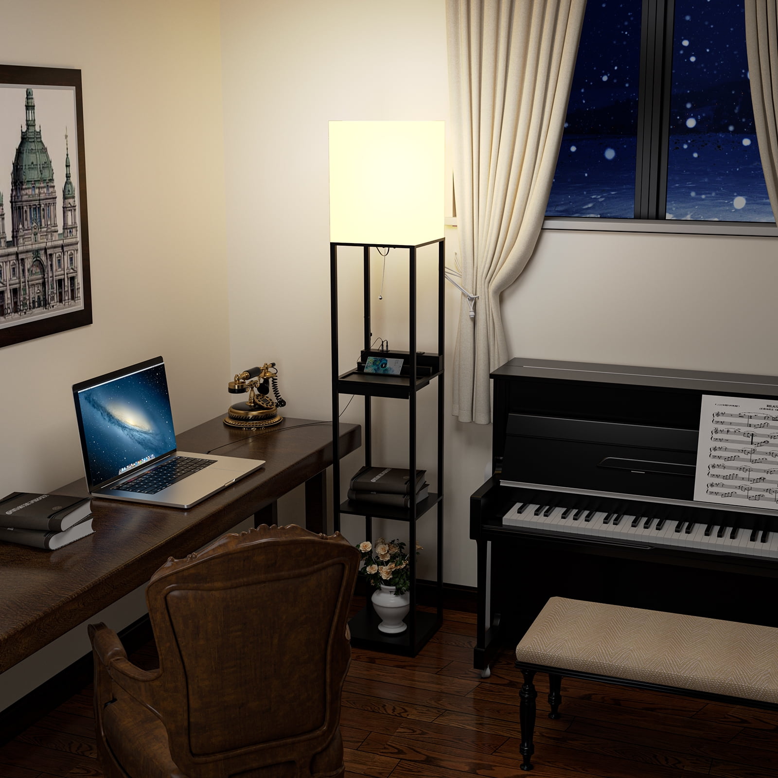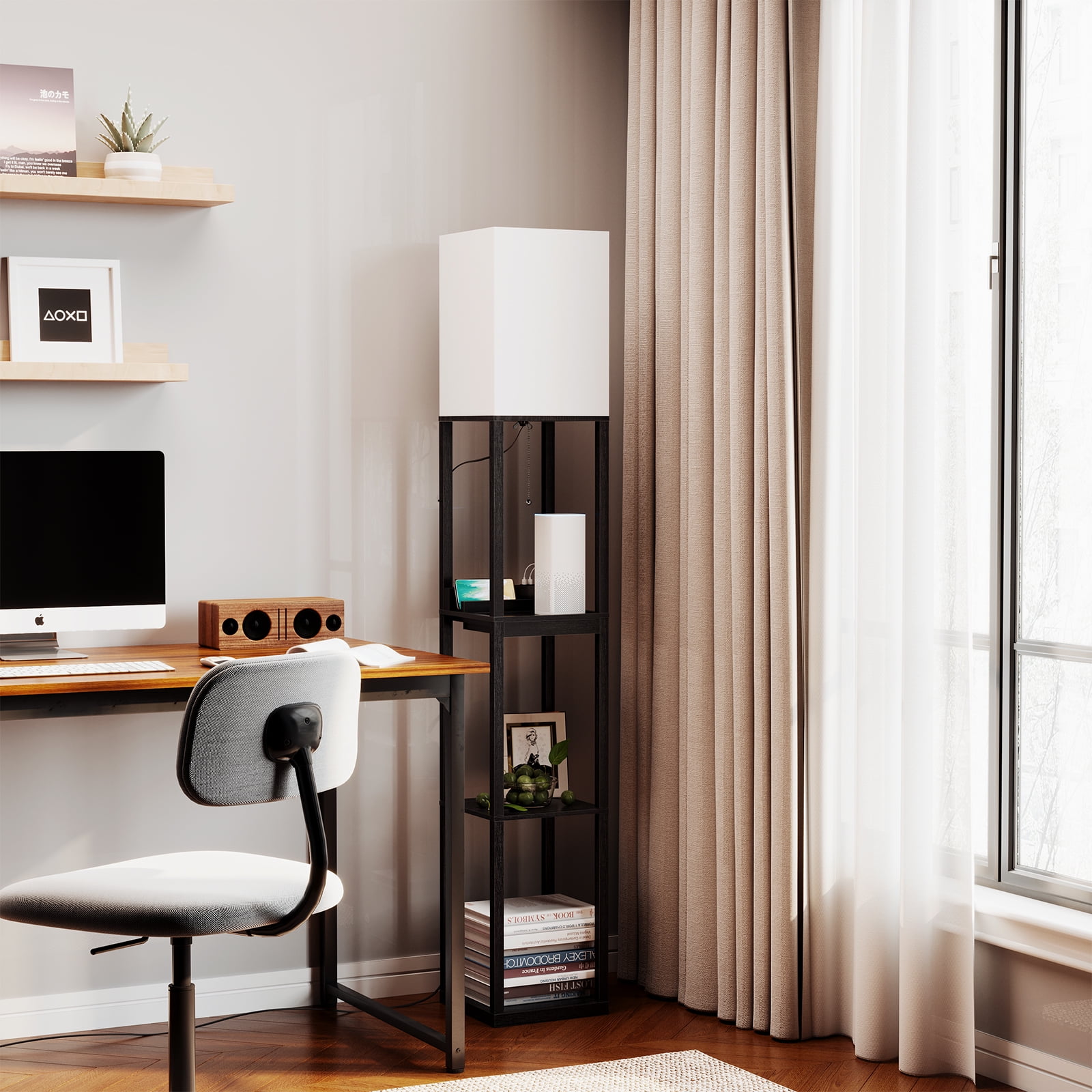 SUNMORY Floor Lamp with Shelves,Modern Dimmable Solid Wood Standing Lamp with 1 Drawer and 2 USB Ports & 2 Power Outlet,Corner Tall Bookshelf Lamp for Living Room and Bedroom(Black) Sunmory modern shelf floor lamp with drawer has 2 -charging USB ports and 2 power outlets, which can charge 4 devices like cell phone, tablet or bluetooth speaker in the same time. It includes a 9 Watt, 800 lumen power saving LED bulb. The LED lamp bulb is 3 color temp : 3000K/5000K/4000K. It can be used not only as a living room decoration but also as narrow night stands for bedroom. The lampshade are made of solid wood with stable structure and more durable. With the cloth lampshade, it shows the elegance and simplicity of the classic Asian style. This floor lamps with 3 shelves and 1 drawer. It’s not only Japanese style vertical lamp, but also corner storage tall bookshelf lamp. Specifications: Color: Black/White Finish Types: Wood Veneer Number of Lights: 1 Voltage: 120 Volts (AC) Switch Style: Pull Chain Wattage: 9 watts Bulb Base: E26 Light Source Type: LED Power Source: Corded Electric Special Features: Dimmable Luminous Flux: 800 Lumen Bulb Features: 3000K-4000K-5000K Color Temperature : 5000 Kelvin Color Rendering Index (CRI): 80.00 Shade Material: Wood Finish Type: Wood Veneer Pattern: Wood Grain Theme: Modern,Phone Maximum Compatible Wattage: 60 Watts Recommended Uses For Product: Decoration Specific Uses: Living room, Bedroom, Study, Office Item Weight :11 pounds Product Dimensions: 10.23 x 10.23 x 63 inches