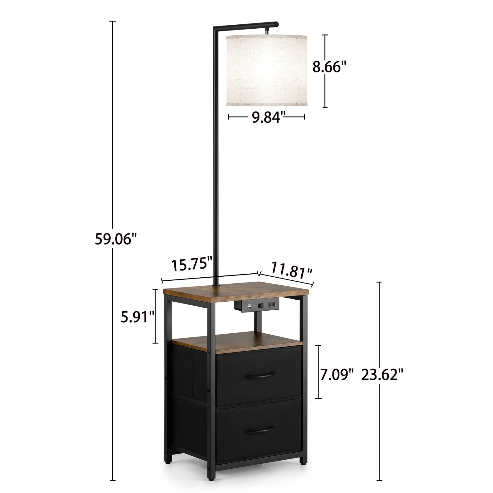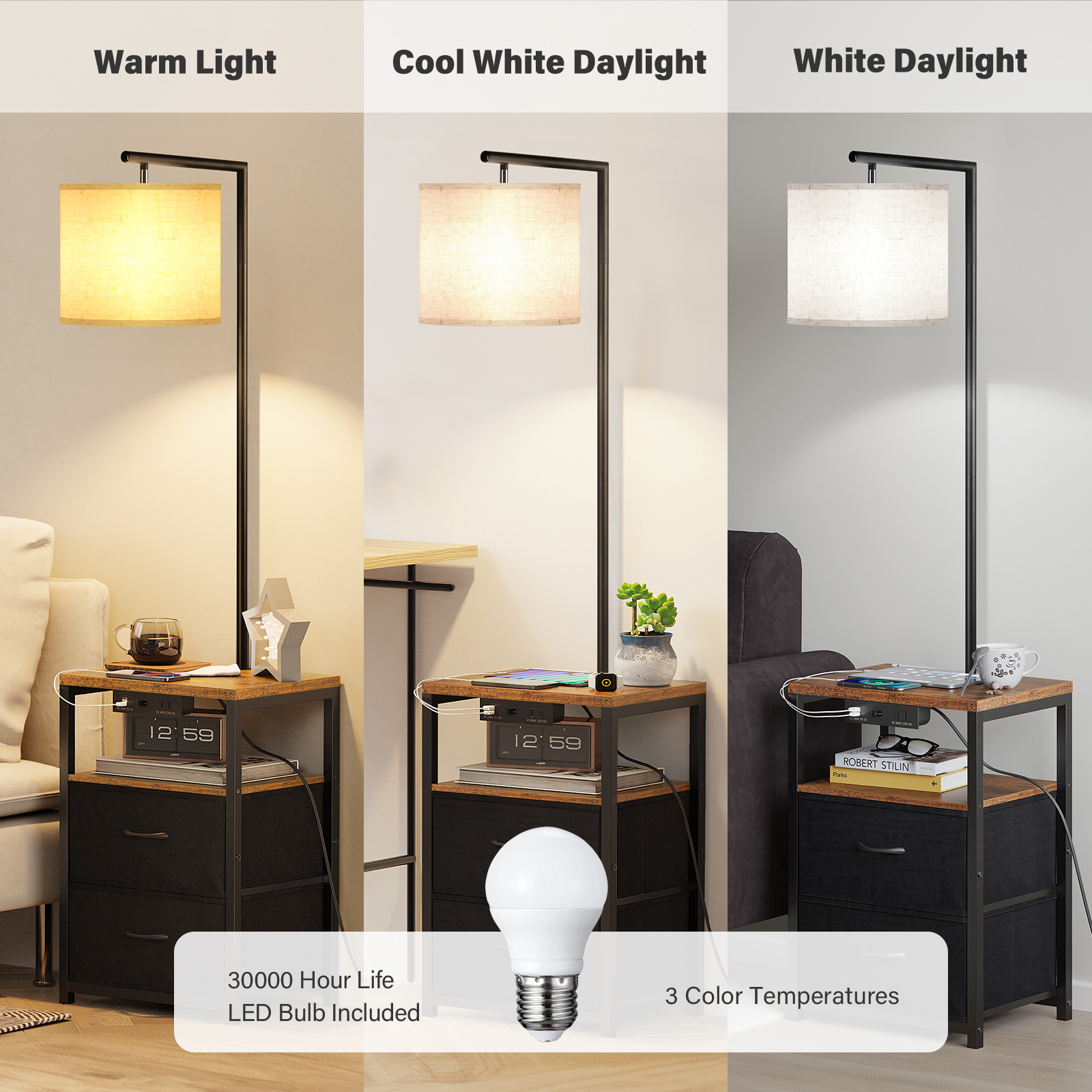 【Multi-function, multi-scenario use】 SUNMORY night stand lamp is a combination of bedside table + lamp, which can not only have storage function, but also can be used as a table, as well as lighting function. And this farmhouse lamp is suitable for different scenes, it can be placed on the bedside, next to the sofa, or next to the TV cabinet, so that it can be used for multiple purposes 【Large Capacity & High Load-bearing】Our side table lamp is equipped with two 75g non-woven drawers, each drawer has a load-bearing capacity of up to 11 lbs, and each has a capacity of up to 0.66 cubic feet, which can store both clothes and books, Glasses and other items to make your home more tidy and organized 【2 charging USB ports and 1 power socket】 The tall table lamp has 2 USB ports and 1 AC charging port, which is convenient for you to charge your mobile phones, iPad and other electronic devices, allowing you to enjoy the atmosphere created by the floor lamp with table, while also Enjoy the convenience it brings to you 【Three-color temperature bulb】 This end tables with usb ports and outlets attached contains a 3 color temperature E26 bulb (9W/800Lum). Compared with halogen lamps, it saves more than 85% of electricity bills. When the color temperature is adjusted to warm yellow light, the light is softer to protect your eyes. Adjusting to yellowish light or white daylight will be brighter and can be used as ambient lighting 【Easy Assembly】You can find the installation steps including text and video in the user manual .Supplied with installation tools,it doesn’t take much time to build up this night stand lamps, perfect for DIY lovers.If you have any dissatisfaction or questions after receiving the package, please feel free to contact us, and we will reply to any questions you have at any time