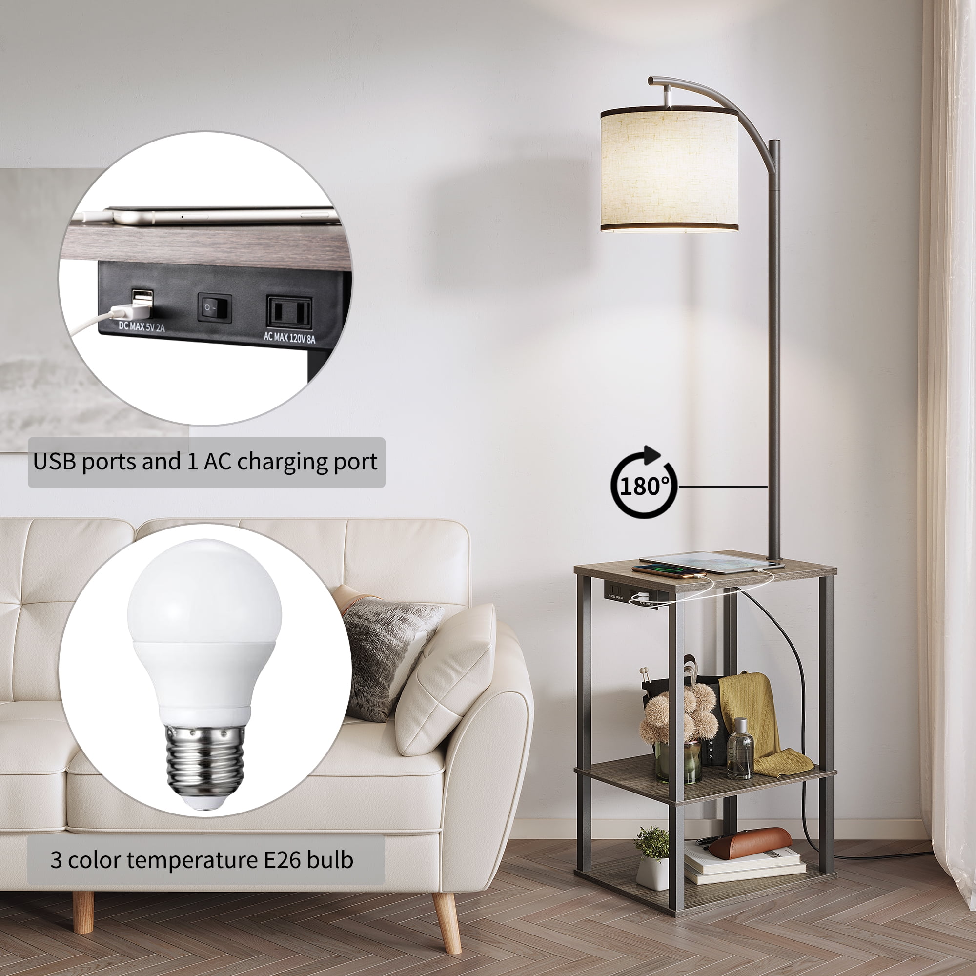 【Sturdy and space-saving, suitable for multiple places】 Our table with lamp attached have three-layer shelves and thick metal support rods, which are scratch-resistant, high-temperature resistant, and waterproof. And there is enough storage space for you to put books, coffee or laptops. In addition, the side table with lamp can be placed beside the bed, beside the sofa, beside the TV, or beside the recliner according to your personal preference to meet your different needs 【2 charging USB ports and 1 power socket】 The table lamp with usb has 2 USB ports and 1 AC charging port, which is convenient for you to charge your mobile phones, iPad and other electronic devices, allowing you to enjoy the atmosphere created by the end table with lamp, while also Enjoy the convenience it brings to you 【Three-color temperature bulb】 This floor lamp with table attached contains a 3 color temperature E26 bulb (3000K-4500K-6400K/9W/800Lum). Compared with halogen lamps, it saves more than 85% of electricity bills. When the color temperature is adjusted to 3000K, the light is softer to protect your eyes. Adjusting to 4500K will be brighter and can be used as ambient lighting. This usb table lamp is suitable for work, study and reading 【Adjust as you like】 This end table with lamp attached has an adjustable lamp holder, which can guide the light accurately to where you need it. The mid-century style lampshade is matched with modern LED three-color temperature bulb, the light is soft and not dazzling, and creating a variety of atmospheres. The simple and classic design highlights the elegance and simplicity of the classic Asian style, allowing the lamp tables with built in lamp to coordinate with different home styles 【DIY fun】 You need to assemble this lamp with table attached. We provide you with installation tools and installation instructions (video and text), very suitable for DIY enthusiasts. If you have any questions or suggestions, you can send us an email at any time and we will resolve it as soon as possible
