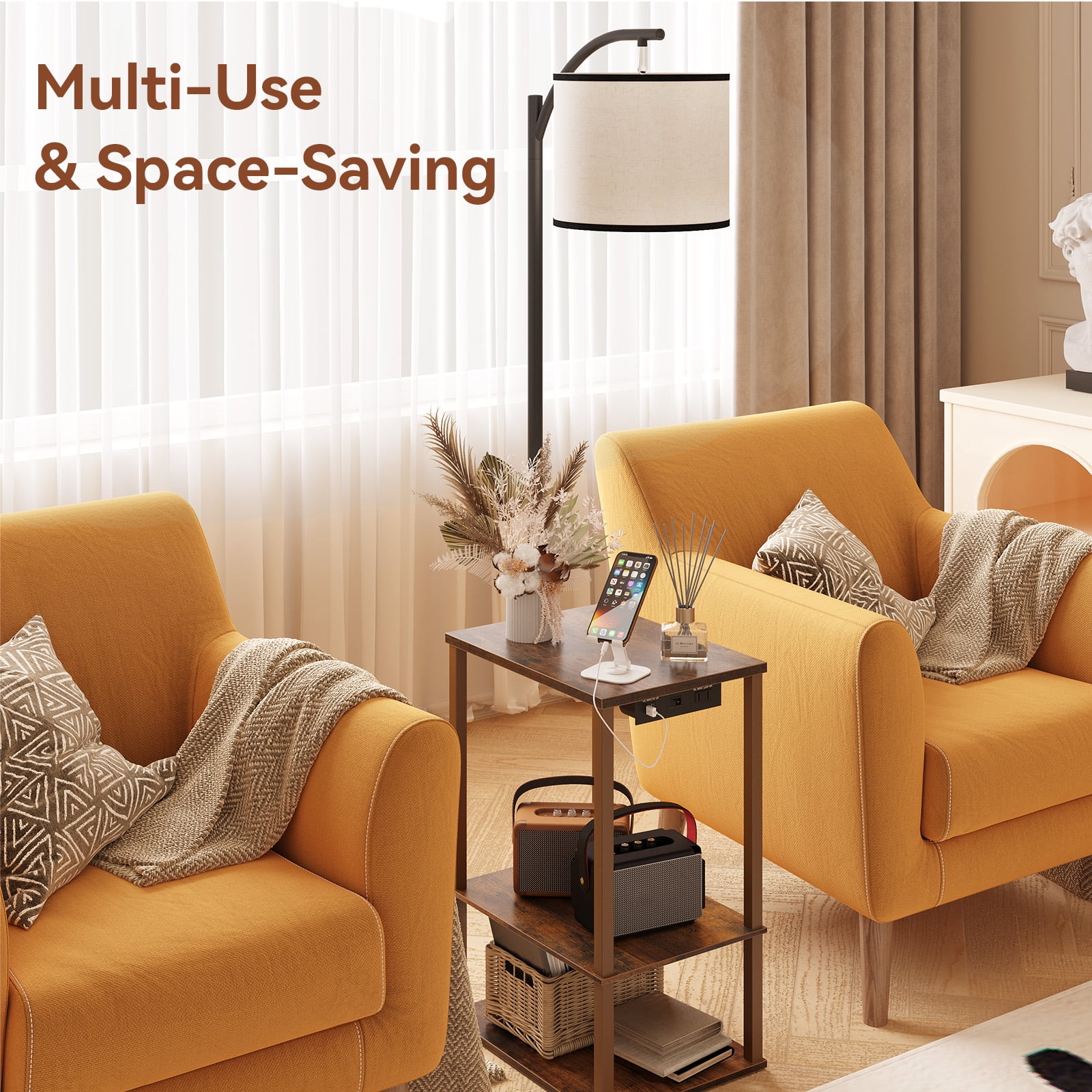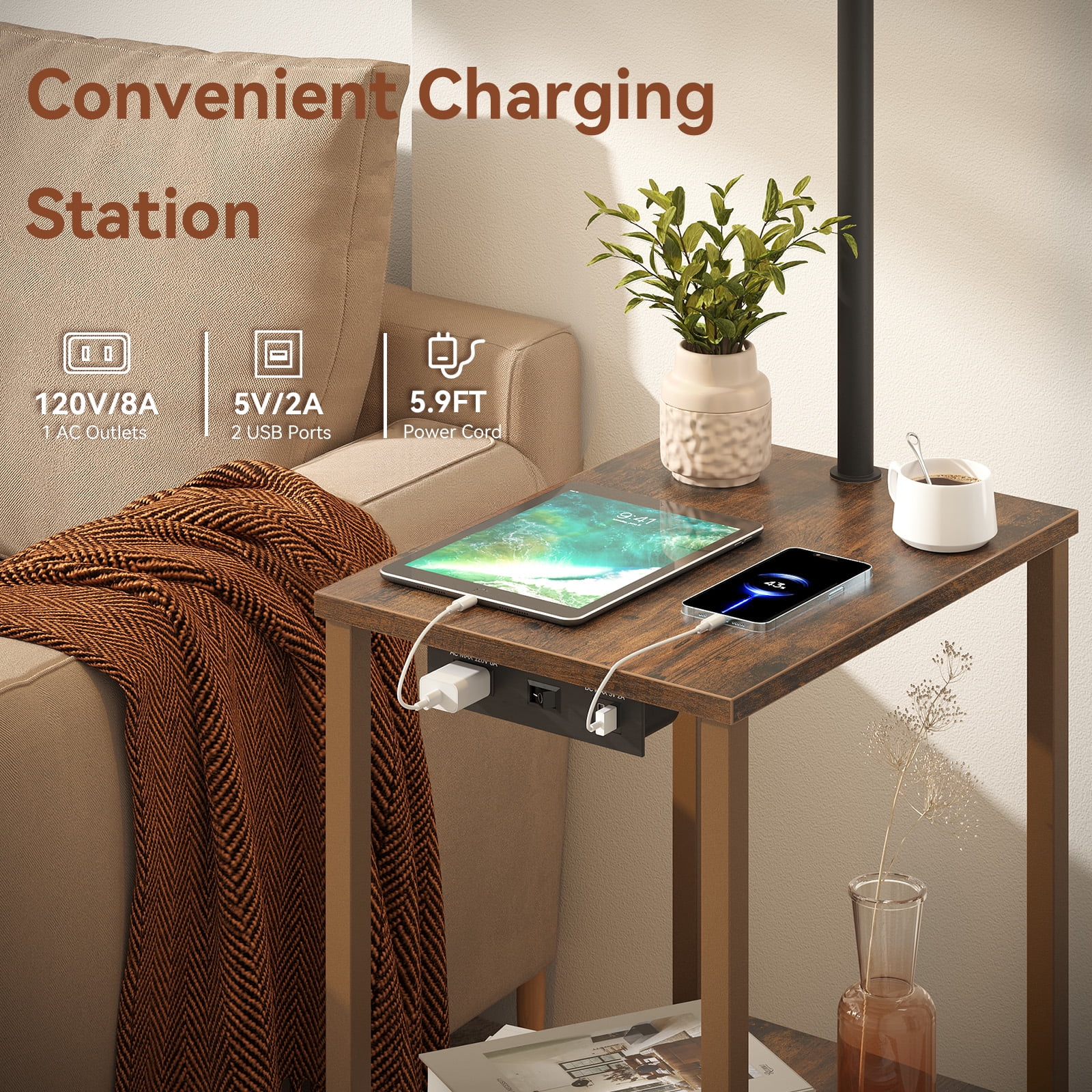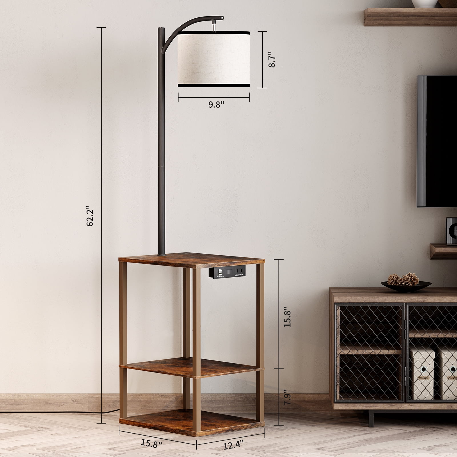 Our table with lamp attached have three-layer shelves and thick metal support rods, which are scratch-resistant, high-temperature resistant, and waterproof. SUNMORY End table floor lamp can be placed beside the bed, beside the sofa, beside the TV, or beside the recliner according to your personal preference to meet your different needs. The table lamp with usb has 2 USB ports and 1 AC charging port, which is convenient for you to charge your mobile phones, iPad and other electronic devices, Enjoy the convenience it brings to you. This floor lamp with table attached contains a 3 color temperature E26 bulb (2700K-4000K-5000K/9W/800Lum). Compared with halogen lamps, it saves more than 85% of electricity bills. Specifications: Brand:Sunmory Style:Modern Color:Brown Material:Wood/Metal