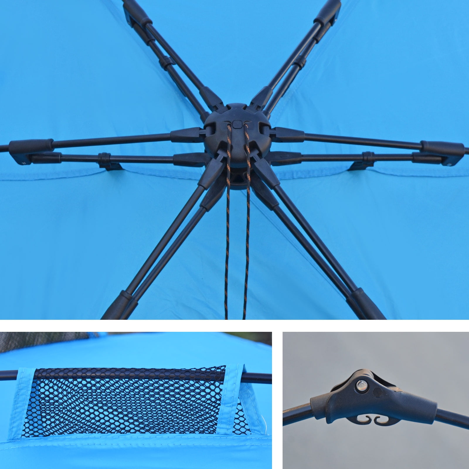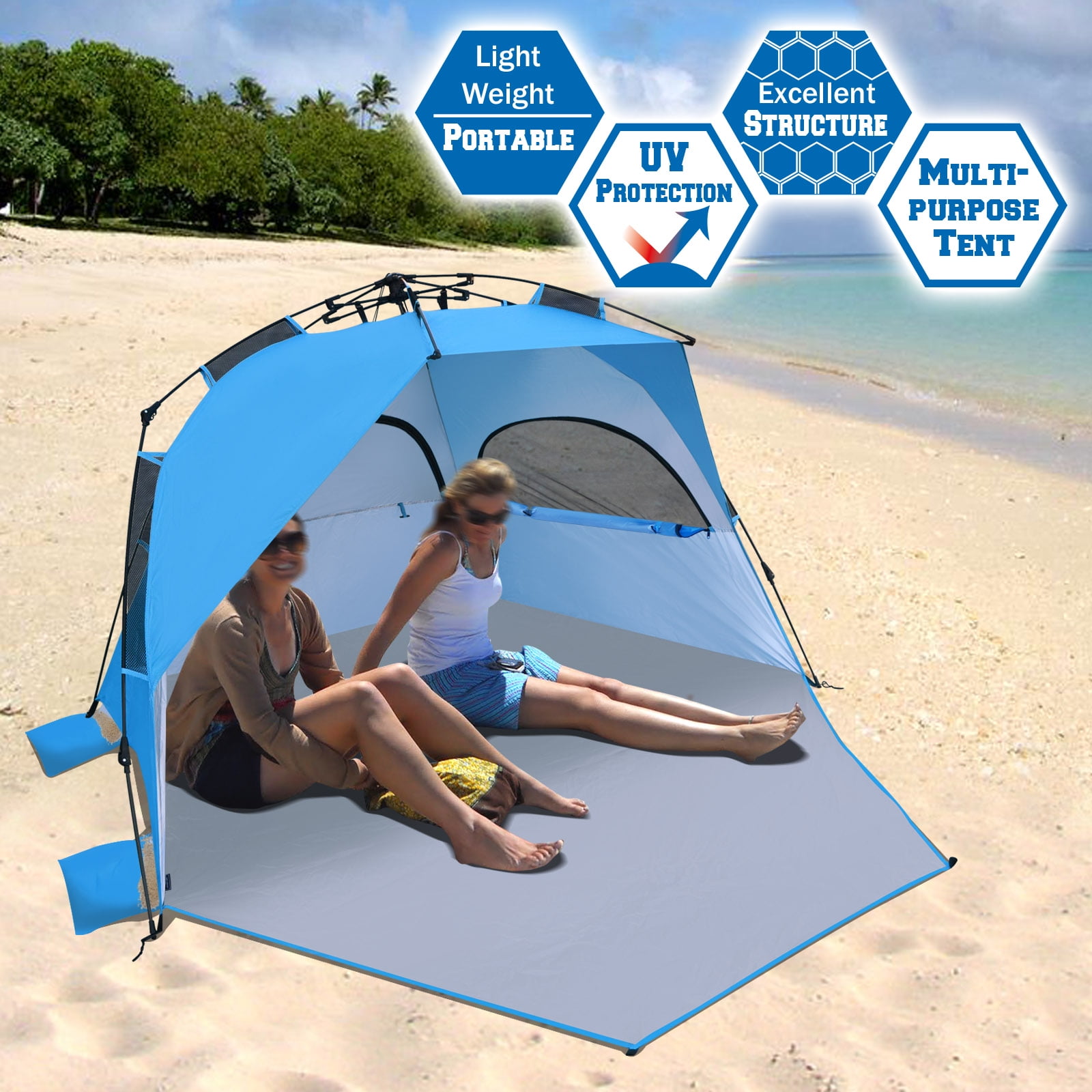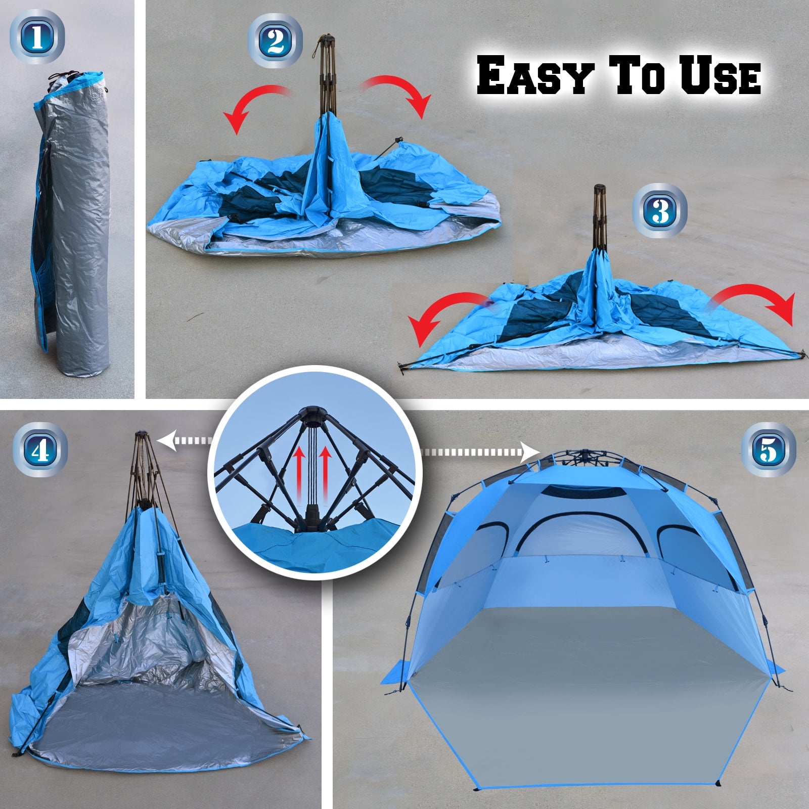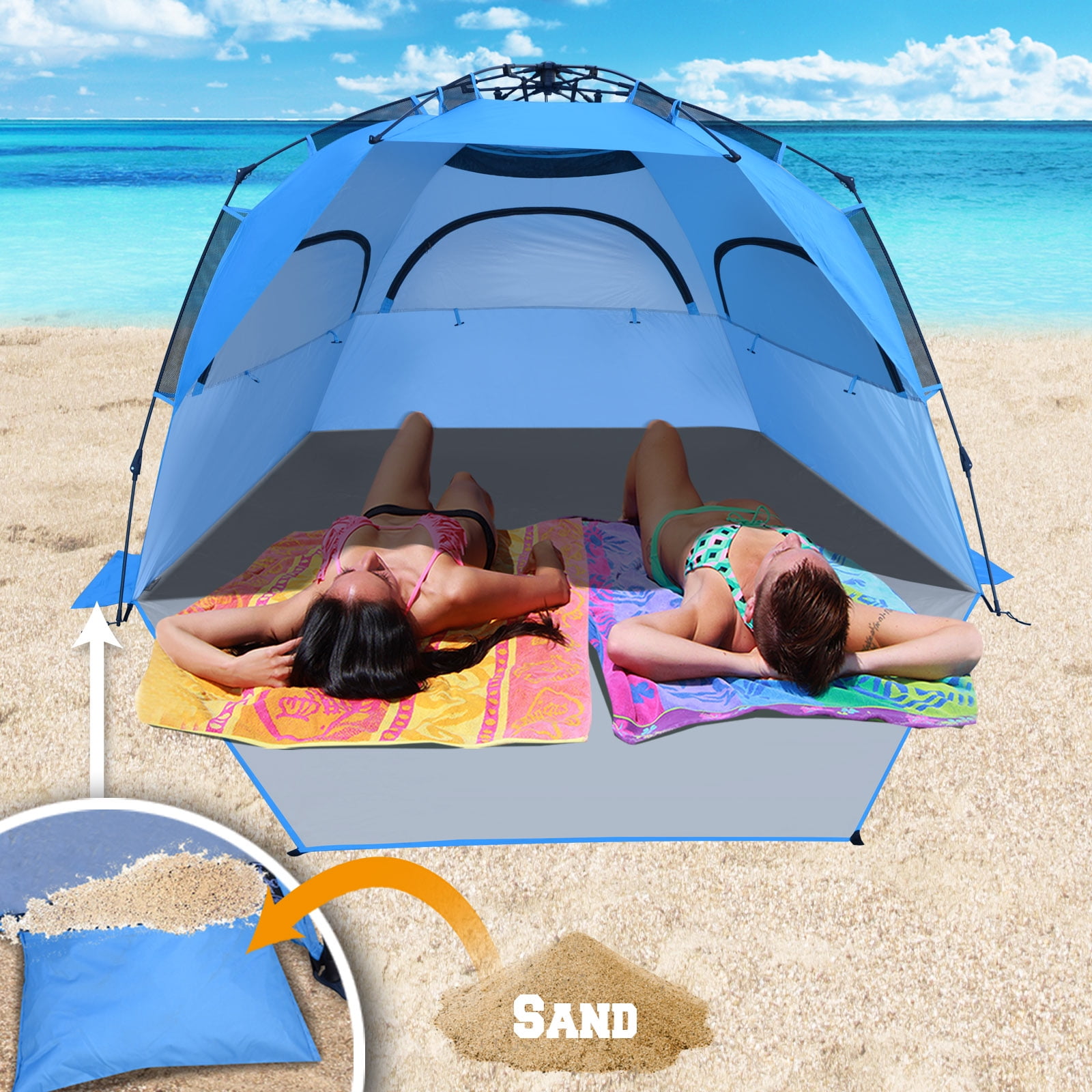 Size:94.5x 51.5x 51.5 inches(240x131x131cm); Fabric: 190T polyester taffeta silver coating/black B3 encrypted mesh (with zipper). Easy up and down: this pop up beach sun shelter can be incredibly easy to set up and take down in a minute by yourself alone. Lightweight, Automatic fiberglass frame makes this beach canopy for easy carrying. Coated material for extra UV protection. Package Includes: 1 x Camping Tent, 1 X Carry Bag, and 6 stakes