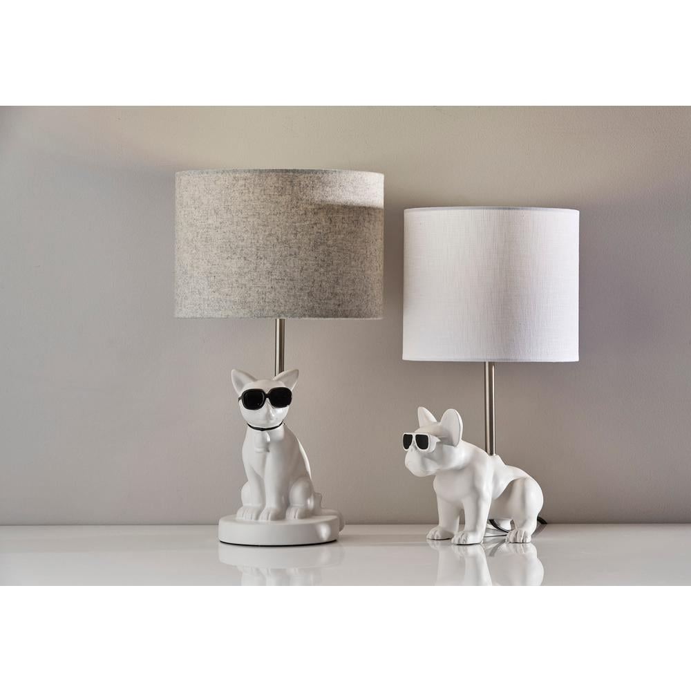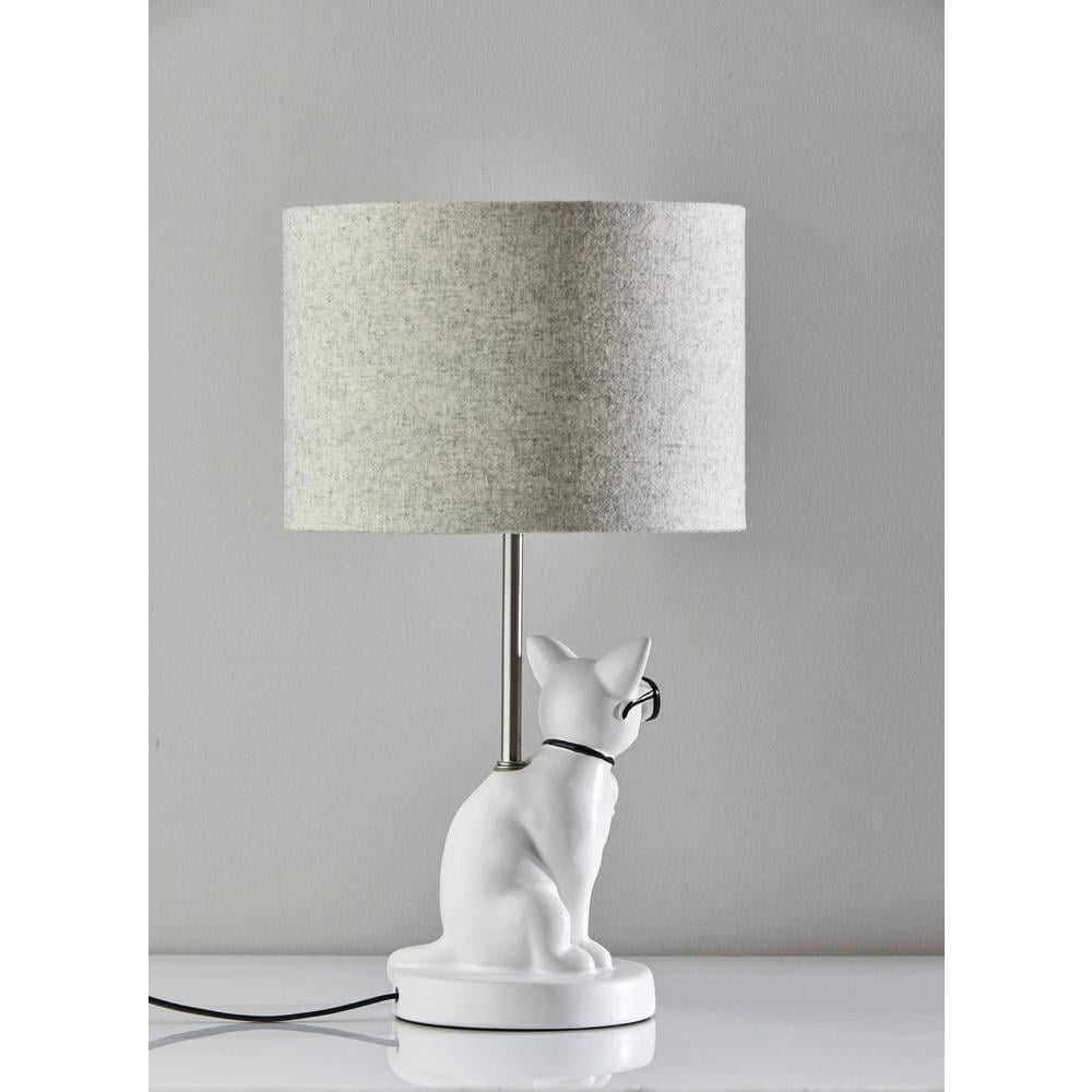 White resin cat shaped base with black sunglasses – a cool style statement! Light grey soft touch fabric shade 18″ height, 10″ width: perfect for compact spaces This lighting product is either UL or ETL listed, meaning that it has been tested and approved to meet the government-regulated safety standards for the USA.