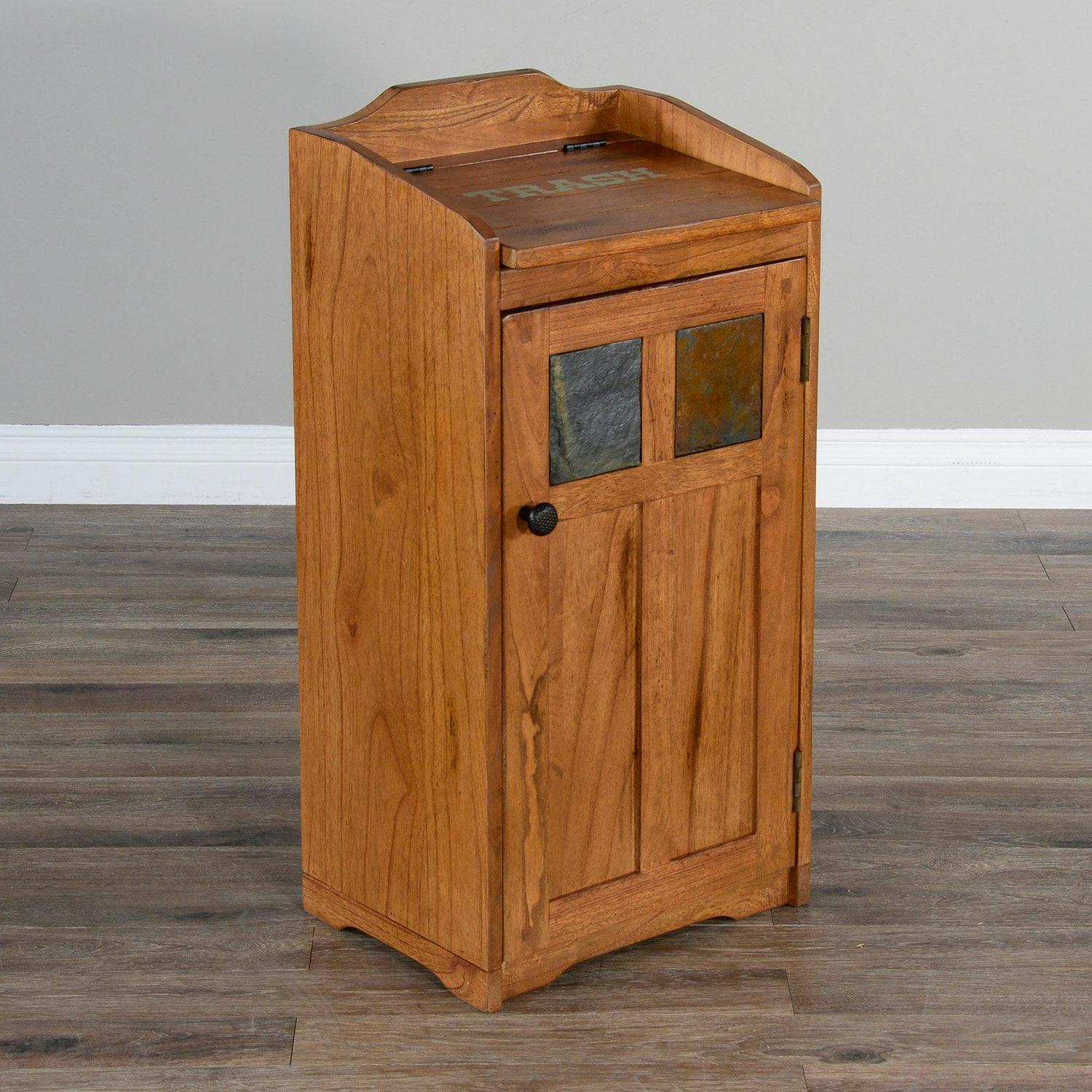 Don’t let your trash can ruin your kitchen décor – the Sunny Designs Sedona Rectangular Trash Box is perfect for disguising trash cans that hold up to 13 gallons. Constructed of solid mahogany, this trash box is in a rustic oak finish. The cabinet door makes it easy to place the trash can inside, while two tempered glass windows add visual interest to the piece. The lid is labeled TRASH so that your guests know where to throw away their things. Some assembly required.
