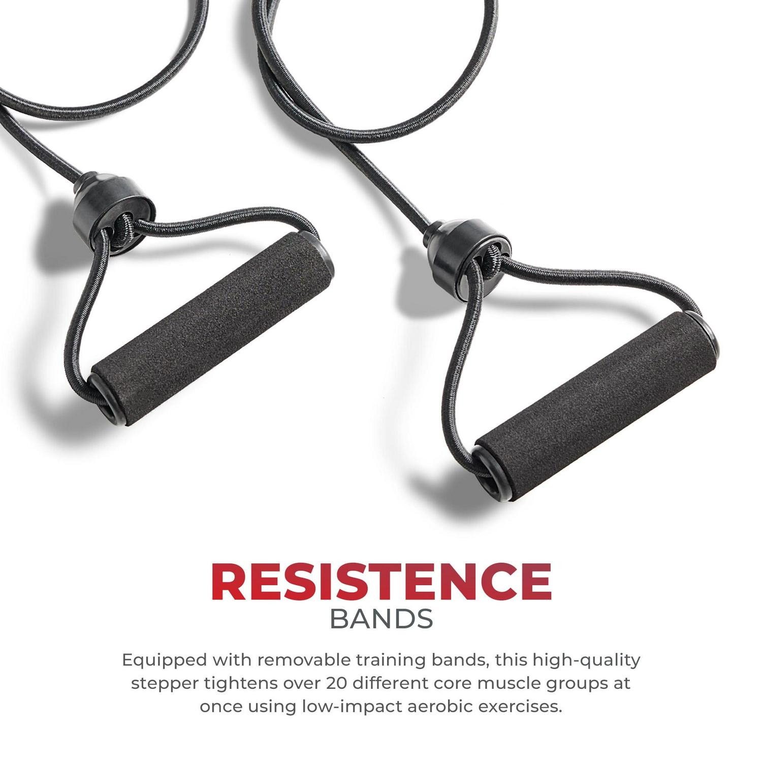 – TOTAL BODY WORKOUT: Equipped with removable training bands, this high-quality stepper tightens over 20 different core muscles using low-impact aerobic exercise and help tone your chest, back, and shoulders, along with exercising your inner and outer thighs, abs, and obliques.