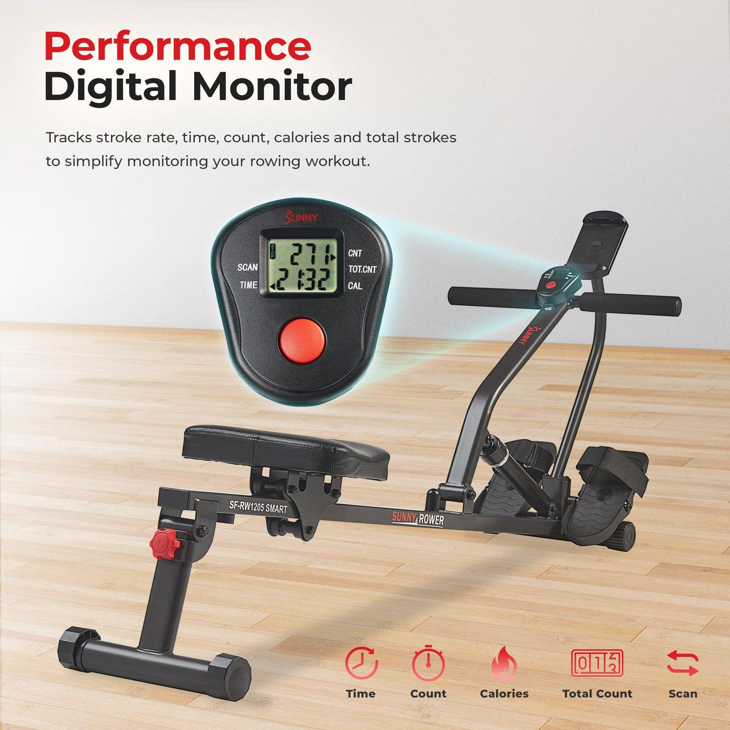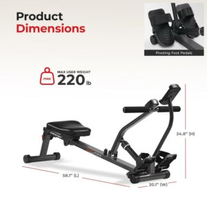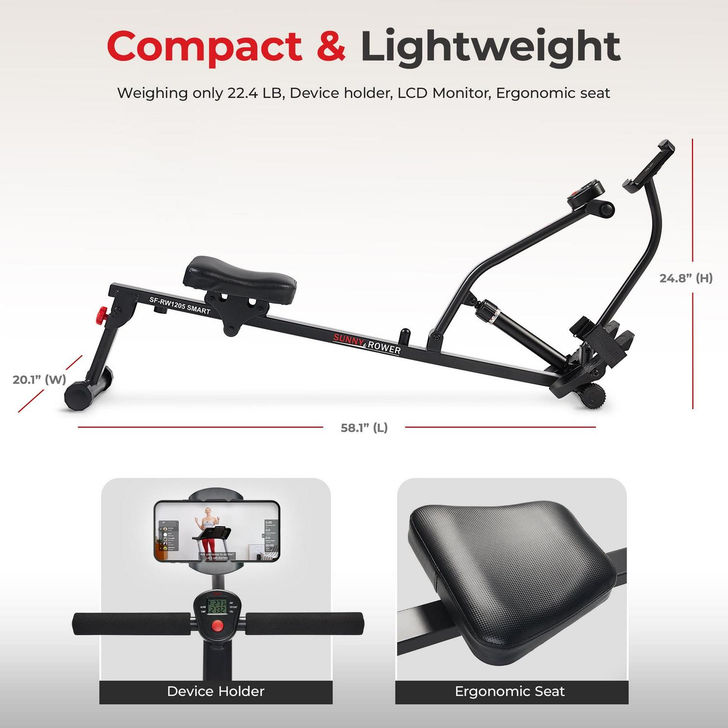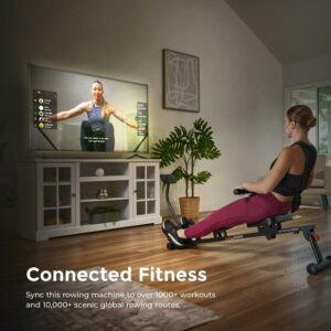 Experience connected fitness with the Sunny Health & Fitness hydraulic rower. Sync via Bluetooth to monitor your progress, explore training content, and engage with the active community. The smooth hydraulic resistance provides a full body workout by targeting all major muscle groups through a complete range of motion.The compact and lightweight folding design maximizes portability and storage convenience. Weighing just 22.4 LB, it can be transported or stored easily. The integrated device holder keeps your phone or tablet secure to stay motivated.Assembly is quick and easy – just attach the stabilizer bars, padded seat, pivoting foot pedals, and monitor mount using the included instructions. The ergonomic seat and adjustable straps provide a comfortable, customized fit.Trust Sunny Health & Fitness to deliver a quality rowing machine backed by their 20+ years of experience. Make the most of your workouts with connected fitness and full body training.