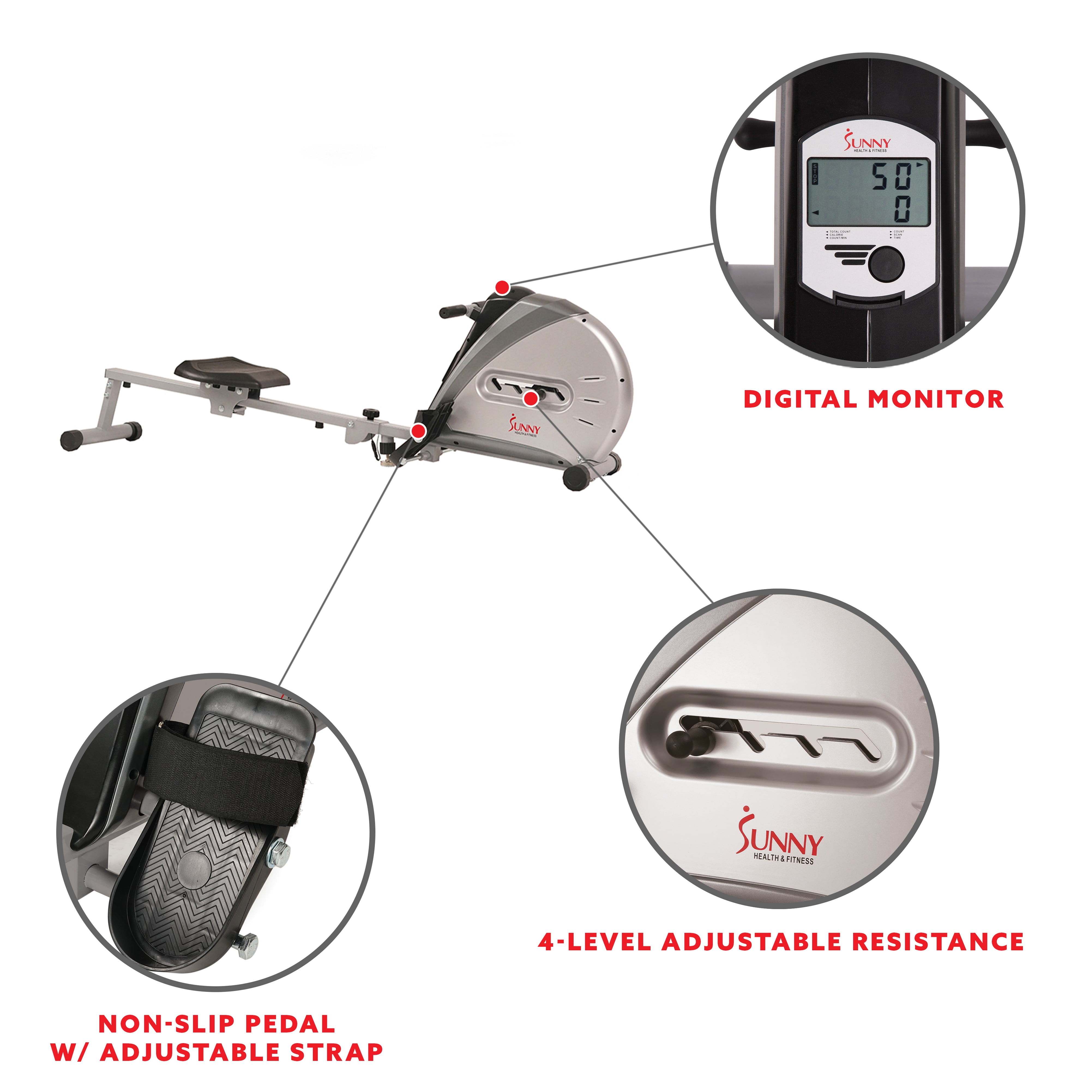 Elastic cord dual-directional resistance with 4 levels of adjustable tension. Large LCD console displays time, count, total count, calories burned, count per minute, and scan. Oversized angled seat with non-slip handle for optimal comfort. Large anti-slip foot pedals with adjustable foot straps for secure footing. Maximum user weight of 220 lbs. Take your workout to the next level, FREE App membership w every Sunny products. Explore 1,000+ trainer led workouts, 10,000+ virtual scenic tour simulation, access exclusive in-app social communities & leaderboards and more!