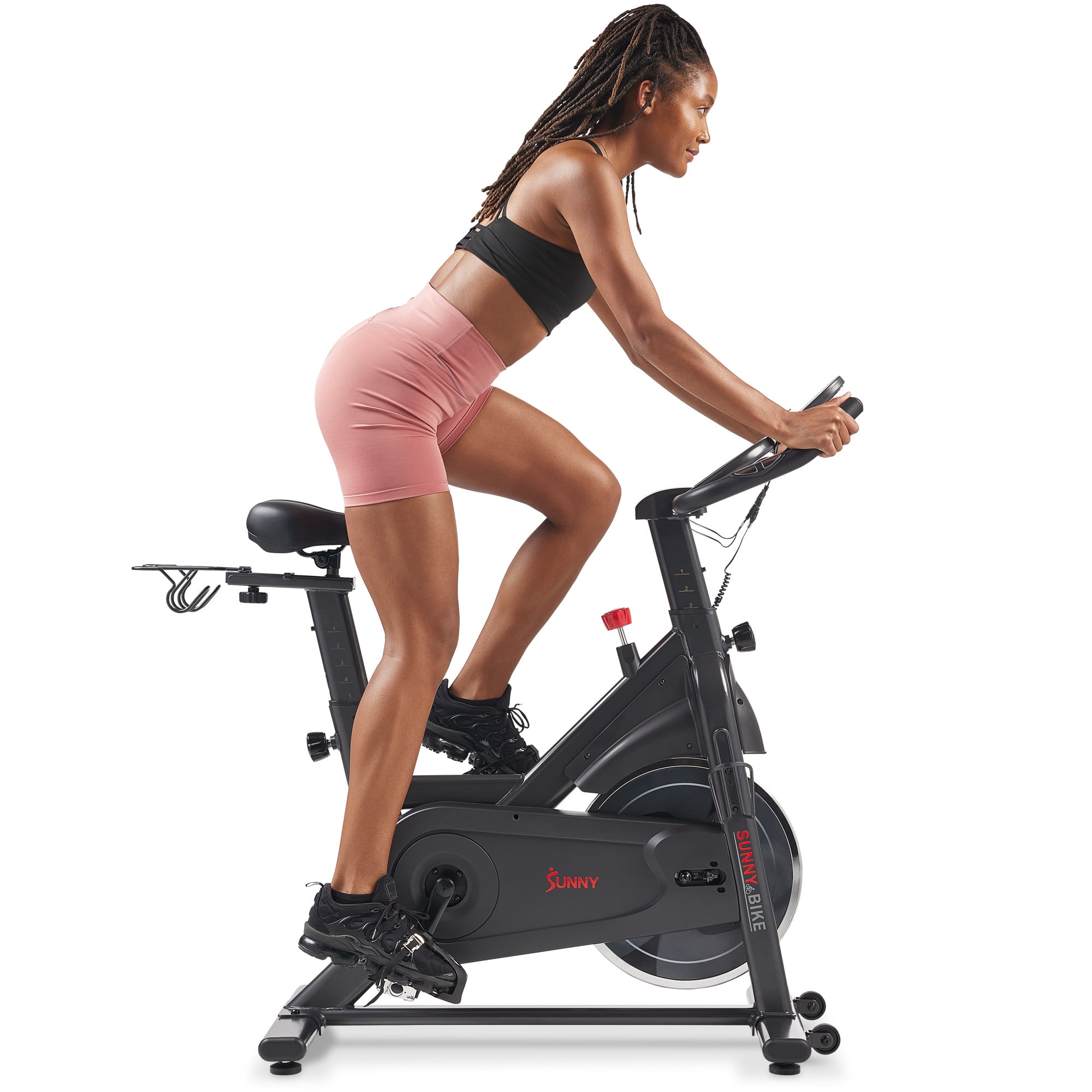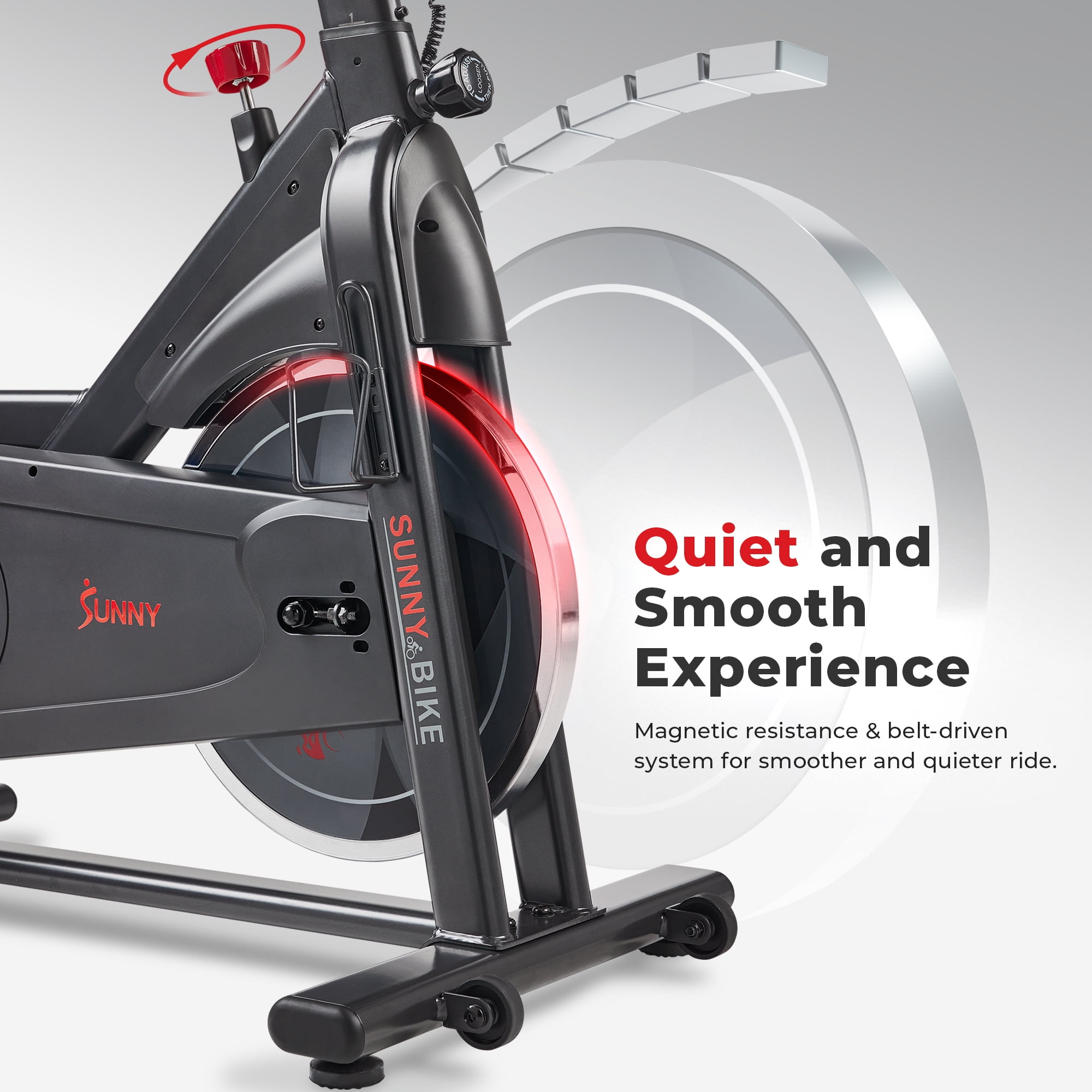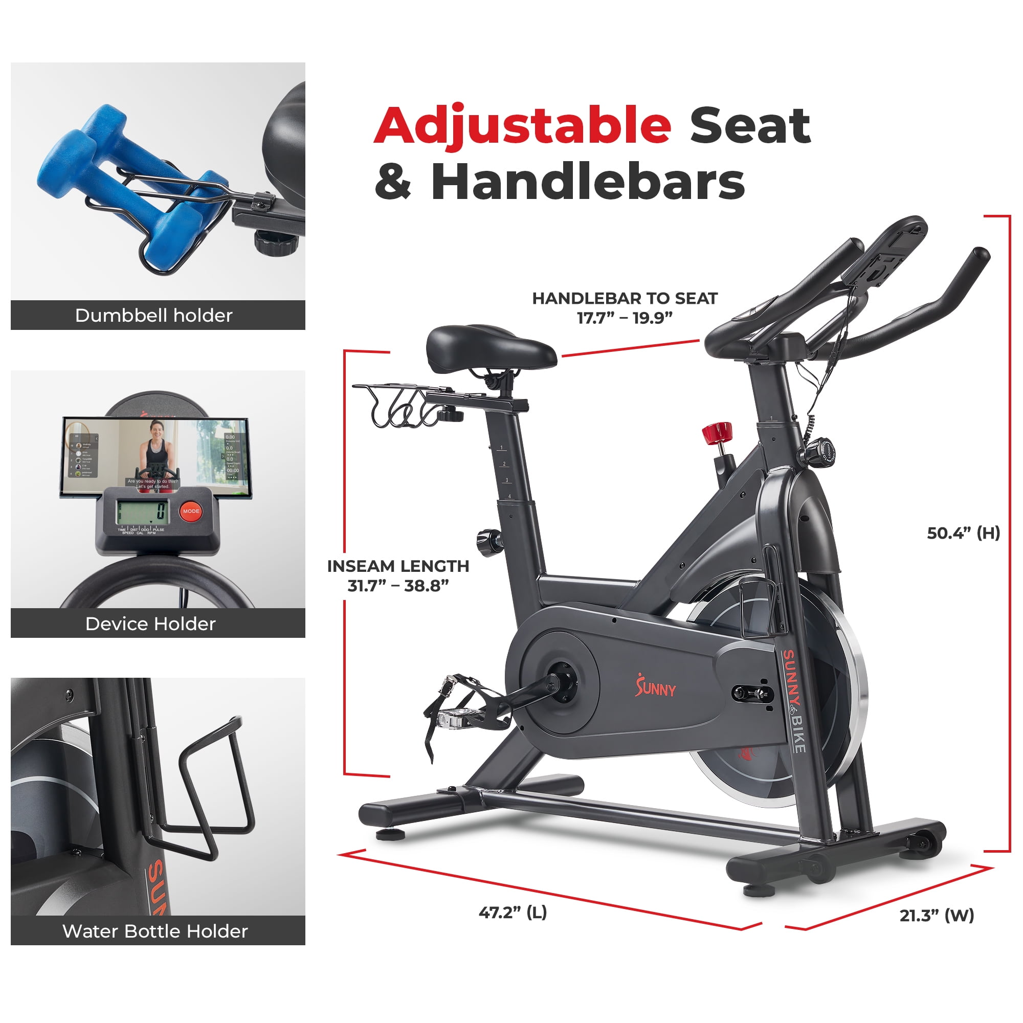 CONNECTED FITNESS: With Bluetooth connectivity, the free SunnyFit app allows you to access 1000+ free trainer guided workouts and hundreds of other fitness programs. Track your progress, set fitness goals, access personalized workout plans, 10,000+ virtual scenic tour simulation and compete with other community members to get to the top of the leader board. Have all the workouts of your choice right at your fingertips, while also feeling supported as a member of this likeminded community. 【WHISPER-QUIET PERFORMANCE】 Enjoy frictionless magnetic resistance for precise fitness level adjustments. Belt-driven with a 22 LB flywheel, it offers smooth pedaling and customizable challenges. 【LOW-IMPACT CARDIO】The perfect bike for fitness pros seeking home workouts. It provides core-targeting, low-impact cardio exercise. Its ergonomic handlebars with contoured padding ensure comfort for intense sessions. 【DURABLE CONSTRUCTION】A robust steel frame, this exercise bike can endure intense workouts and support up to 300 LB Its sturdy, durable design ensures stability for various body types, promoting inclusive fitness. 【ADJUSTABLE SEAT & HANDLEBARS】Enjoy a tailored ride with the bike’s 4-way adjustable seat and 2-way adjustable handlebars. They cater to all body types and allow full customization for a personalized, comfortable cycling journey. 【EASY-TO-READ DIGITAL MONITOR】Easily monitor your workout with the digital display showing time, speed, distance, calories, RPM, and pulse. Stay motivated and track your fitness journey effortlessly. 【CONVENIENT HOLDERS】 This bike features an integrated dumbbell holder and a sturdy bottle holder for strength training and hydration. Alongside a tablet holder, it combines essentials for a seamless fitness routine. 【Sunny Health & Fitness Commitment】 A top fitness brand for 20+ years, offers superior products and a dedication to excellence. Count on our committed customer service and trainers for the best fitness experience.