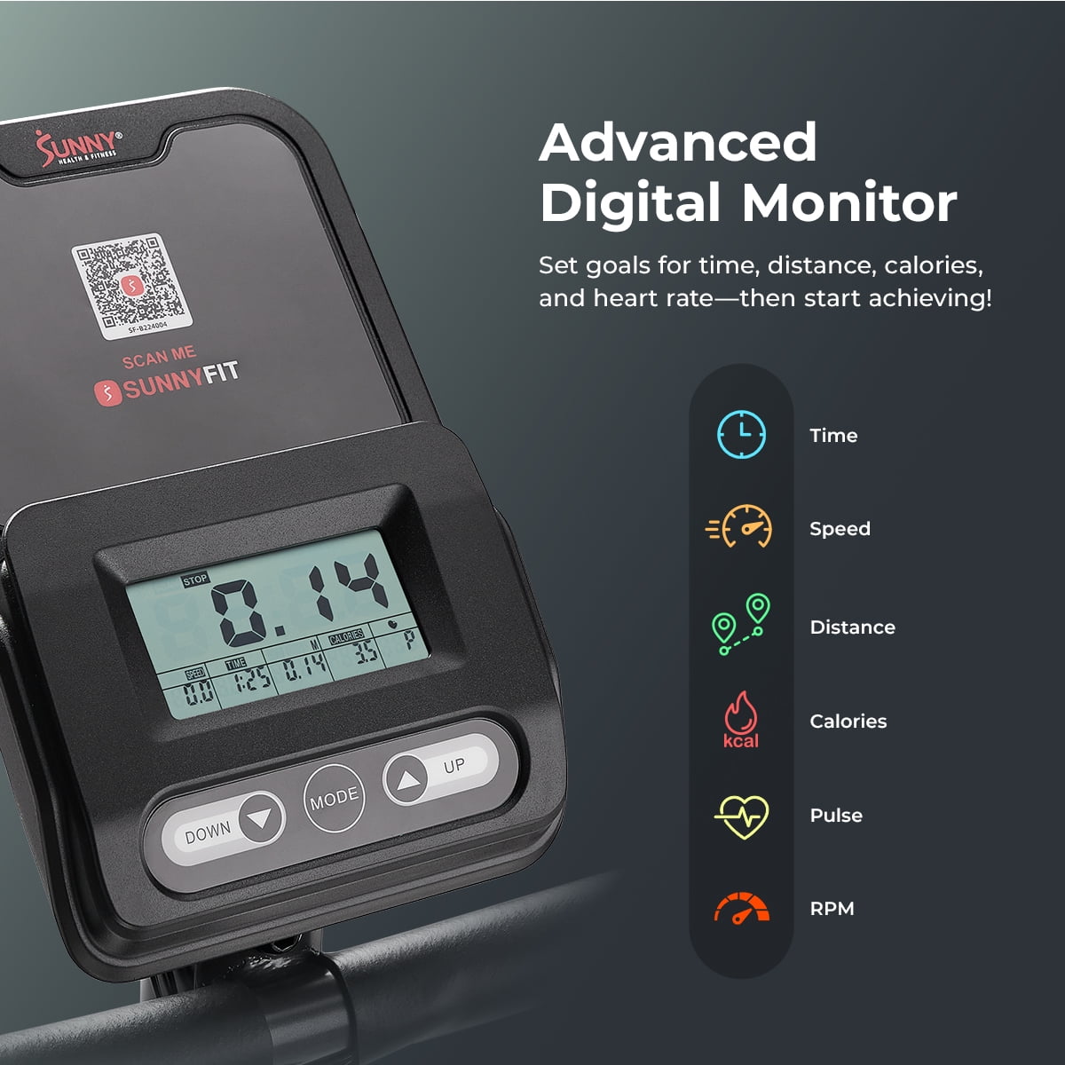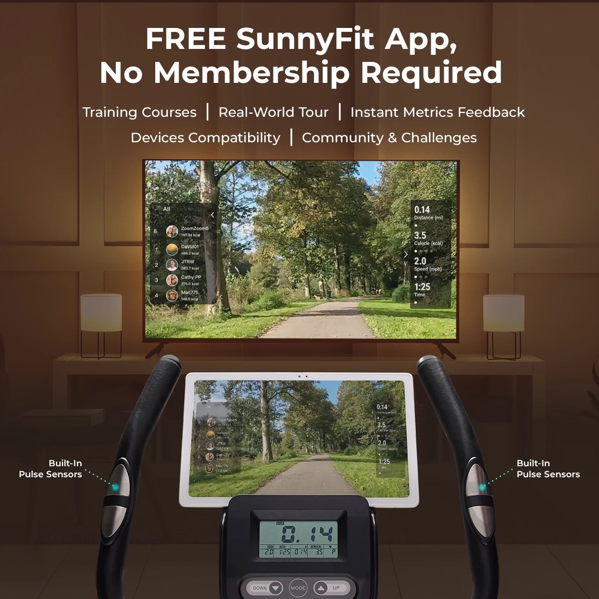 SMART FITNESS: Ride along with Sunny Health & Fitness expert trainers on the Sunny Health & Fitness SunnyFit® APP. Connect your preferred mobile device through Bluetooth and view your performance metrics in real-time. CONNECTED FITNESS: With Bluetooth connectivity, the free SunnyFit app allows you to access 1000+ free trainer guided workouts and hundreds of other fitness programs. Track your progress, set fitness goals, access personalized workout plans, 10,000+ virtual scenic tour simulation and compete with other community members to get to the top of the leader board. Have all the workouts of your choice right at your fingertips, while also feeling supported as a member of this likeminded community. LARGE FLYWHEEL: The internal 9 LB flywheel can generate more inertia than similar bikes in its class. This provides a smoother ride as it builds momentum for those intense stationary bike workouts. EXTRA LARGE SEAT: Measuring over 3 inches thick, the extra-large, padded seat provides unparalleled comfort and support for an indoor exercise bike. MAGNETIC RESISTANCE: Contactless resistance using internal magnets offers a much smoother and streamlined ride compared with felt, leather, or other types of contact resistance mechanisms. DEVICE HOLDER: Control your in-workout entertainment and learning experiences with the built-in tablet mount. Play your favorite movies or follow your favorite Sunny exercise workout videos. ADJUSTABILITY: Adjust the 4-way adjustable seat to find a position that works for you. Adjust the ground stabilizers to ensure the bike is even on in-home surfaces. HEART RATE SENSOR: Monitor your cardiovascular performance with the built-in pulse-sensing grips so you can actively check your workout progress, displayed on the digital monitor. BOTTLE HOLDER: Stay hydrated to be ready to exercise for extended training sessions.