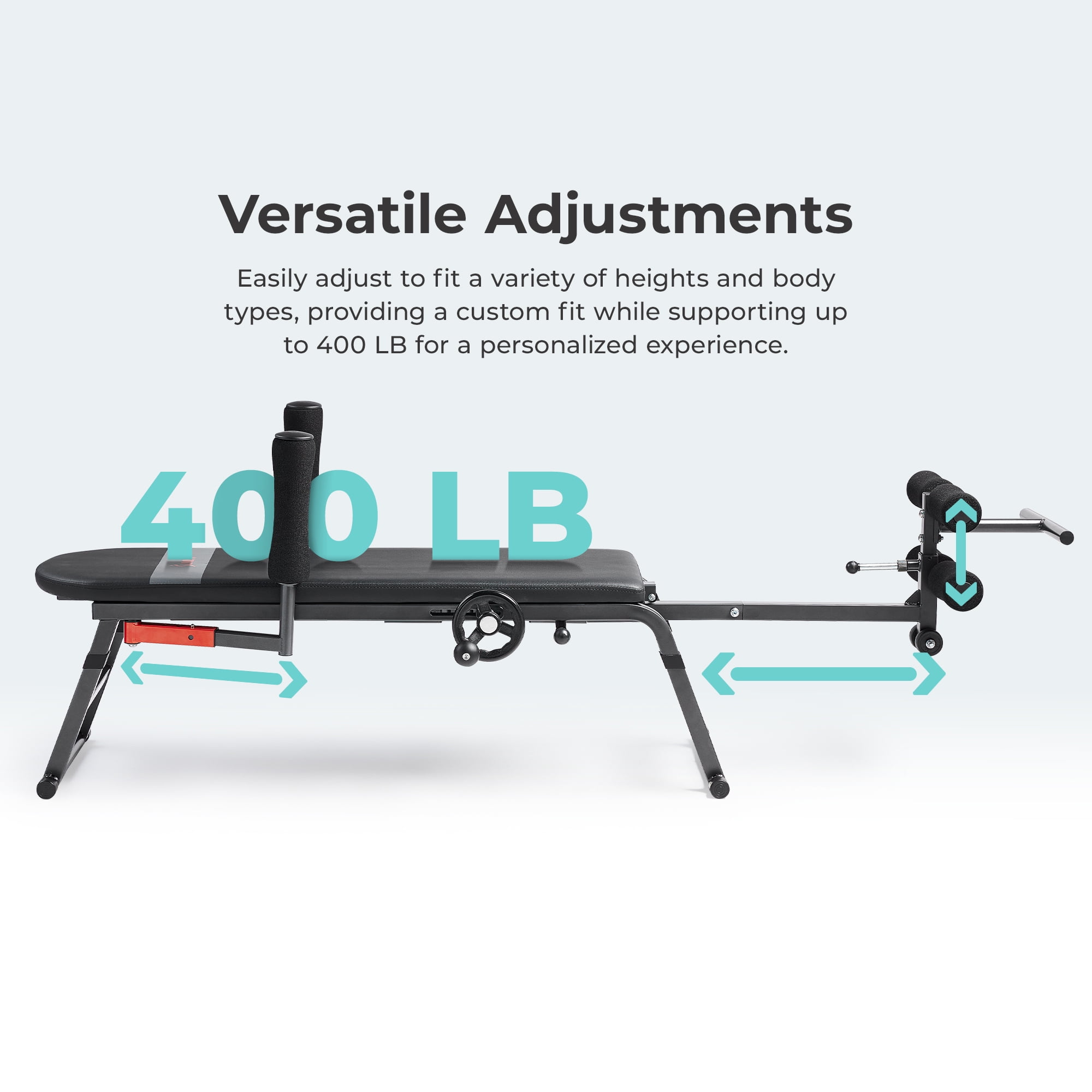 【FREE MEMBERSHIP】 Enjoy FREE access to the SunnyFit App with every Sunny Health & Fitness product—no membership fees! Dive into 1,000+ trainer-led workouts, explore 10,000+ virtual scenic tours, track your progress, challenge others, and much more! 【EFFECTIVE STRETCH & POSTURE IMPROVEMENT】Enhances lumbar stretching and posture correction while offering decompression and targeted back relief. Promotes improved flexibility and range of motion which reduces muscle tension. 【REHABILITATION & BACK PAIN ALLEVIATION】Excellent for rehabilitation, providing relief from back pain and fatigue caused by prolonged sitting. Supports recovery exercises for back injuries, promoting better blood flow to help the healing process. 【COMFORTABLE ALTERNATIVE TO INVERSION】Delivers inversion therapy benefits without the need to hang upside down reducing the risks typically associated with traditional inversion methods ensuring a safe and comfortable experience. 【SAFE, CONTROLLED DECOMPRESSION】Allows precise control over decompression, offering a safe stretch for all fitness levels without overextending for optimal results. 【ADJUSTABLE FOR VARIOUS HEIGHTS】Features easy adjustments to accommodate different user heights, supporting weights up to 400 LB, while maintaining proper alignment. 【SUPERIOR COMFORT WITH FOAM PADDING】Equipped with high-density foam for enhanced comfort and support, minimizing pressure points ensuring a pleasant experience for the user. 【EASY ADJUSTABILITY】Simple to adjust arm and leg settings for hassle-free usage and a personalized fit, accommodating various body shapes. 【COMPREHENSIVE SUPPORT RESOURSCES】Includes a detailed step-by-step manual, responsive customer service access, and instructional videos for optimal usage and setup. 【DURABLE FRAME DESIGN】Built with a robust and stable frame to ensure consistent, dependable performance for daily use. 【20+ YEARS OF EXCELLENCE】Sunny Health & Fitness, a U.S.-based company, offers top-quality equipment with a commitment to excellence. Our dedicated U.S. customer service team and certified trainers ensure a truly unmatched FIT FOR EVERYONE experience.