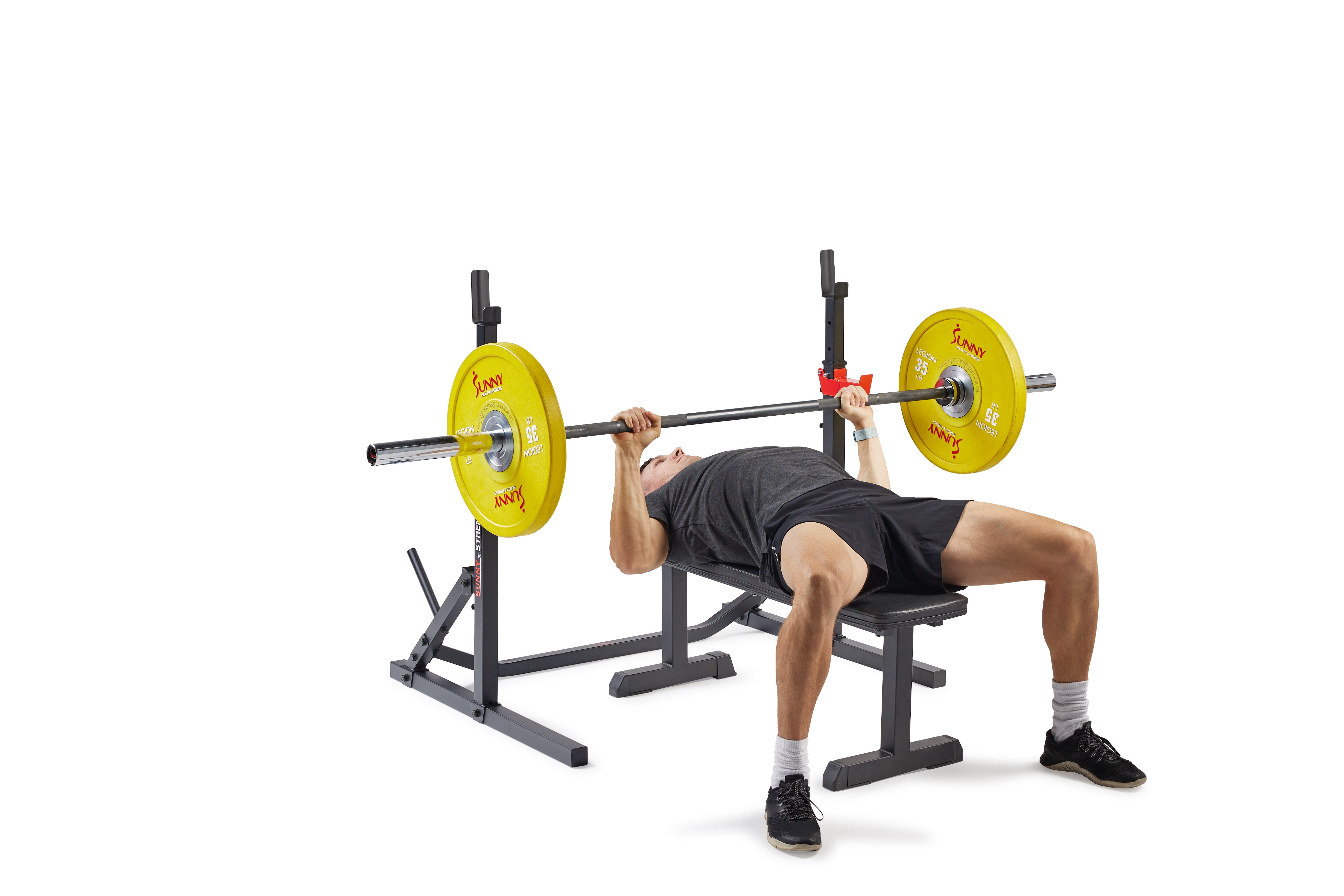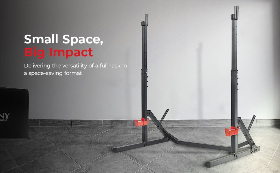 【VERSATILE STRENGTH TRAINING】Achieve full-body fitness with bench presses, squats, shoulder presses, incline bench presses, dumbbell rows, bicep curls, and deadlifts, targeting multiple muscle groups for comprehensive strength and endurance. 【SPACE-SAVING】Maximize your workout area with our space-saving design, offering the same versatile features as a full rack. Save space without compromising on functionality, making it ideal for home gyms and limited workout spaces. 【ROBUST STEEL FRAME】Experience unparalleled stability and durability with our seamless, one-piece steel construction. The steady steel frame ensures reliable support during intense workouts, enhancing your safety and confidence in every exercise. 【VERSATILE HEIGHT ADJUSTMENT】Easily customize your workout experience by adjusting the height to accommodate exercises. This flexibility ensures optimal positioning, allowing you to perform exercises with precision and comfort. 【ENHANCED SAFETY AND SUPPORT】Our spotter arms provide top-to-bottom protection, offering a secure safety net during exercises, from the bench press to deadlifts. Push your limits with confidence, you have reliable backup to catch the weight. 【WEIGHT STORAGE】Stay clutter-free and focused on your workout with our integrated weight holder rack. Safely store your weights within arm’s reach, ensuring quick and convenient access. 【600 LB WEIGHT CAPACITY】With a maximum weight limit of 600 LB (275 KG), our equipment ensures robust durability and stability, accommodating users of varying fitness levels. This allows for challenging workouts and supports heavy lifting. 【EFFORTLESS ASSEMBLY】Experience hassle-free setup with our user-friendly design. Easy assembly means you can quickly enjoy your new fitness equipment, saving time and energy while ensuring a smooth start to your workout routine. 【USER-FRIENDLY ADJUSTMENTS】The rack features easy-to-use level hole indicators, simplifying bar adjustments and spotter arm positioning. Making it quick and straightforward to customize your exercises for an efficient training session. 【Sunny Health & Fitness Commitment】A top fitness brand for 20+ years, offers superior products and a dedication to excellence. Count on our committed customer service and enjoy peace of mind with a 1-year warranty on the structural frame.