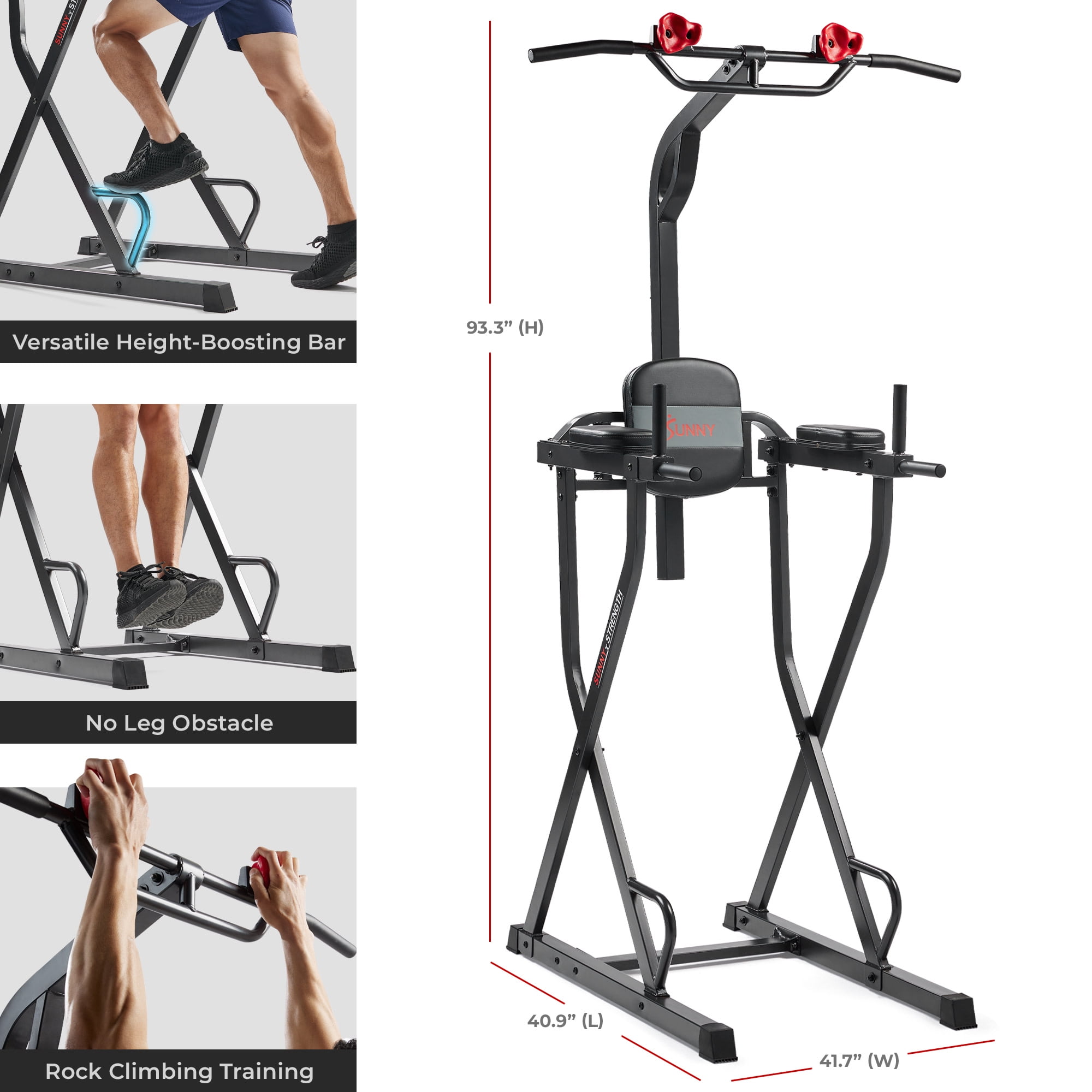 【MULTI-FUNCTIONAL EXERCISES】Perform leg raises, captain’s chair bike crunches, straight leg lifts, oblique crunches, push-ups, pull-ups, chin-ups, triceps dips, bouldering grip training and more in this total home gym. 【STABLE X-FRAME DESIGN】Experience enhanced stability with our patented X-shaped frame, surpassing traditional designs. Say goodbye to wobbling and noise, allowing you to use this product in your home without disturbing others. 【BUILT-IN CLIMBER HOLD GRIPS】Elevate your climbing skills with our integrated rock-climbing grips, perfect for mastering your bouldering skills from the comfort of your own home. 【10-LEVEL HEIGHT ADJUSTMENTS】Easily adjust the pull-up bar height from 73 to 91 inches with a simple twist-and-pull knob, in 10-level increments. The pull-up bar is adjustable and removeable, offering versatility in an upright position. 【COMFORTABLE CAPTAIN’S CHAIR】Strengthen your core and abs with leg raises, crunches, and holds on the slightly angled back rest. With added armrest padding, perform your core workouts with ease. 【DIP STATION】Ideal for sculpting upper body muscles, this total home gym supports dynamic dips for triceps, chest, and shoulder development. Try bodyweight rows, knee raises, L-sits and other calisthenic exercises. 【VERSATILE HEIGHT-BOOSTING BAR】The height booster bar offers convenient support, enabling you to reach greater height with ease, which also works as push-up bar for optimize your form during your exercises. 【DURABLE CONSTRUCTION】Built to endure, our power tower boasts a robust construction, enduring stability for up to 330 LB. Designed for strength and durability to support your journey to peak fitness levels. 【QUALITY GUARANTEE】We rigorously tested our total home gym system to safely hold users up to 330 LB and back up our quality with confidence and a 1-year warranty on the structural frame. 【20+ YEARS OF EXCELLENCE】As a premier brand, Sunny Health & Fitness delivers top-notch equipment dedicated to excellence. With our devoted support team and certified trainers, enjoy an unmatched FIT FOR EVERYONE experience.