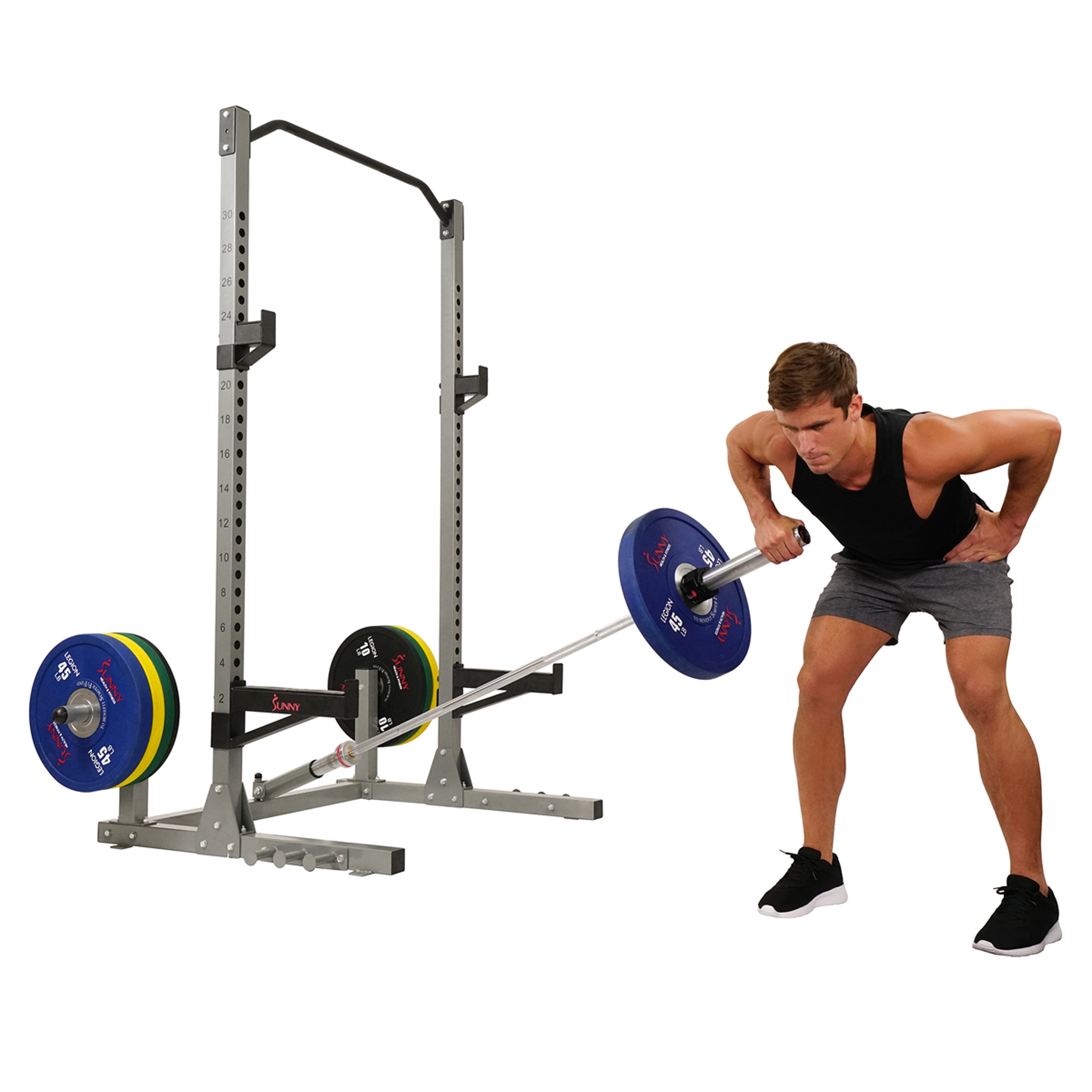 Take your home gym to the next level with the Sunny Health & Fitness BH6802 Power Rack. The full functional power rack is designed with a small footprint in mind to tackle the big workouts of the day. Combine the Sunny Health and Fitness bars and bumper plates and perform workouts to target and strengthen muscles across your body. The powder-coating, durability, and utility are designed seamlessly into the power rack to fully support weight and power lifting workouts. The compact gym rack lets you work out right in the comfort of your own home or garage. The result: A fully loaded power rack with features such as the included 360° swivel built-in landmine post, raised height pull up bar, exercise band attachment points, durable J-hook and Spotter arms, as well as more than 30 adjustment points to fit people of all sizes. The squat rack is built with ample room to provide easy side-to-side movement. Now you can perform squats, curls, shrugs, pull ups, pushups, and more. Your takeaway: A well-designed and small footprint rack that will help you build the Rome that is your body. We all know Rome wasn’t built in a day. Your body won’t be either but the Sunny Power Rack will help you get there one day at a time. Whether you are an experienced powerlifter, bodybuilder, or someone just starting out on their strength training journey, this power rack can keep up. Unleash your inner beast with the SF-BH6802 Power Rack by Sunny Health and Fitness. Hardware peg hole diameter: 1 in.