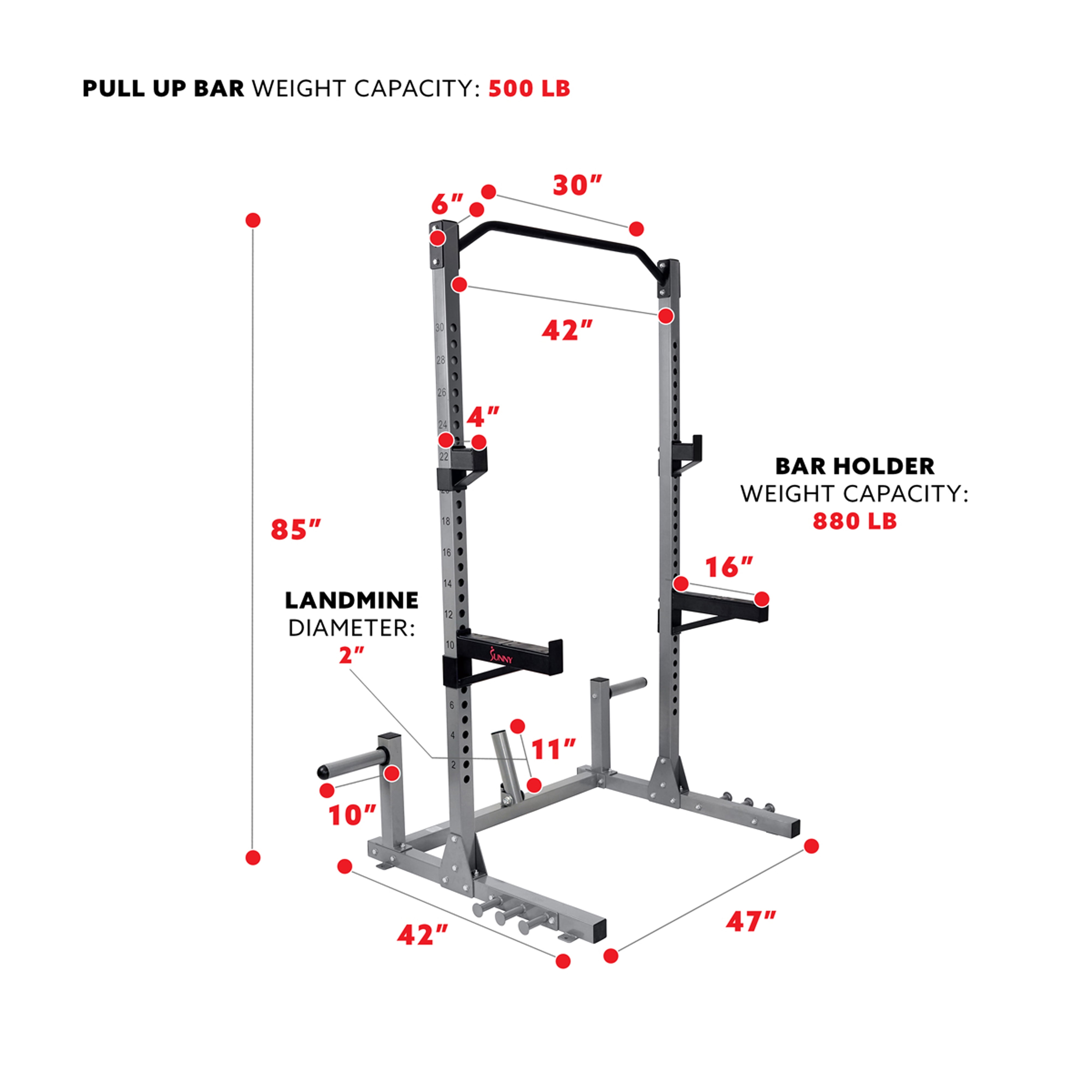 HEAVY DUTY FRAME: Supports up to 880 lb. Product Dims: 42L X 47W X 85H inche. Easy Assembly with bolt-together design. VERSATILE: Included landmine barbell attachment for greater utility and usage during resistance training exercises like landmine squats, lunges, rows, and rotational exercises such as landmine standing antirotations. KNURLING: Knurled grip on pull up bar providing extra grip in strenuous/slippery workout sessions. Exercise band attachment points to better increase strength and endurance. CONVENIENCE & SAFETY: 16” spotter arms for ease of mind and safety assurance when squatting with heavier weights. OLYMPIC PLATE STORAGE: Easily organize weights on the rack while adding extra stability when utilizing the machine. Freestanding design with optional bolts in brackets for stability and versatility.