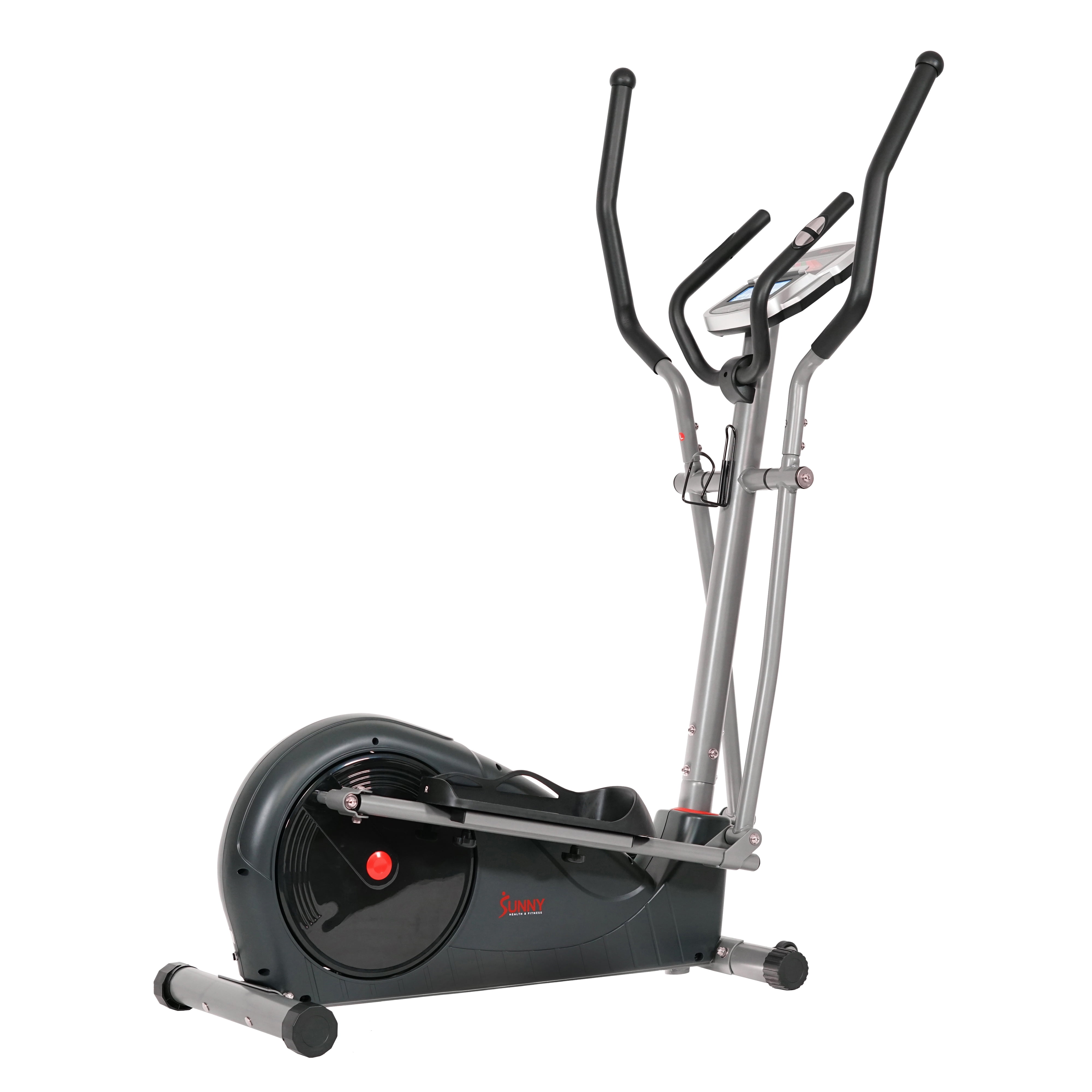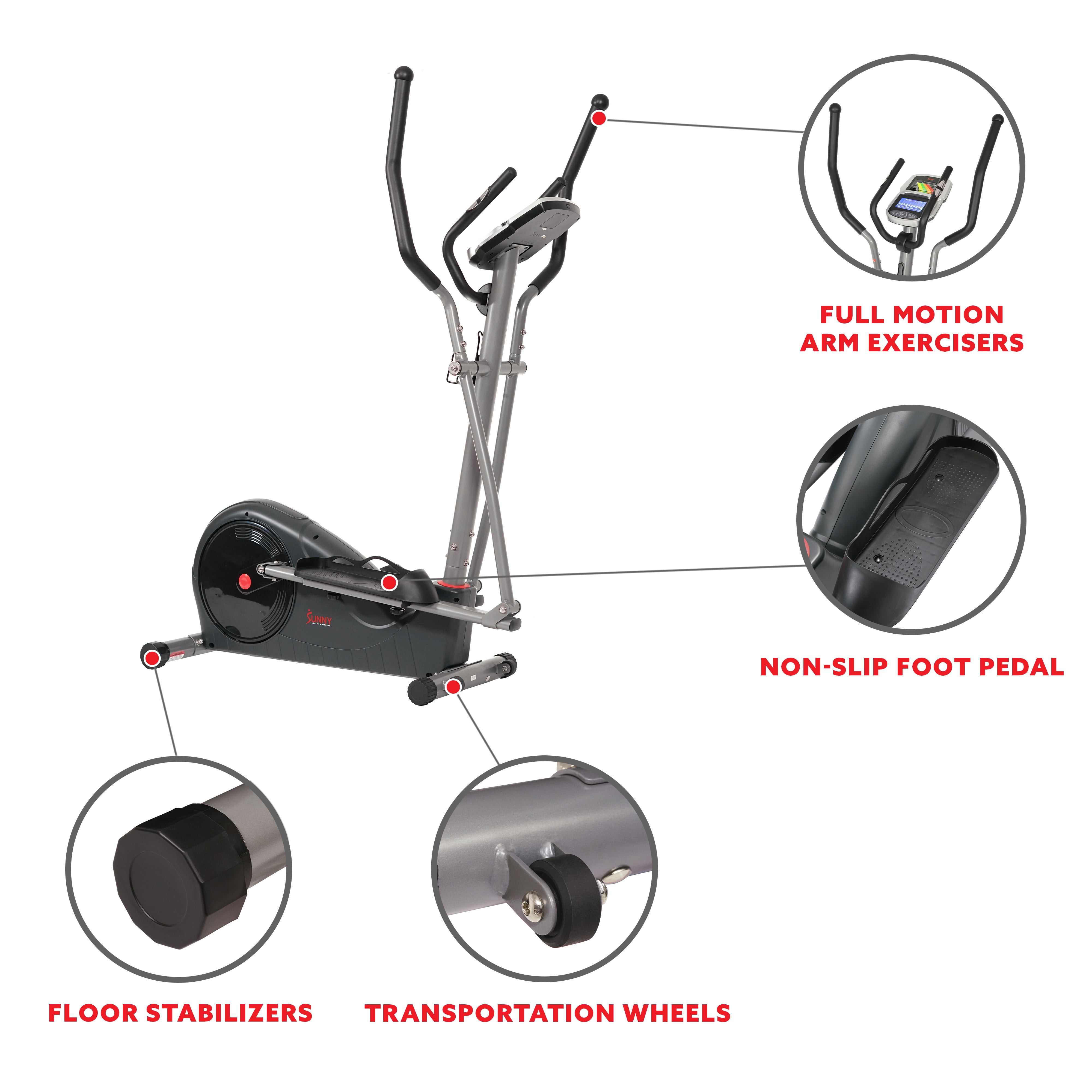 PERFORMANCE MONITOR: Stay informed and up to date on your fitness. The SF-E320002 monitor displays: Speed, RPM, Time, Distance, Odometer, Calories, WATT, Heart Rate, Target Heart Rate, Program and Resistance Level. ELECTROMAGNETIC RESISTANCE: A change of pace is just a push of a button away with the electromagnetic resistance. Cycle through 16 progressive resistance levels to push your full body workouts to the limit! CUSTOMIZED FITNESS: Workout and train the way you like. 24 different elliptical training programs to suit and match your fitness goals. FOOT PEDALS: Extra wide textured foot pedals provide adequate grip for the most intense workouts. Stride in confidence and never lose your footing! FLOOR STABILIZERS: Never have a wobbly or shaky elliptical workout again with the SF-E320002 Elliptical’s floor stabilizers. TRANSPORTATION WHEELS: Tilt and roll for use or away for easy storage with convenient transport wheels. DEVICE HOLDER: Place your tablet, phone, or other mobile device to stay connected. Follow along online with our Sunny Health & Fitness trainers for certified fitness tips, advice, and lessons.