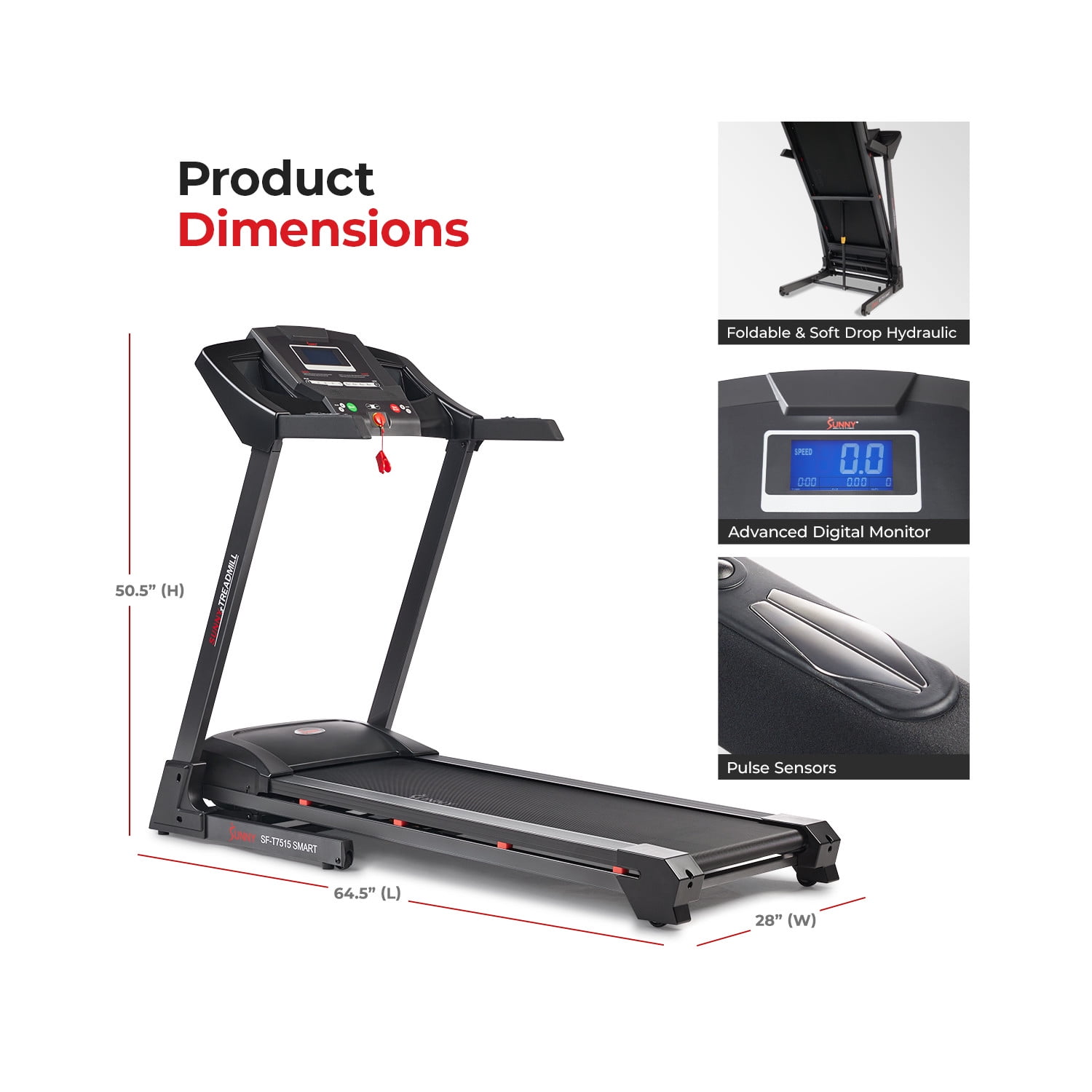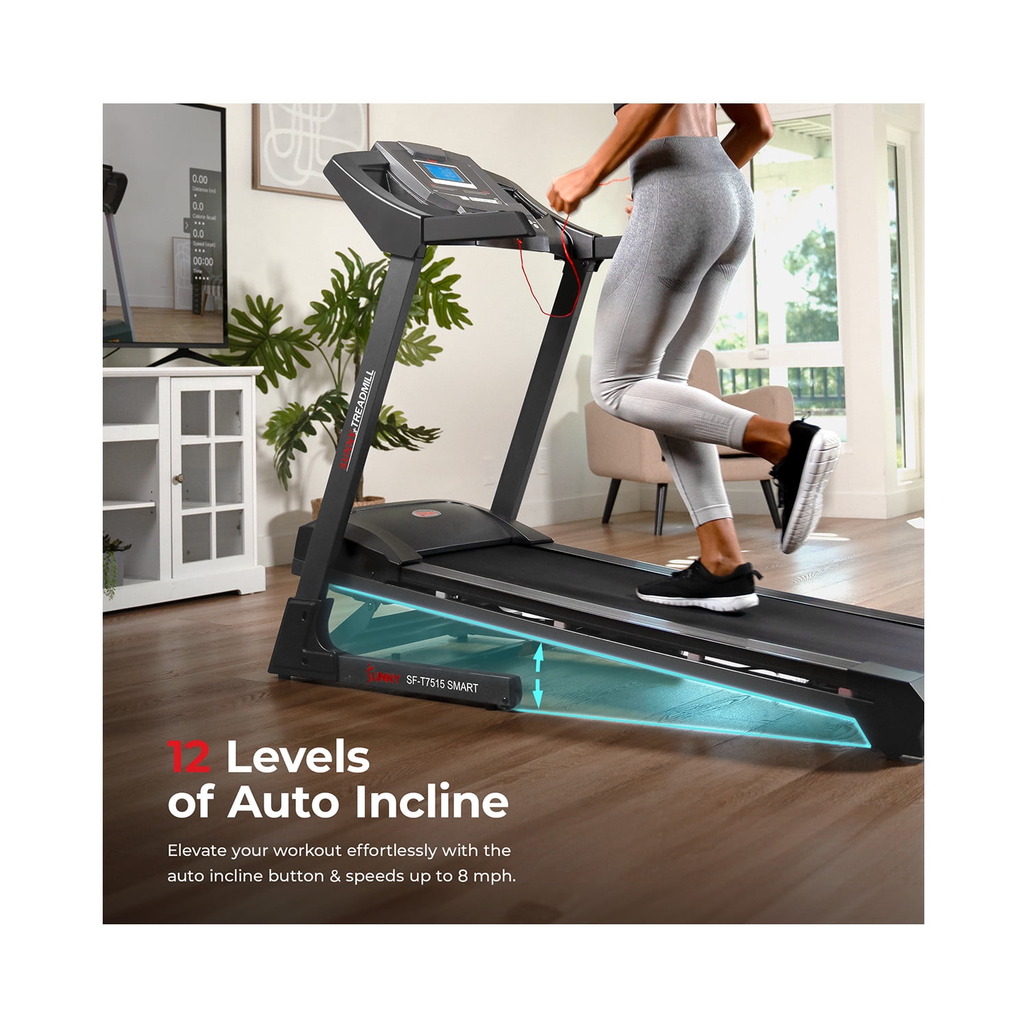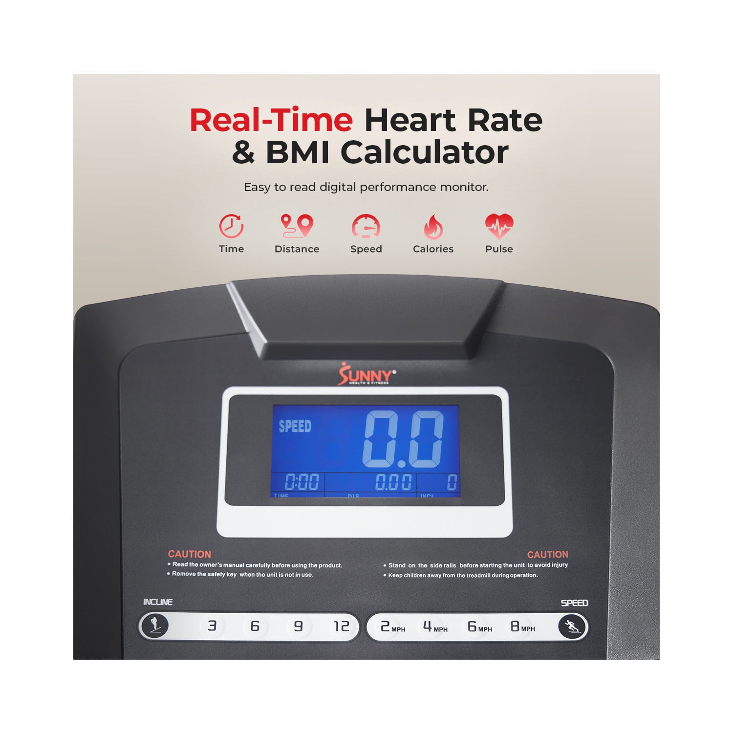 【FREE SUNNYFIT® 】 Take your workout to the next level, FREE App membership w every Sunny products. Explore 1,000+ trainer led workouts, 10,000+ virtual tour simulation, challenge other Sunny members, track your progress, tailored workout and more! 【12 INCLINE LEVELS & QUICK BUTTONS 】Enjoy 12 incline options (0-12%) on the treadmill, effortlessly achieving fitness goals. Elevate your workout effortlessly with the auto incline button. Adjust the incline level easily for a challenging session. 【DOUBLE DECK TECHNOLOGY】Enjoy the stability of the double deck running surface, benefit from the integrated shock absorption system, relish the comfort of the cushioned design, and receive unparalleled support for low-impact training. 【12 PRE-SET WORKOUTS】This high intensity interval training machine provides challenging workouts for users of all fitness levels. The varied intensity levels allow you to burn more calories fast as you progress from beginner to advanced. 【CONVENIENT SPEED BUTTONS】Quick access to 2mph, 4mph, 6mph, and 8mph. Discover the versatility of speeds, reaching a maximum of 8 mph. Whether you’re a beginner or a seasoned runner, effortlessly select the perfect pace. 【PERFORMANCE DIGITAL MONITOR】Pulse Sensors enable real-time heart rate tracking during exercise, helping you maintain optimal intensity for your fitness goals. Also track workout duration, speed, calories burned for your health goals. 【EASY SET-UP & FOLDABLE DESIGN】Set-up in around 20 minutes. It folds up smoothly and safely with a soft hydraulic drop mechanism, allowing for hands-free folding and unfolding. The transport wheels make it easy to move and store effortlessly. 【Sunny Health & Fitness Commitment】A top fitness brand for 20+ years, offers superior products and a dedication to excellence. Count on our committed customer service and trainers for the best fitness experience.