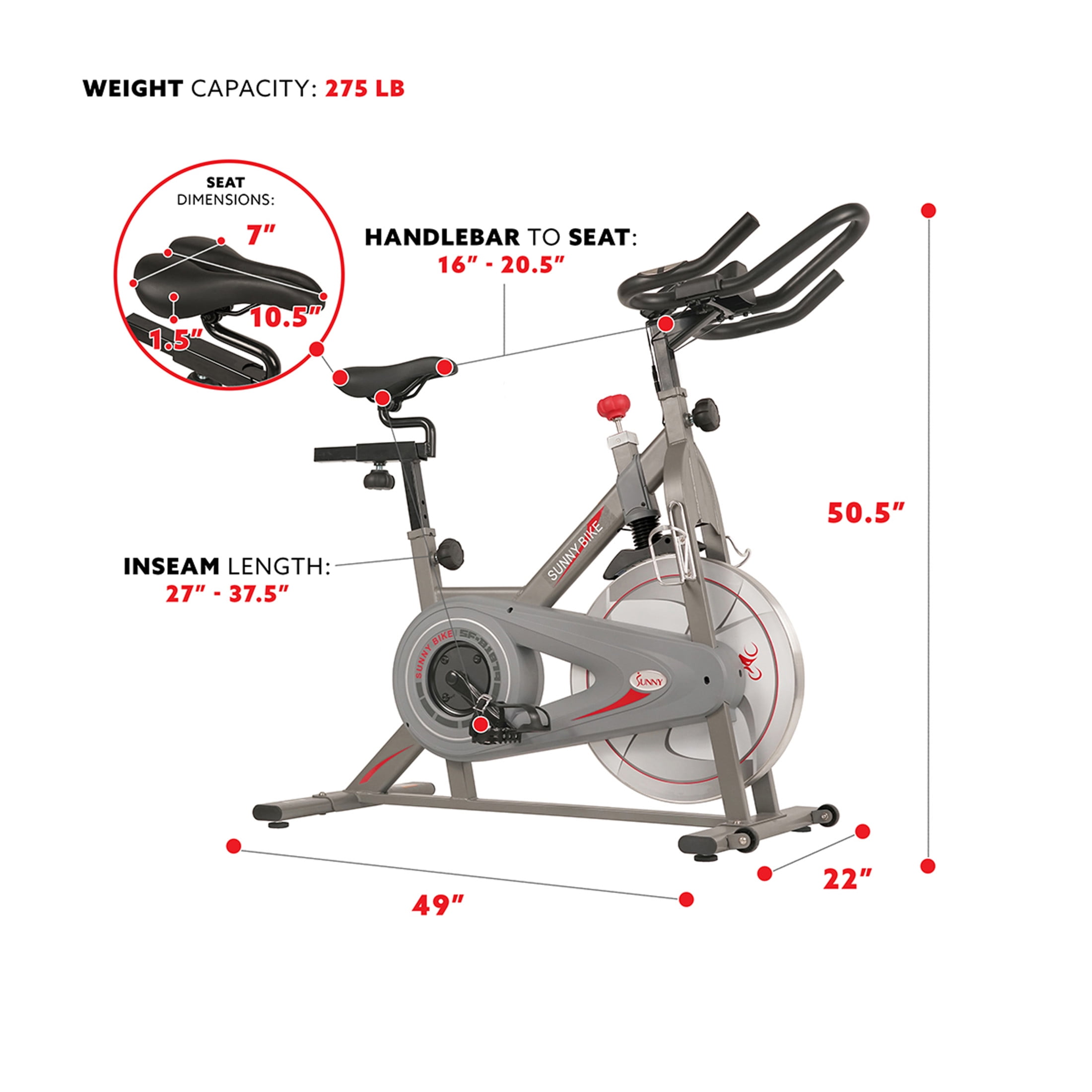 【FREE SUNNYFIT® 】 Take your workout to the next level, FREE App membership w every Sunny products. Explore 1,000+ trainer led workouts, 10,000+ virtual scenic tour simulation, access exclusive in-app social communities & leaderboards and more! 【30-LB FLYWHEEL】The swift 30-pound flywheel will make it easy to get your exercise cycling routine started, while also maintaining speed and consistency as you pedal. The cast-iron make prevents any issues with pulleys or loud sounds. 【SILENT AND SWIFT RIDE】Built with a modern near-silent belt-drive mechanism to give a smooth and consistent performance, removing any distractions as you work out no matter the time of day even when people are sleeping. 【MAKE YOUR SUNNY BIKE SMART】Transform your bike into a smart bike with our CB110 Cadence Sensor (sold separately). Easily track all your cycling metrics. Connect with the Free Sunnyfit App and access 1,000+ workout videos that syncs with your ride. 【PERFOMANCE MONITOR AND TABLET MOUNT】The LCD lets you check your speed, distance, RPM, pulse, and calories-burned at just a glance as you ride on your exercise cycle. Use our SunnyFit App with the tablet mount to ride with our free workout videos. 【MAGNETIC RESISTANCE】The integrated magnetic resistance puts you in full control of your workout intensity. It delivers consistent performance that makes your workout easy when you want it, hard when you need it. 【PULSE-SENSING HANDLES】Monitor your cardiovascular performance with the built-in pulse-sensing grips so you can actively check your workout progress, displayed on the stationary bike performance monitor. 【DESIGNED FOR YOU】Soft, comfortable 2-way adjustable handlebars and 4-way adjustable seat lets you adjust your indoor bicycle to match your frame. The caged foot pedals can also be adjusted to fit your shoes, ensuring a comfortable ride. 【EASY TO USE】Intuitive dial to turn for resistance, emergency brake by pressing the dial, bottle holder, and dumbbell holder let you ride with ease. Built with transport wheels to make moving around a breeze, no matter the space. 【HEAVY DUTY & SAFE BUILD】Designed with strong and sturdy materials for optimal stability while cycling and supports users up to 275 LB, made to provide you with a safe experience. Adjustable features, 30 LB flywheel, and more to keep users safe. 【PREMIER U.S.-BASED BRAND】With 20+ years of excellence, Sunny Health & Fitness delivers top-notch equipment dedicated to excellence. With our devoted support team and certified trainers enjoy an unmatched FIT FOR EVERYONE experience.