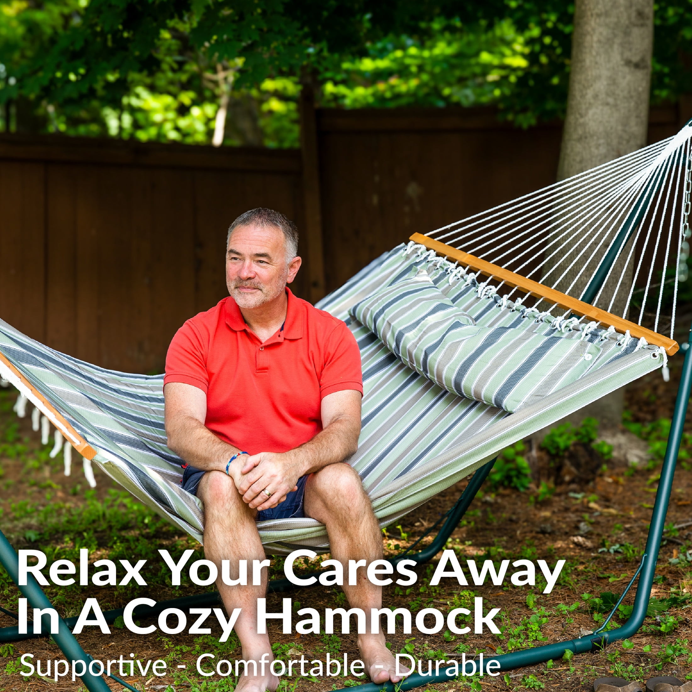 Create a place to relax with this extra comfortable, 2-person, quilted fabric cushion and spreader bar hammock. This cozy, large hammock features a polyester cover and polyester fiber fill as well as a colorful and vibrant print. The print is dye-treated to be UV resistant, so it is sure to stay bright and inviting for years to come despite standing in the sun. This spreader bar hammock is a great addition for the patio, backyard, deck, campsite, park, or any other outdoor area. This backyard hammock can be easily hung from two trees or posts that are 11′ to 15′ apart. No trees? No problem! With a Sunnydaze 12′ or 15′ hammock stand (stand not included), this fabric hammock can be used anywhere. Get cozy with a book, a friend, some snacks, or take a nap out in the outdoors with this vibrant and fun spreader bar hammock.