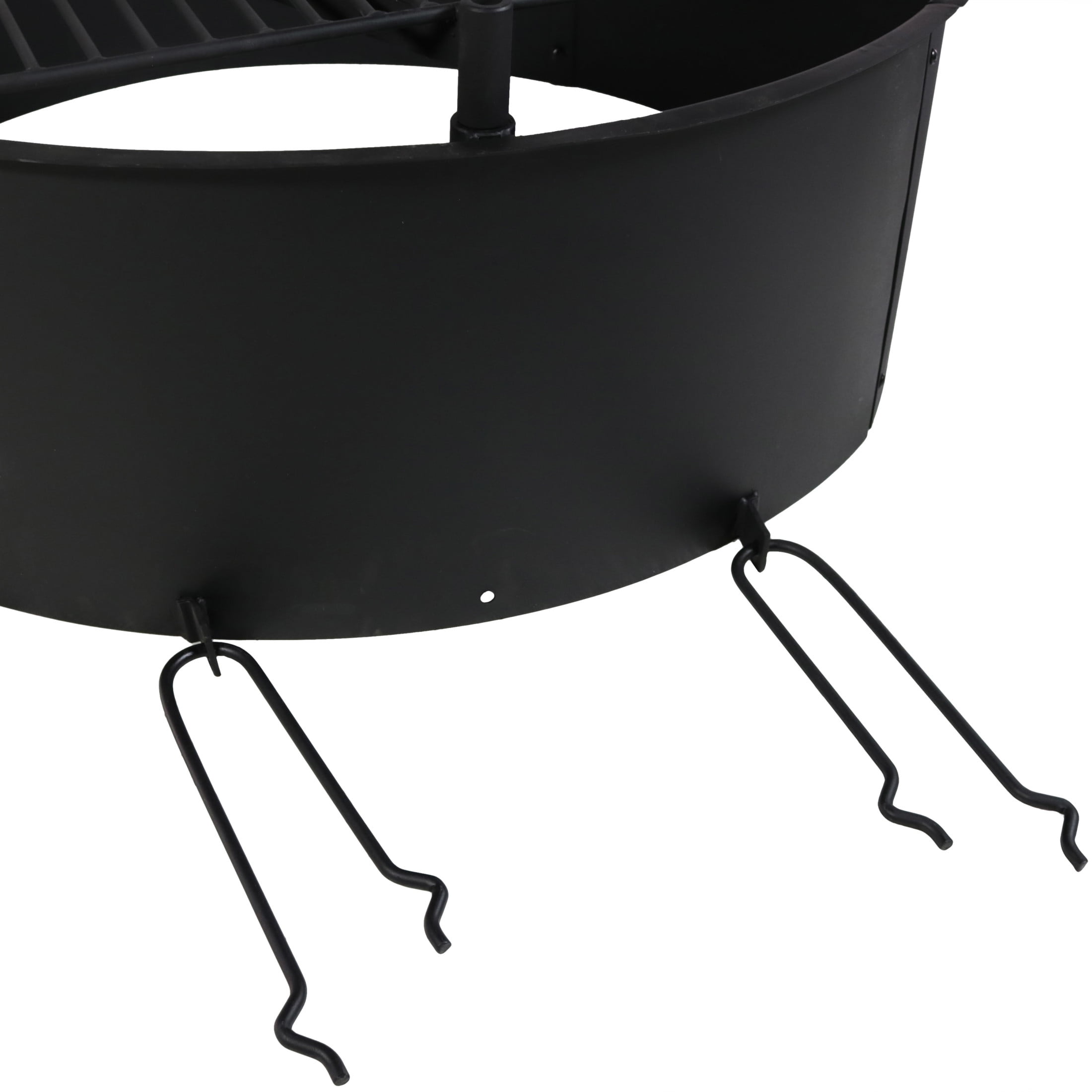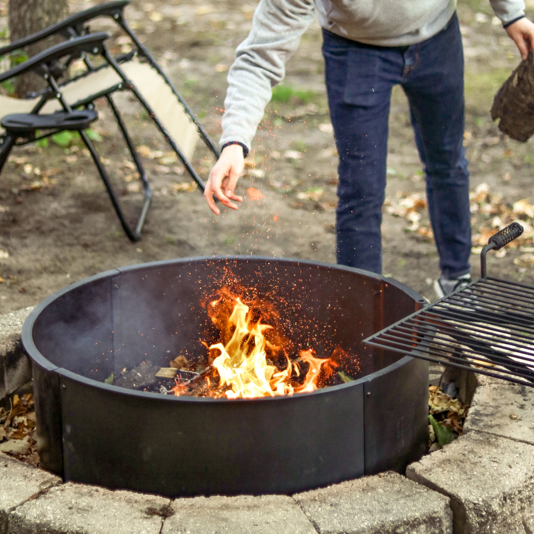 Simple to set up and easy to use, this campfire ring is great for use in the backyard, at the campsite, at the cabin, or anywhere else a beautiful fire pit ring for some extra warmth and cooking space is desired. This outdoor campfire ring and rectangular 360-degree swivel cooking grate system is sure to add warmth and function to any outdoor area. This campfire ring is sure to be a gathering space for family and friends for BBQs, smores, and hangouts during long summer nights. Each ring and cooking grate set features a durable steel construction with a black high-temperature paint finish that will ensure it lasts through many seasons. The simple 4-piece design comes with everything needed to have a great fire right out of the box. Each set includes a rectangular detachable cooking grate, a 4-piece campfire ring, a poker to safely maneuver firewood, 2 anchors to secure the ring to the ground, and a handle to easily swivel the cooking grate away from or towards the flames.