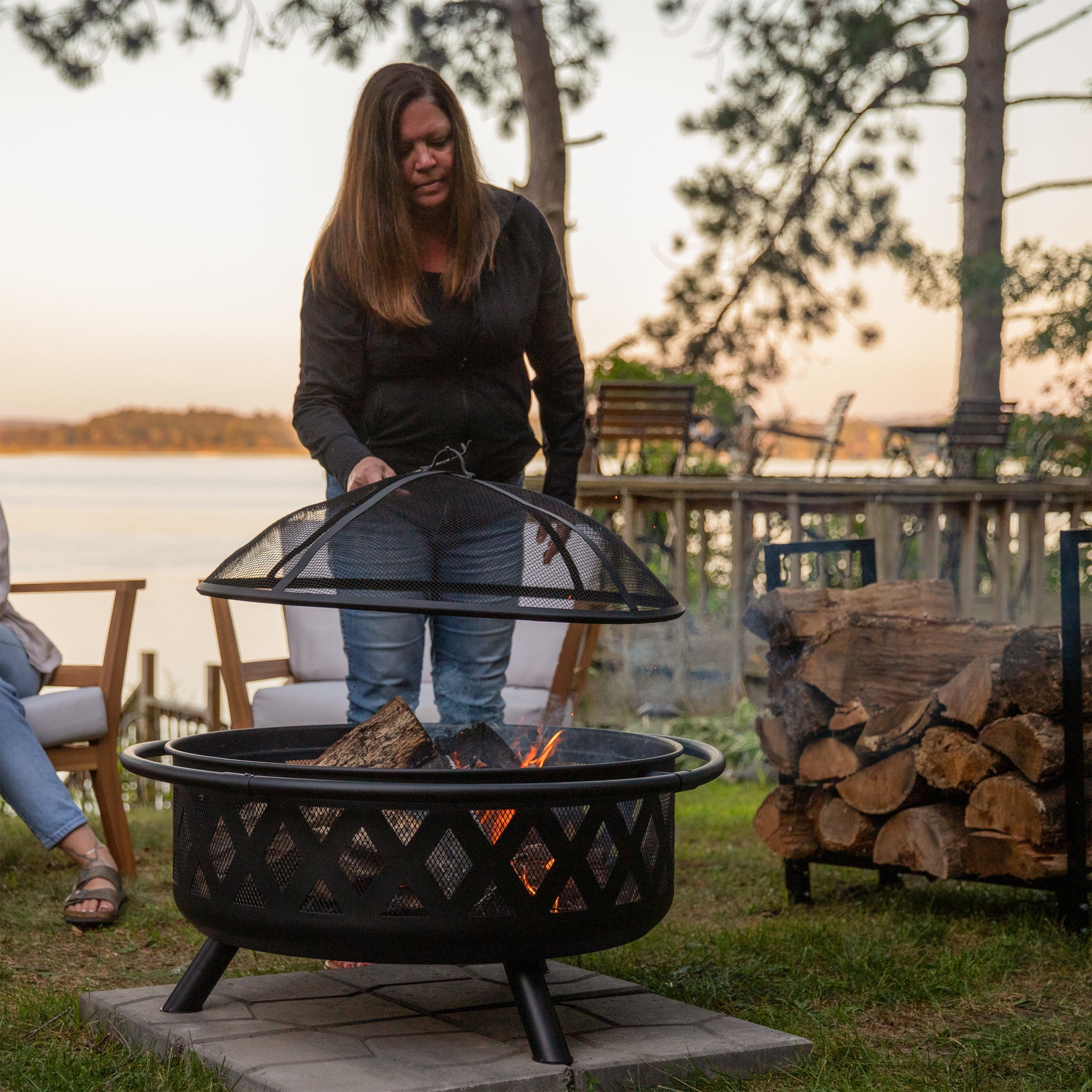 This firepit for outside provides ample room for a bonfire with family and friends on any patio, yard, or campsite. This round fire pit is also easy to tend to and clean. The overall fire pit rim to rim is 36″ in diameter with a large 31″ diameter x 11″ deep bowl that is accented with a decorative crossweave pattern that glows at night to add style and charm to any outdoor space. This fire pit bowl comes with a mesh spark screen to keep flying embers contained and a log poker to easily maneuver the wood inside the pit safely. It also includes a cover to protect the fire pit from exposure to the elements when not in use. This is a wood-burning fire pit and is not designed to burn on a deck unless a fireproof pad is used. Enjoy this sturdy steel fire pit with the decorative design in any backyard or patio today.