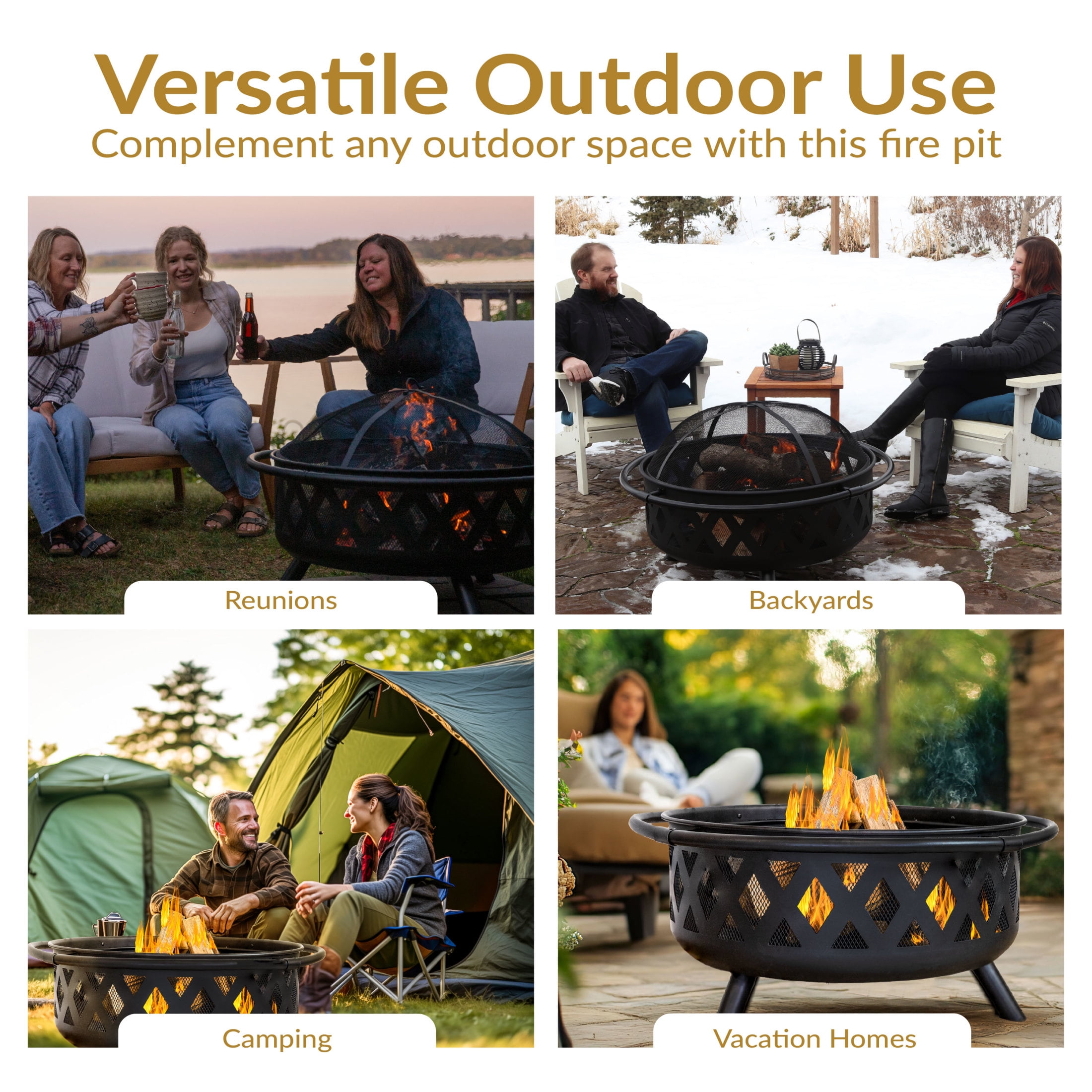 Sunnydaze Crossweave 36″ Round Wood-Burning Black Finish Steel Outdoor Fire Pit with Screen