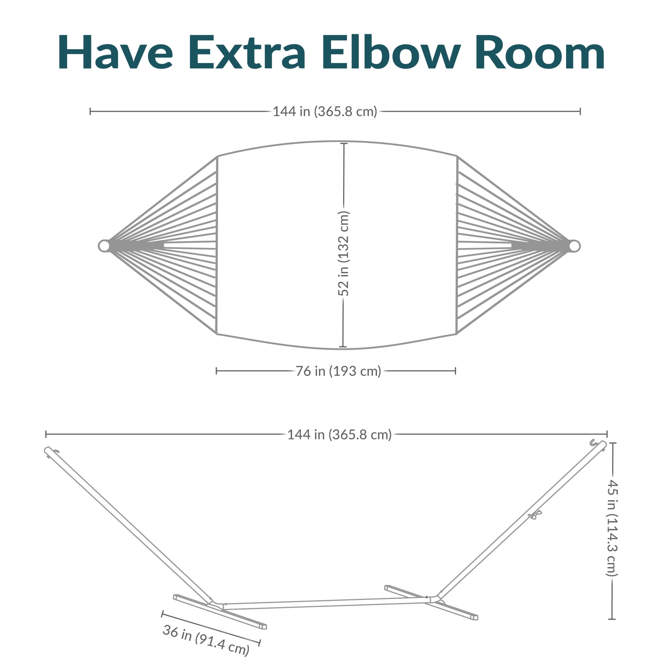 SPACE-SAVING SIZE: This comfortable outdoor hammock measures 144″ W x 52″ D overall and weighs 36 lbs. The rope hammock bed measures 76″ W x 52″ D and has a 275 lb weight capacity. The hammock is 115.5″ W from loop to loop. The heavy-duty hammock stand measures 144″ W x 36″ D x 48″ H and weighs 25 lbs. The included hammock pad measures 74″ W x 52″ D, and the pillow measures 24″ W x 9.5″ D x 6.5″ H. READY TO RELAX: This freestanding hammock set is weather-resistant and includes a heavy-duty 12′ steel stand, a polyester sleeping pad and pillow with a polypropylene fiber fill and a rope hammock. EASY ASSEMBLY: This backyard hammock with stand comes with two metal hanging chains and two metal O-rings, making it easy to set up as soon as it arrives. The hammock pad is easy to attach using the fabric ties. Enjoy this relaxation set on the patio, deck, or yard. DURABLE DESIGN: The hammock pad is made from weather-resistant, solution-dyed acrylic fabric with an inner poly quilting for added comfort and relaxation. WORRY-FREE PURCHASING: Sunnydaze Decor backs its products with a 1-year manufacturer’s warranty.