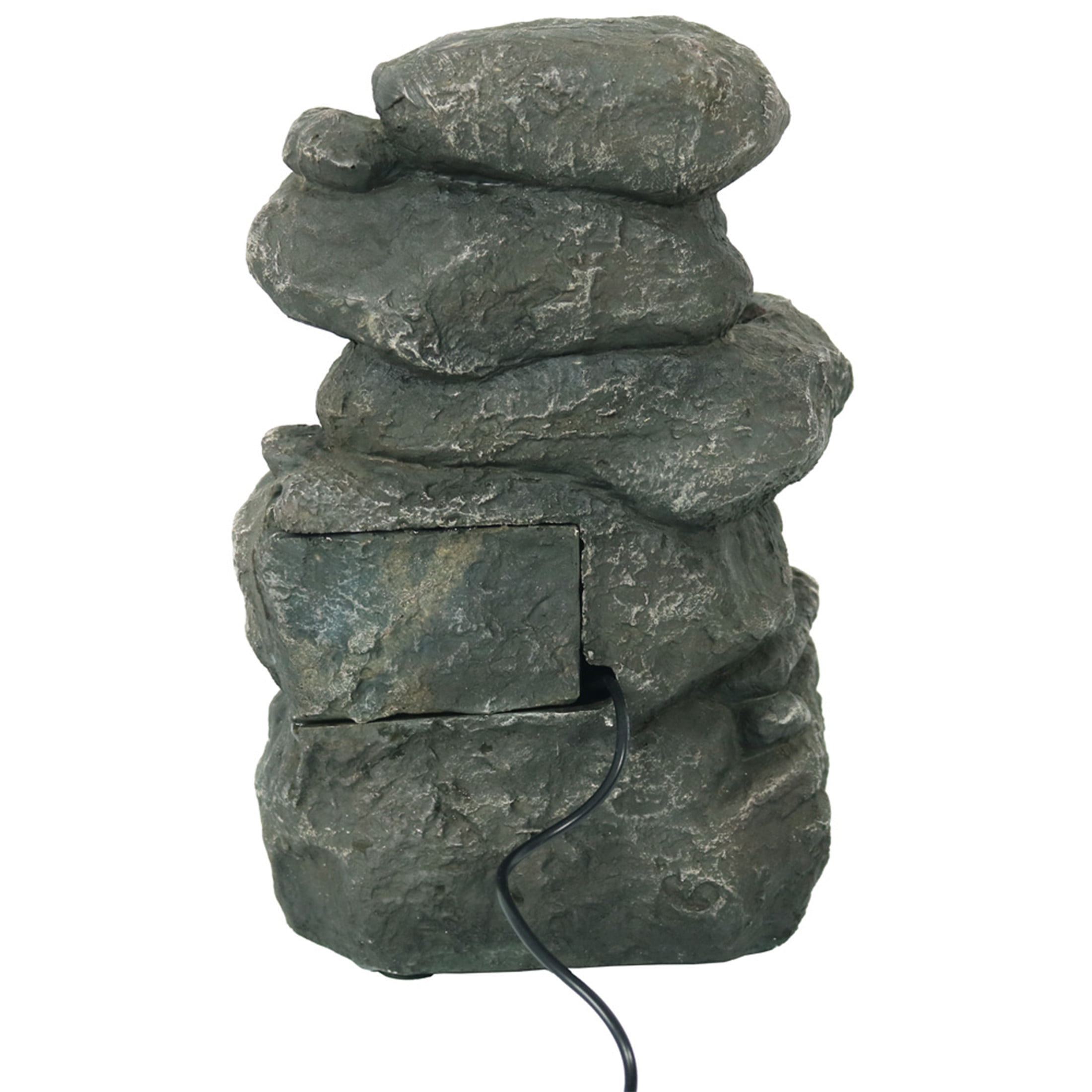 Made from durable polyresin and fiberglass to look like real stacked rocks, this fountain creates the striking views and soothing sounds of nature. This small fountain is a wonderful accent for any room in the home. Its durable material mimics the look of natural stone, but with a convenient lightweight and easy-to-maintain construction. The included electric submersible fountain pump allows the gently flowing water to trickle down from the top tier to collect in the bottom pool where it continuously circulates back through the fountain. This indoor, tabletop fountain features padded feet to protect surfaces against scratching. It also features an authentic, natural coloring and LED lights on the 1st, 2nd, and 3rd tiers so everyone can appreciate this tabletop fountain’s beauty during the evening, even as the sun goes down. This decorative fountain can be enjoyed on a desktop, entryway table, end table or anywhere within the comforts of one’s home or office.