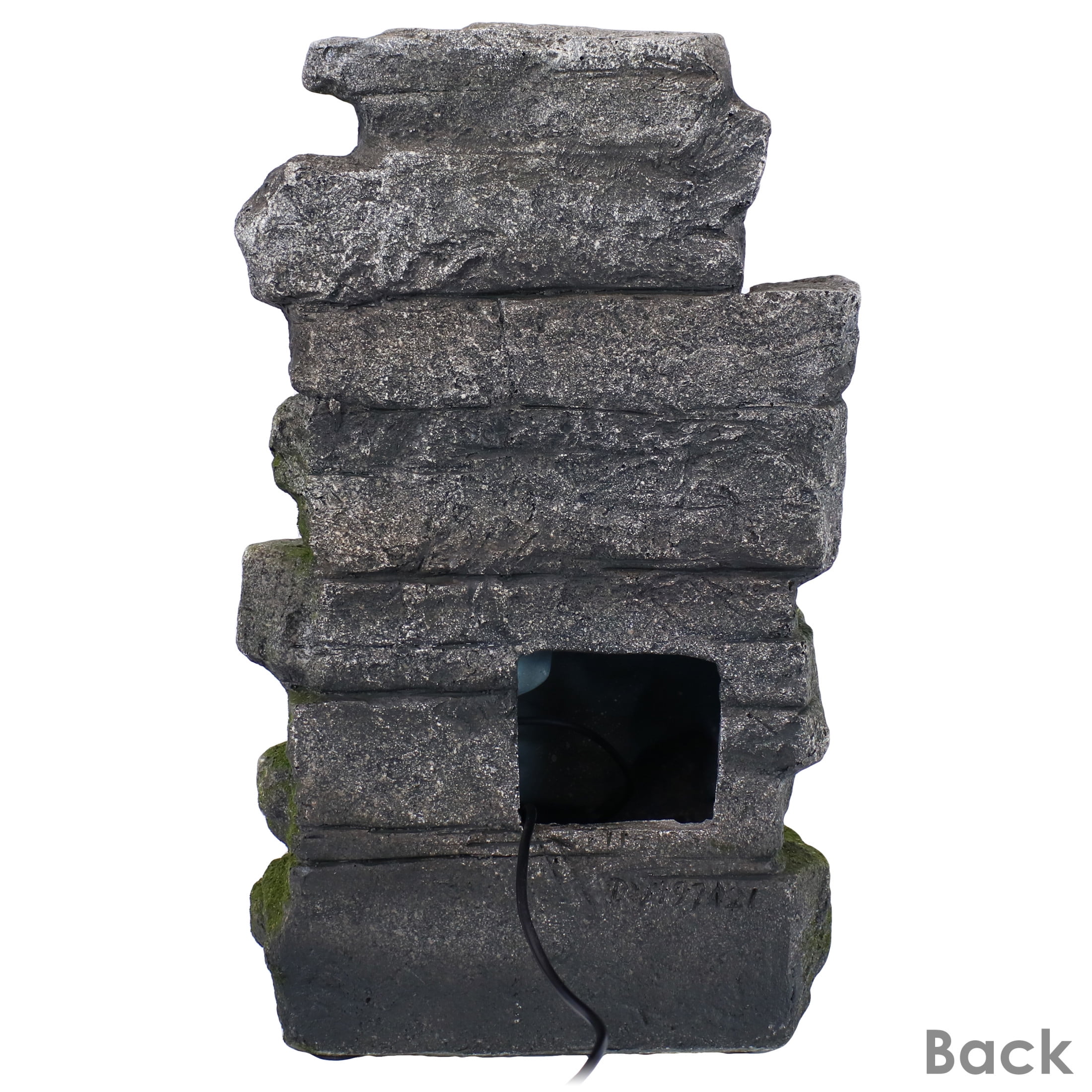 Bring the tranquility of a peaceful, rocky waterfall into a home or office with this indoor tabletop water fountain. Durably constructed of polyresin, this material beautifully replicates the color and texture of natural stone yet is easy to clean and maintain. This indoor water feature has built-in LED lights that beautifully illuminate the falling water for added appeal for nighttime relaxation. This fountain is also very simple to put together. It includes 1 tabletop fountain and 1 electric submersible pump that continuously circulates the water, eliminating the need for complicated plumbing or installation. This fountain features rock-like elements to accentuate its natural accents. The small waterfalls replicate water gently flowing down mountain slopes. Place this feature in the office, kitchen, living room, bedroom, or any other environmental to alleviate stressful energy.