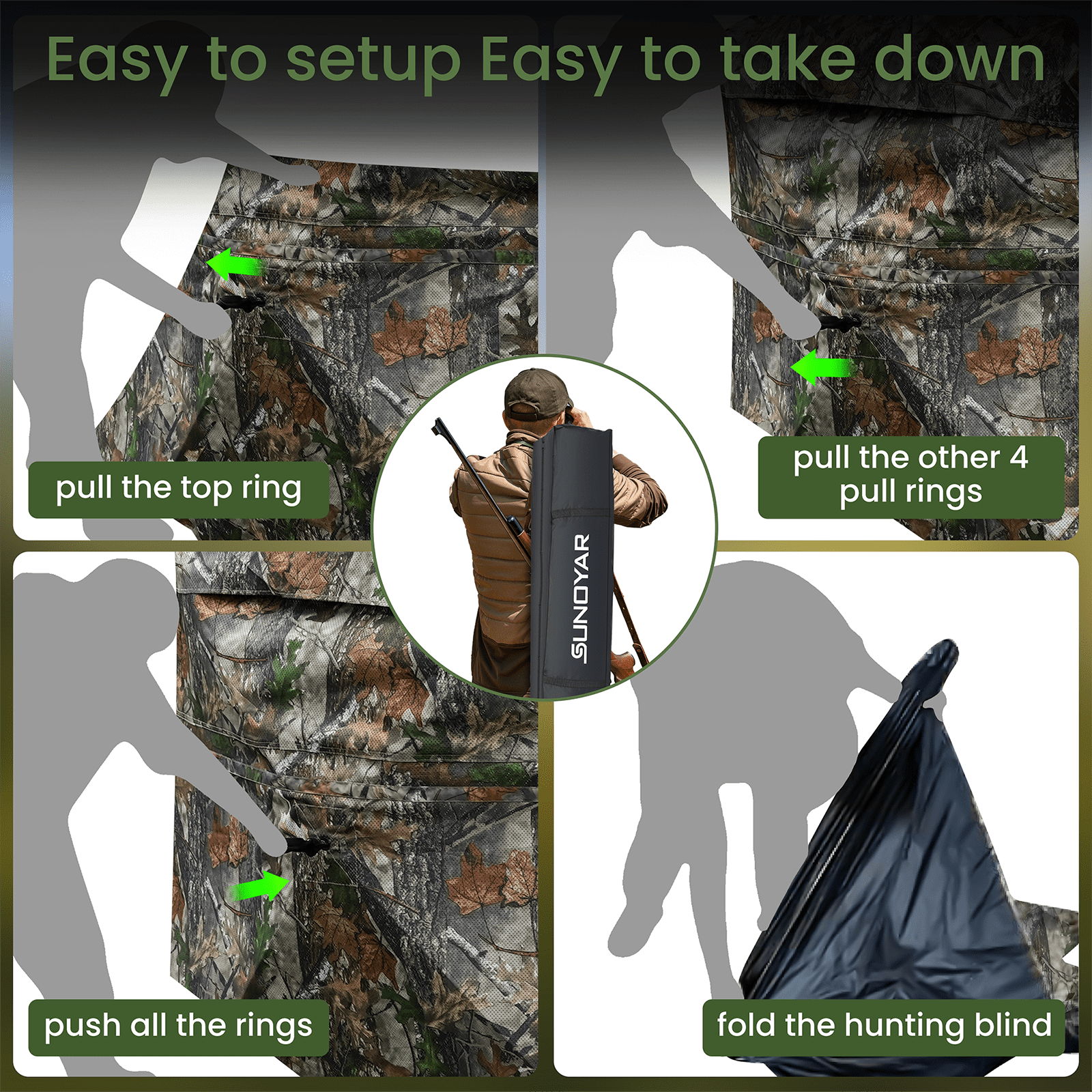 - 🐗270° See Through DesignSUNOYAR hunting blind use fabric perforation technology to achieve a 270° unidirectional see-through effect, allowing hunters to monitor a wider field of their surroundings without being seen.