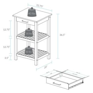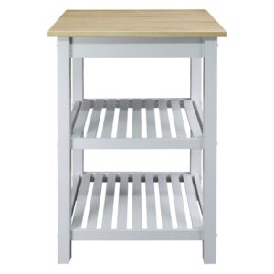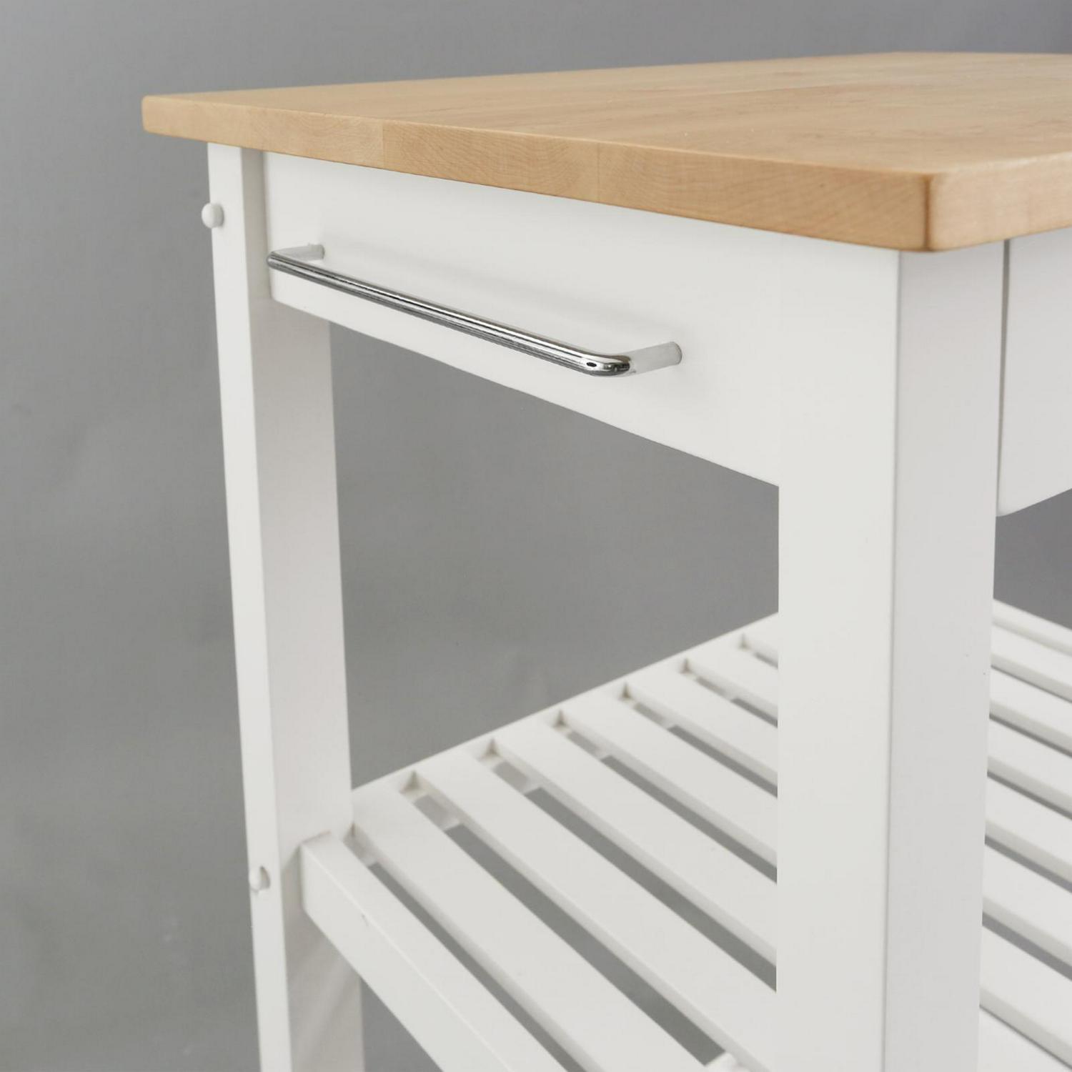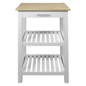 Designed for tighter spaces and those who value extra counter space, our American Trails Sunrise Kitchen Island (Small) with Solid Harvest Hardwood Top is the perfect companion to start any project in the kitchen. Its two-tone neutral color design gives it a modern appeal that highlights the natural beauty of the American Harvest Hardwood top while complementing any current home décor. The smooth sliding drawer and 2 lower slatted shelves provide plenty of space to store everyday essentials or the supplies of today’s recipe or project. The side even features a stainless steel towel rack for convenient hanging or decoration. Solid American Harvest Hardwood and solid wood construction ensure sturdy construction and years of lasting beauty that can withstand everyday use.