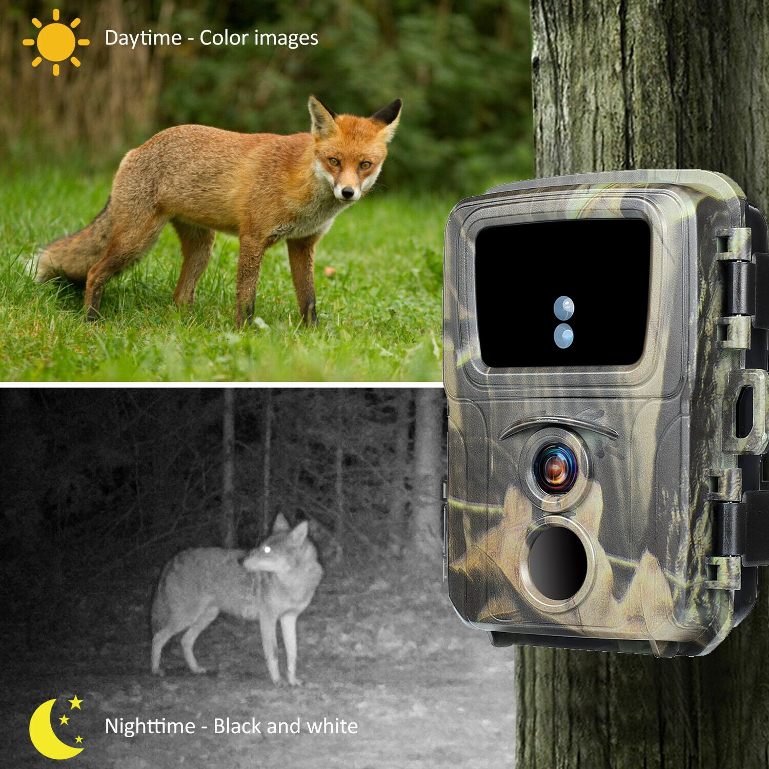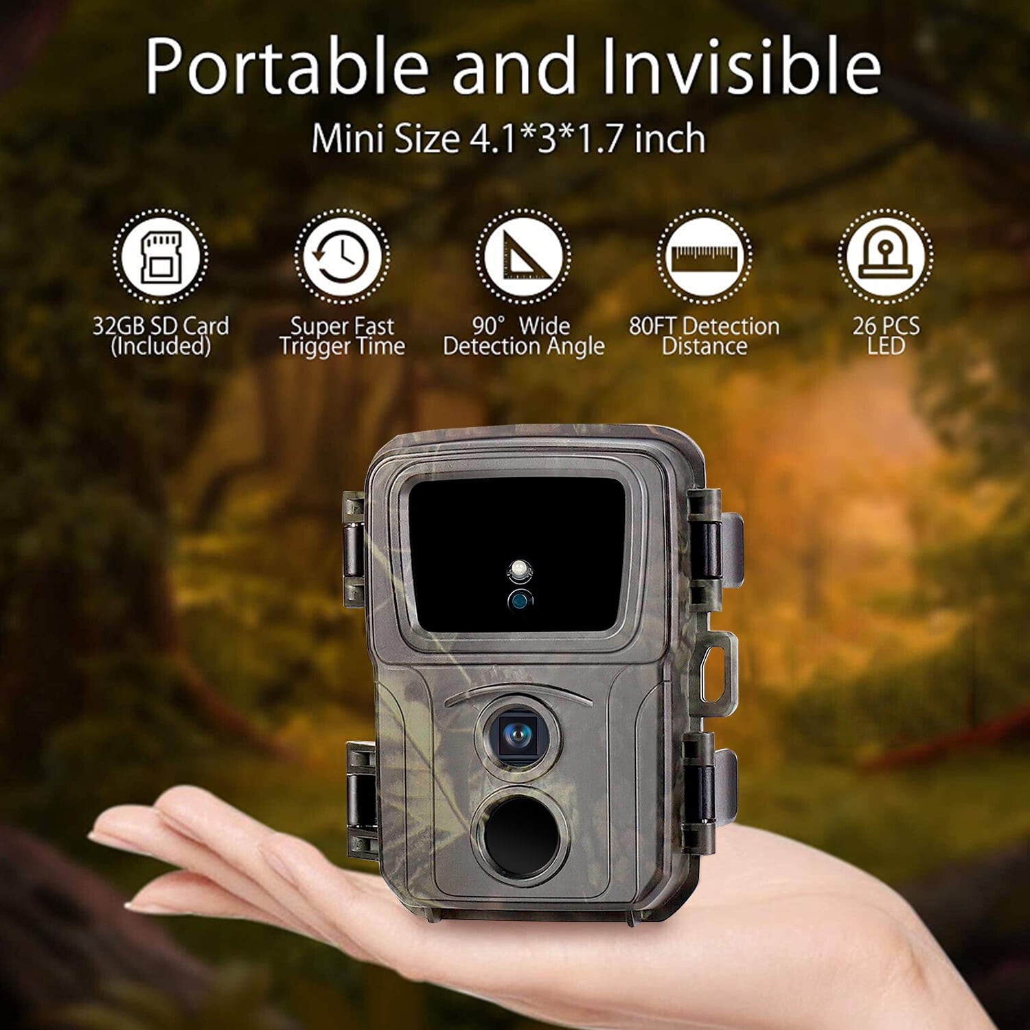 Capture the ultimate hunting experience with our mini hunting camera! This camera is designed to deliver unrivaled image and video quality, with 1080P video resolution and 24MP photo resolution. With an ultra-wide 120° field of view, this camera is perfect for capturing everything from fast-moving animals to still landscapes. Plus, with automatic capture of motion and stillness, you can trust that you won’t miss a thing. The camera has a response time of less than 0.3 seconds, allowing you to capture images and videos quickly and easily. All photos and videos are time-stamped so you can easily track when each photo was taken. The 2.0-inch TFT even allows you to use it as a normal camera! In addition, the camera can support up to 256GB SD card (32GB SD card included), uses four AA batteries (battery not included), mini size and camouflage camouflage can make you not alert the target at any time, and the bundled The belt is convenient for you to fix it anywhere, this is the perfect partner for hunting season! Comes with a user manual, which can be used by novices to learn and use quickly!